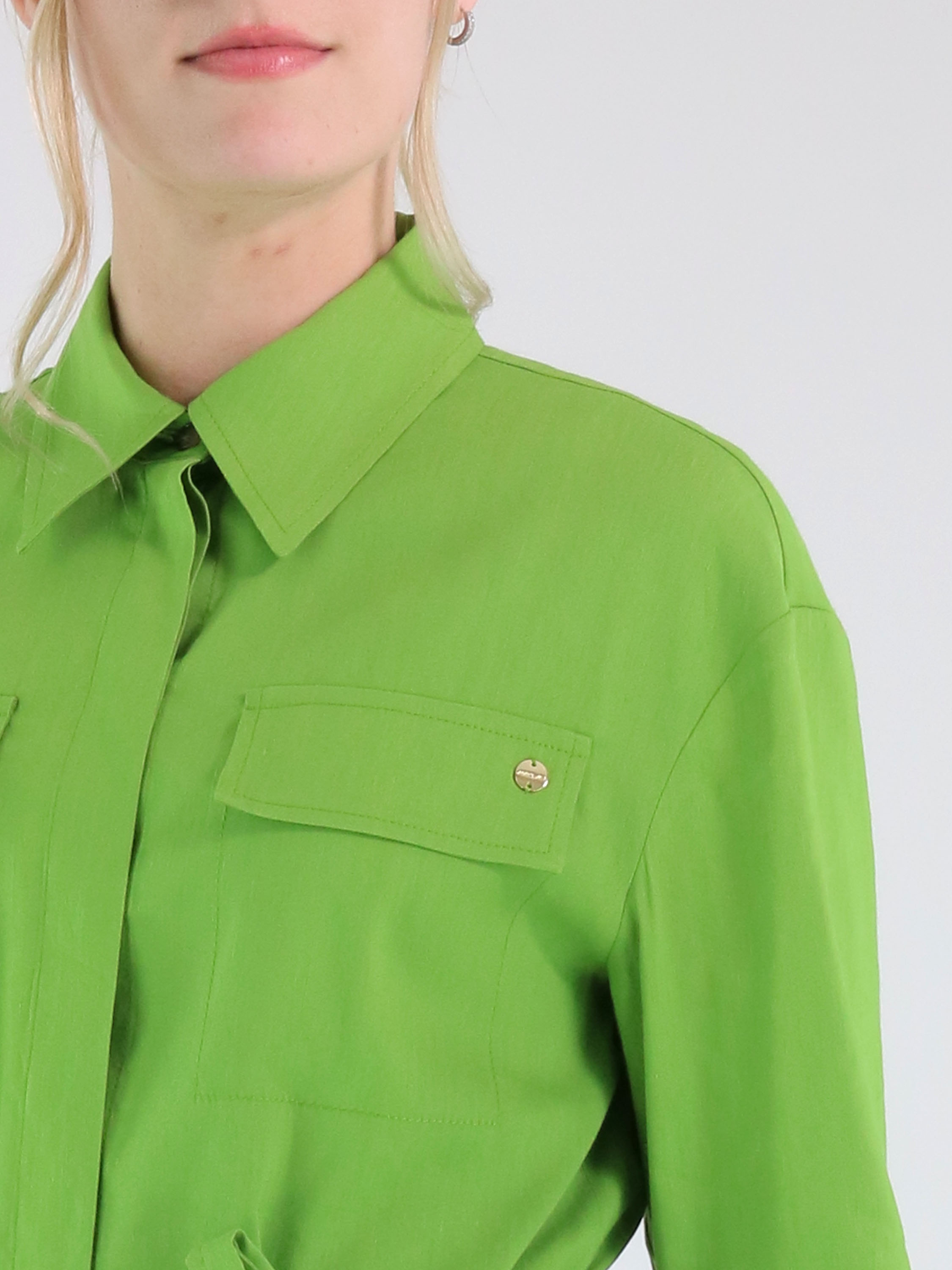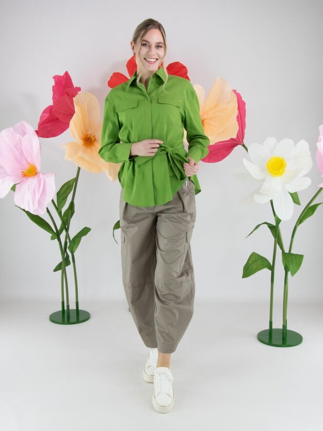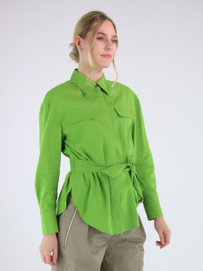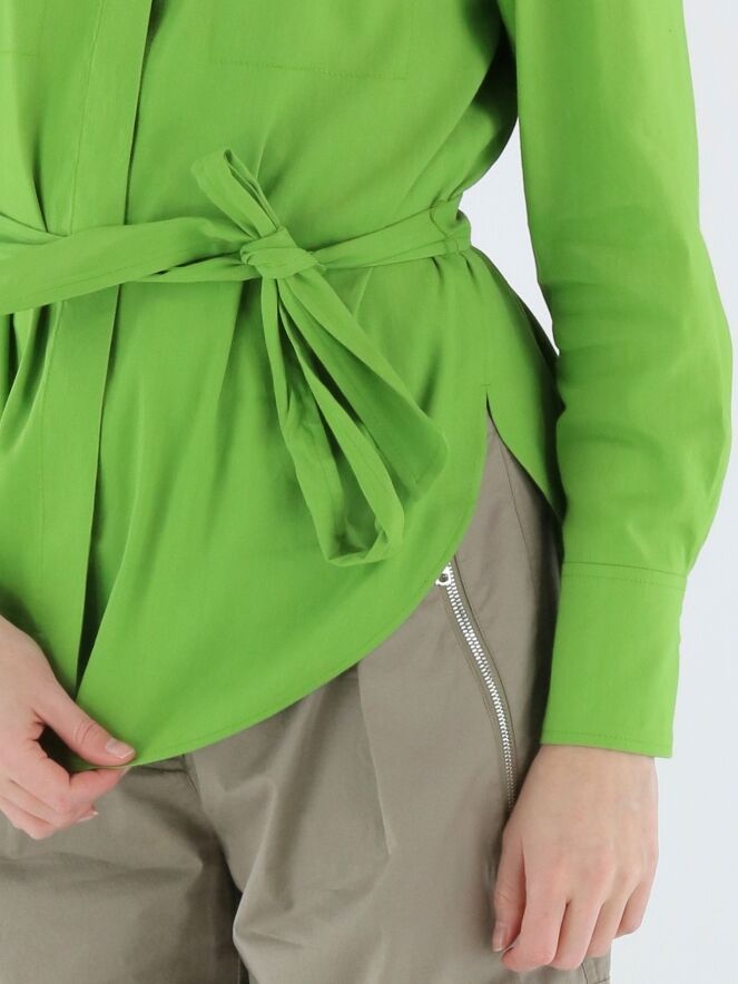 Blouse longue de Marc Cain dans une teinte vert fraîche. Une ceinture assortie à la taille souligne élégamment la silhouette. Des rabats de poches décoratifs au niveau de la poitrine apportent une touche raffinée. Au dos, deux plis centraux à hauteur des omoplates offrent aisance et belle fluidité. La blouse est dotée d’une fermeture boutonnée dissimulée et d’un ourlet arrondi vers les côtés. Cette blouse peut être lavée à 30 degrés.