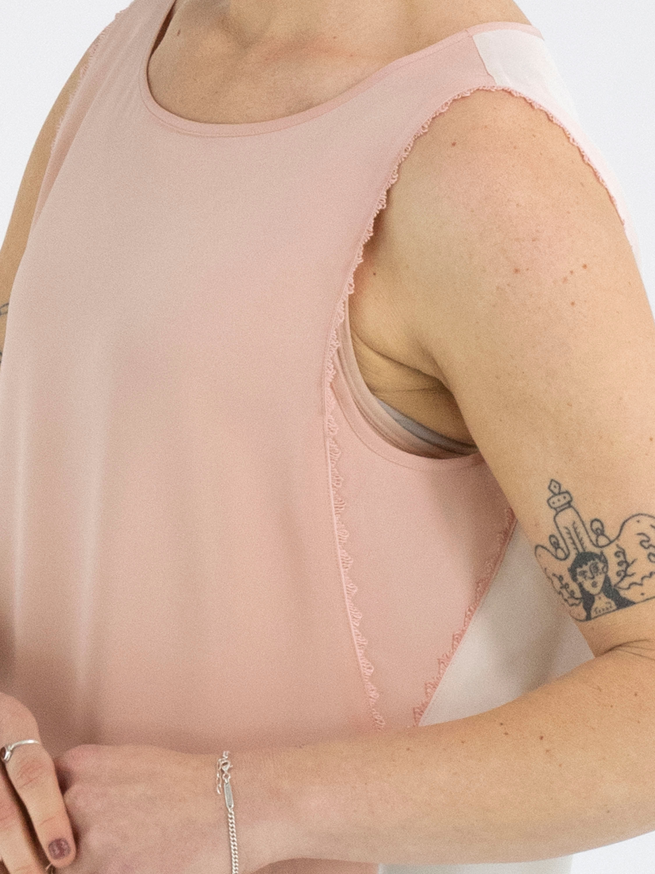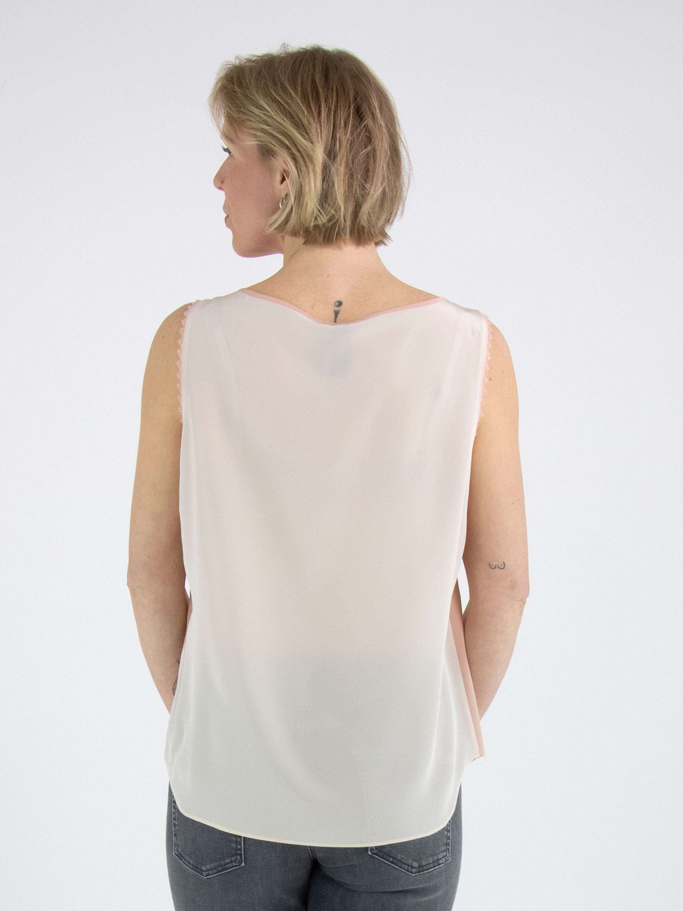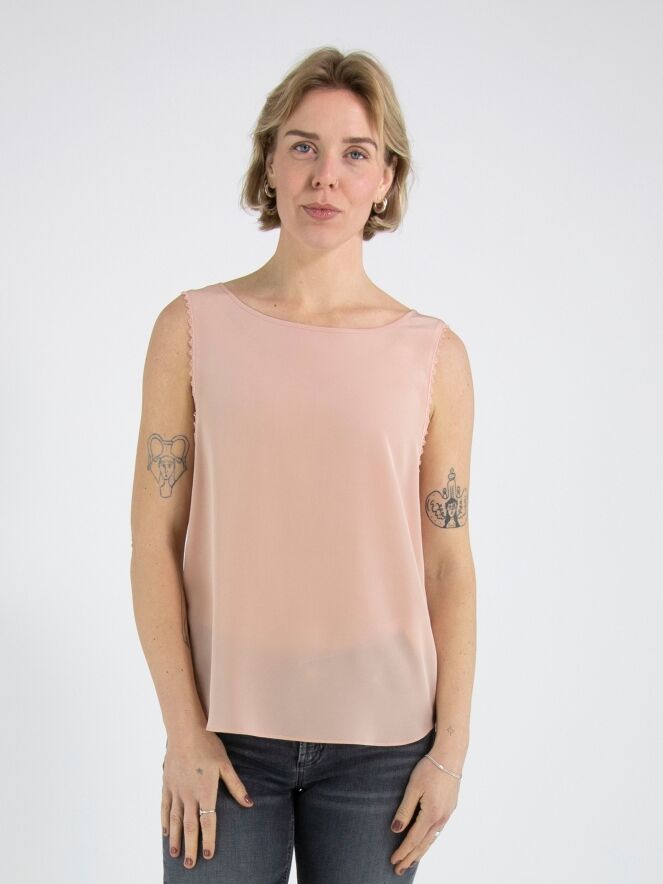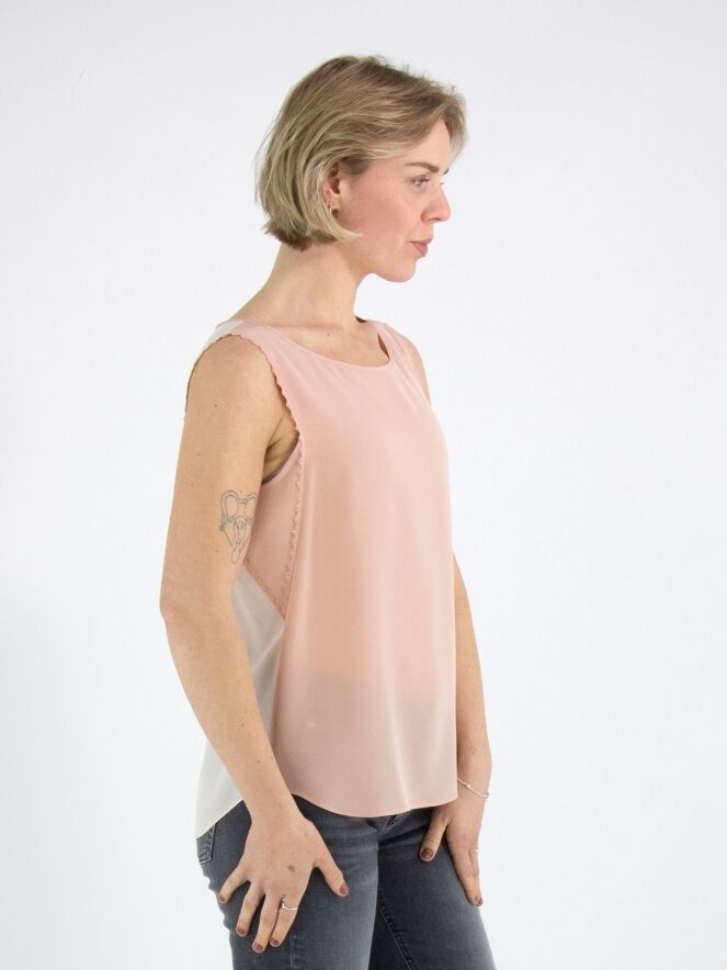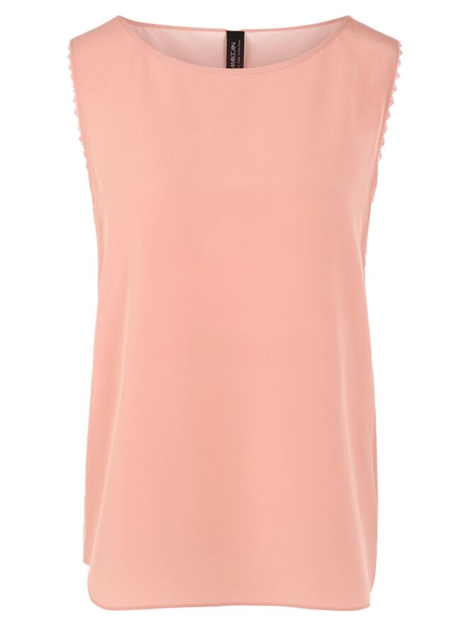 Un haut de Marc Cain avec un devant rose saumon et un dos couleur nude. Le long des bords aux emmanchures se trouve un passepoil ondulé. Le haut possède une encolure ronde et peut être lavé à la main.