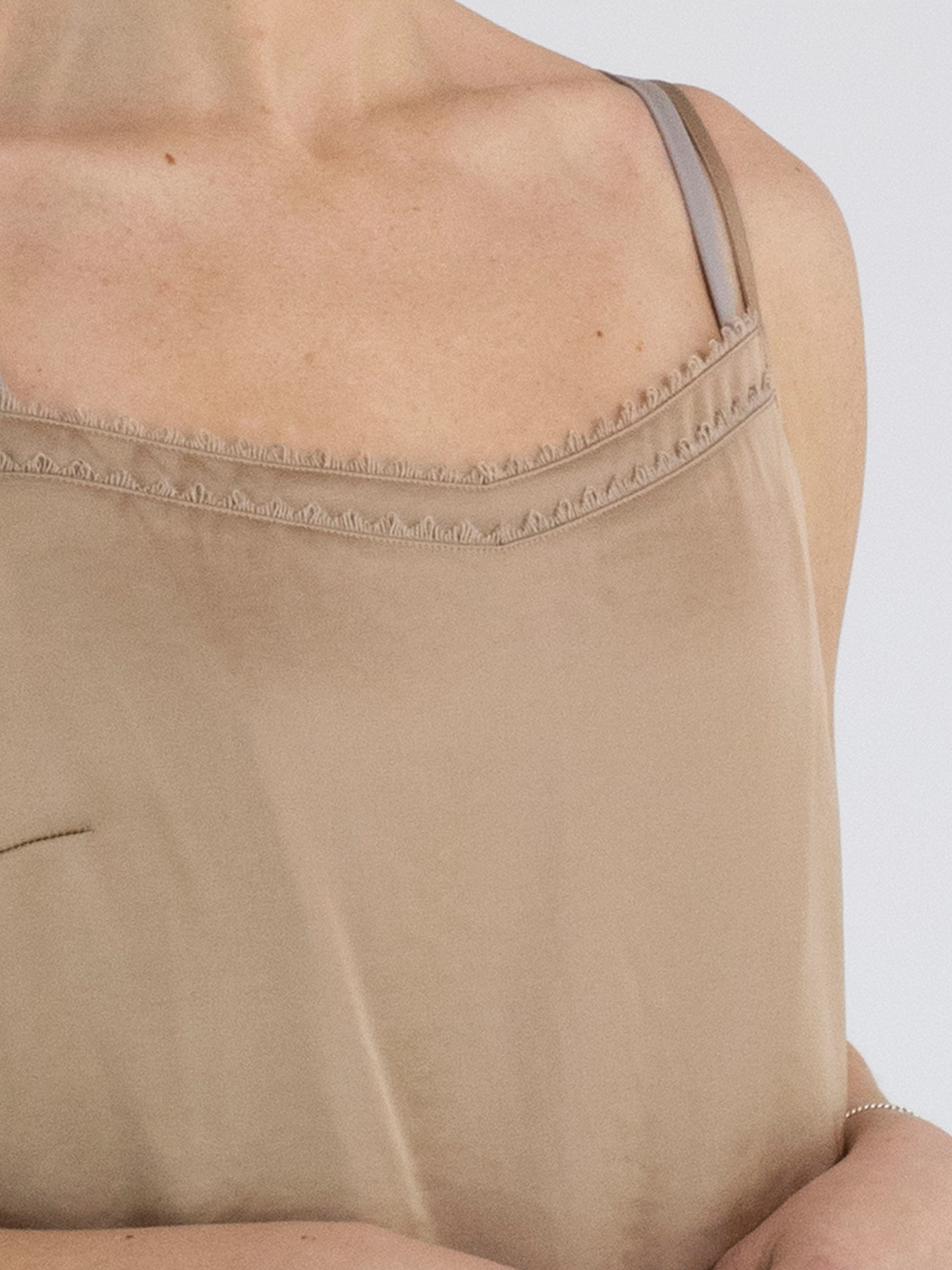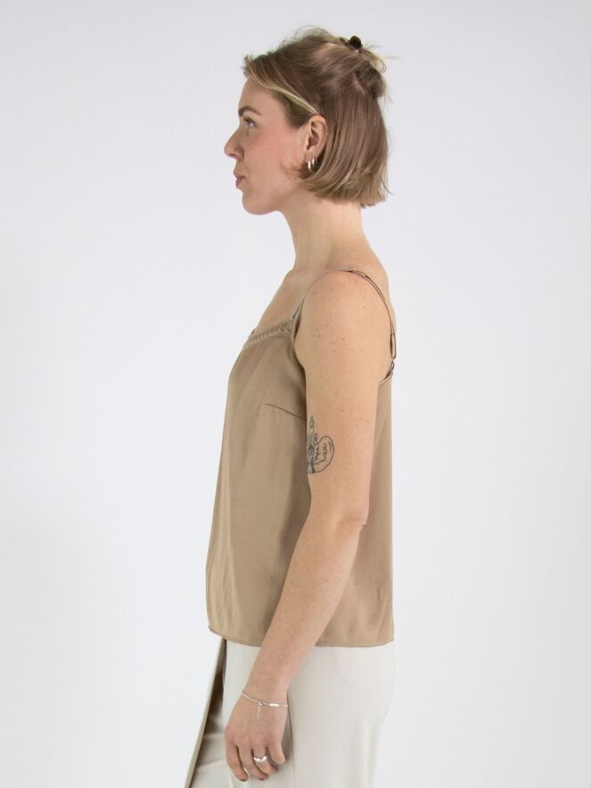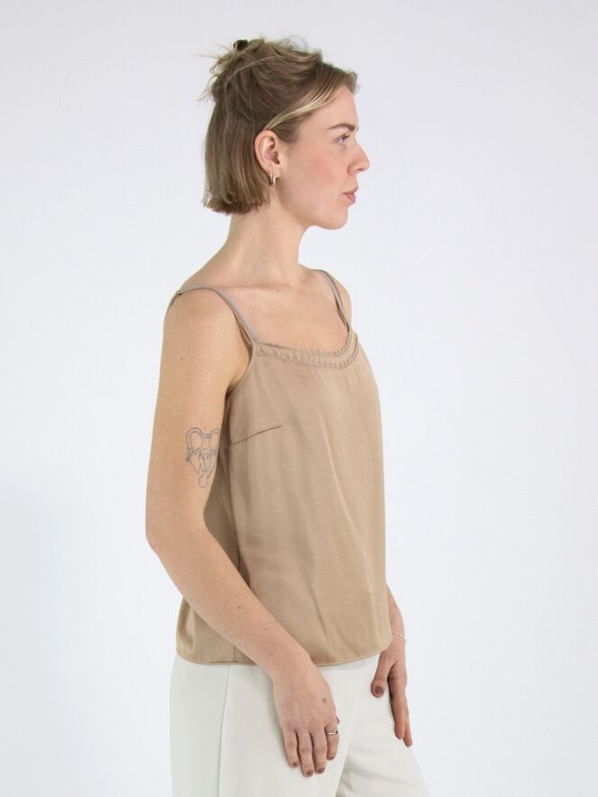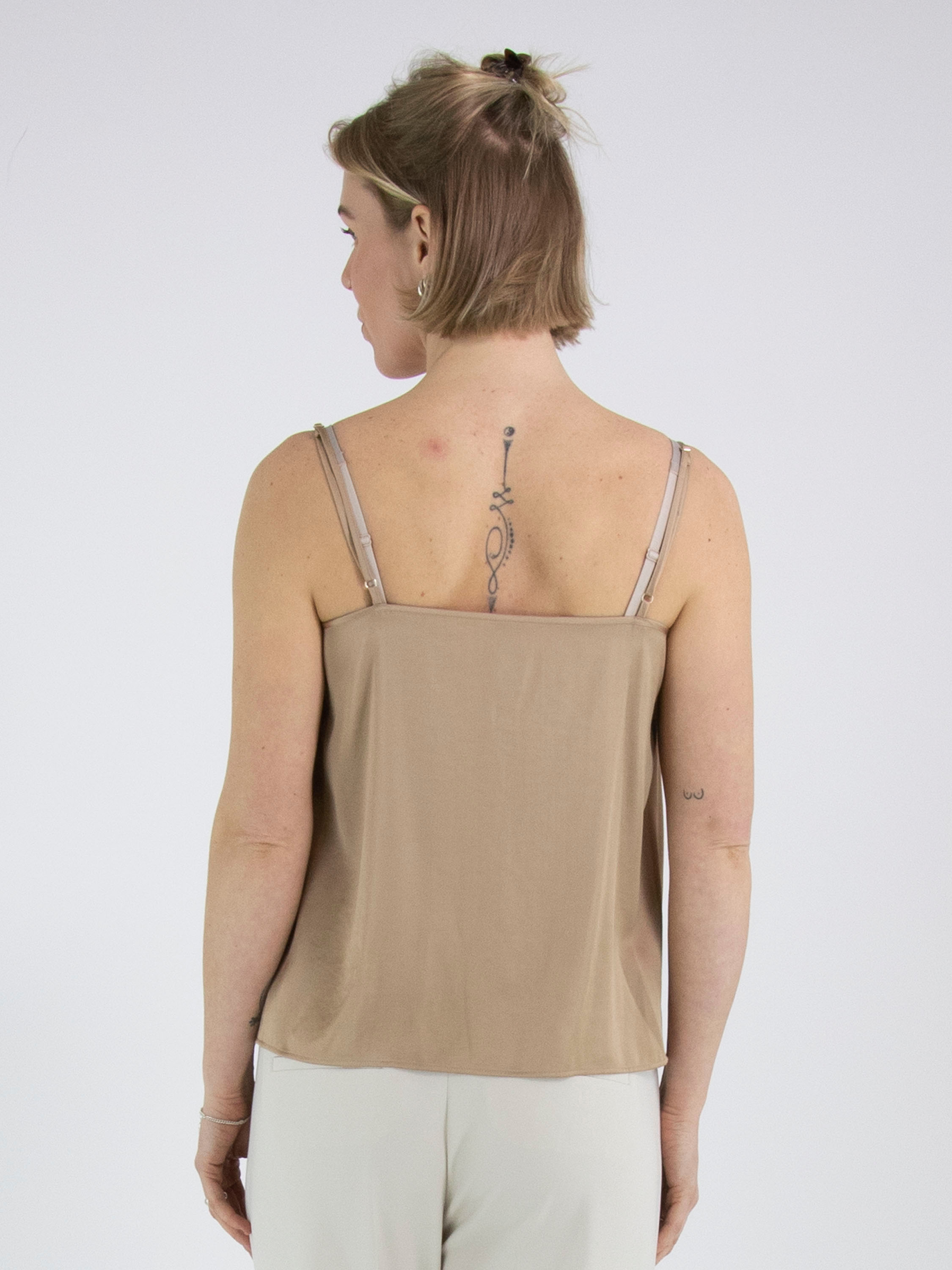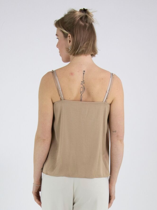 Un haut de Marc Cain en tissu satiné mat couleur taupe. Le haut possède des bretelles spaghetti réglables et une double bordure le long du bord avant. Ce haut peut être lavé à 30 degrés.