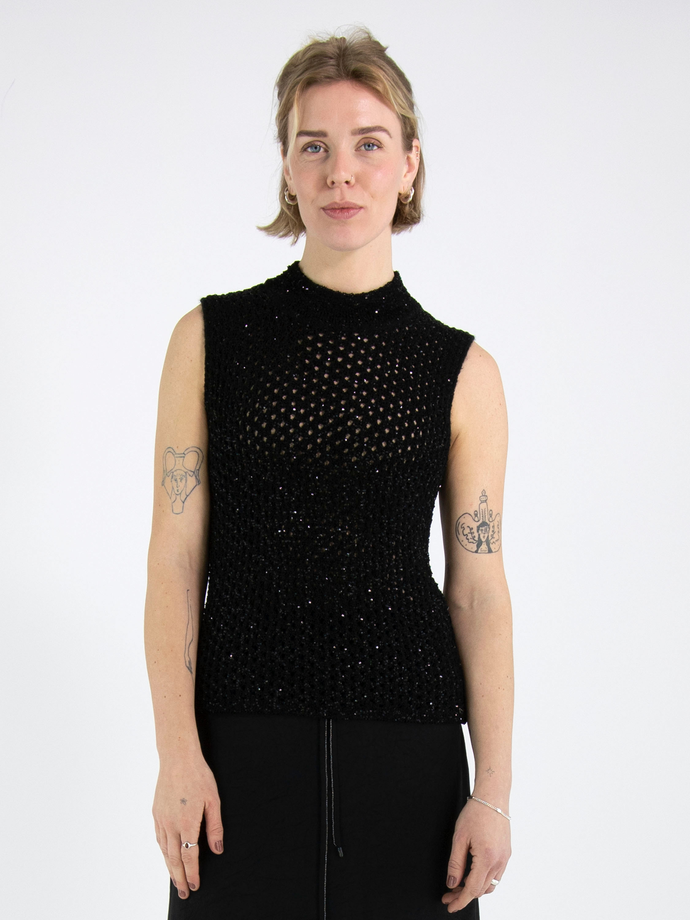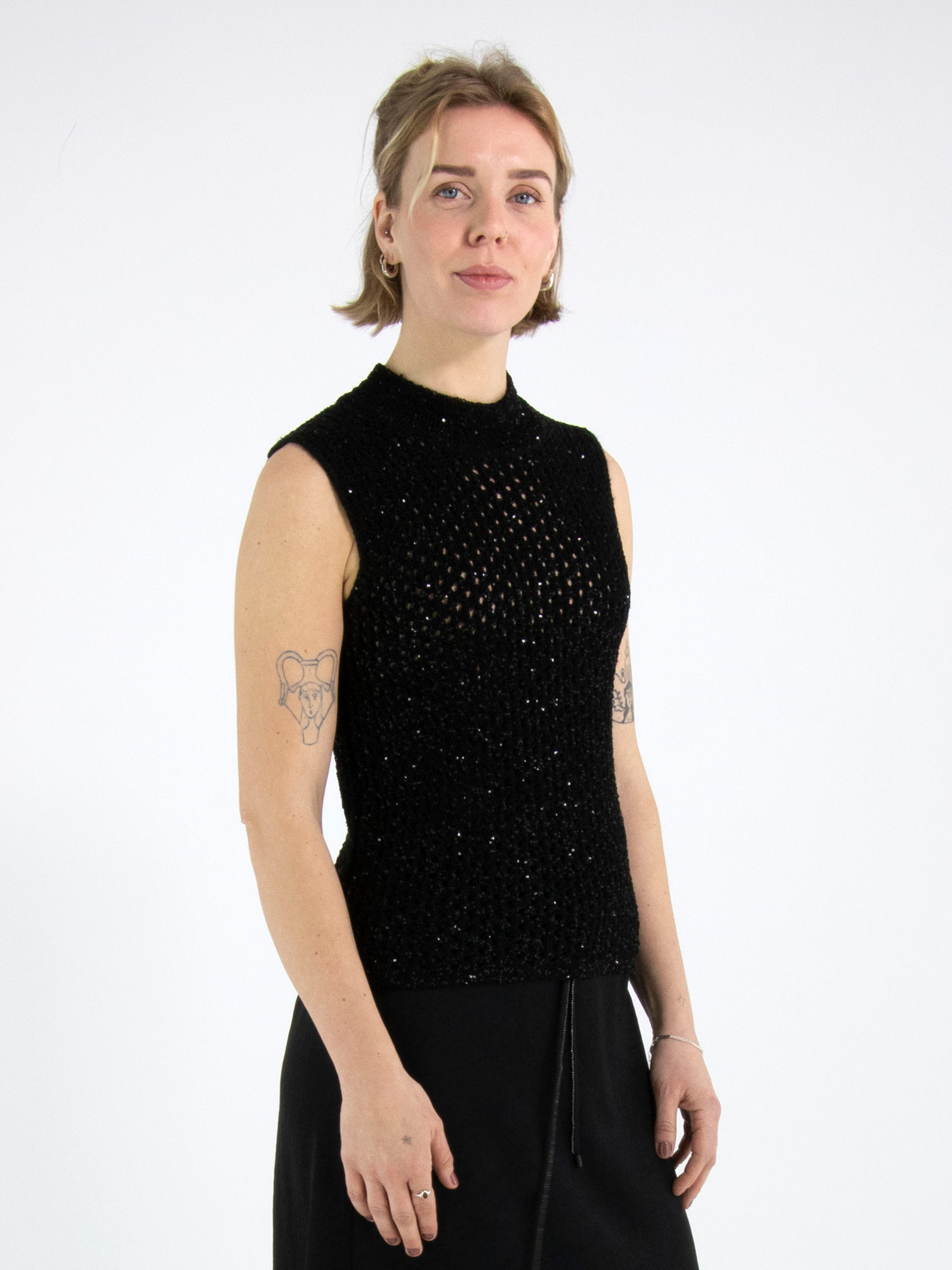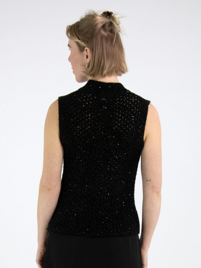 Un débardeur en maille ajourée de Marc Cain en noir. Des paillettes noires sont tissées dans la matière. Le débardeur possède un col cheminée et peut être lavé à la main.
