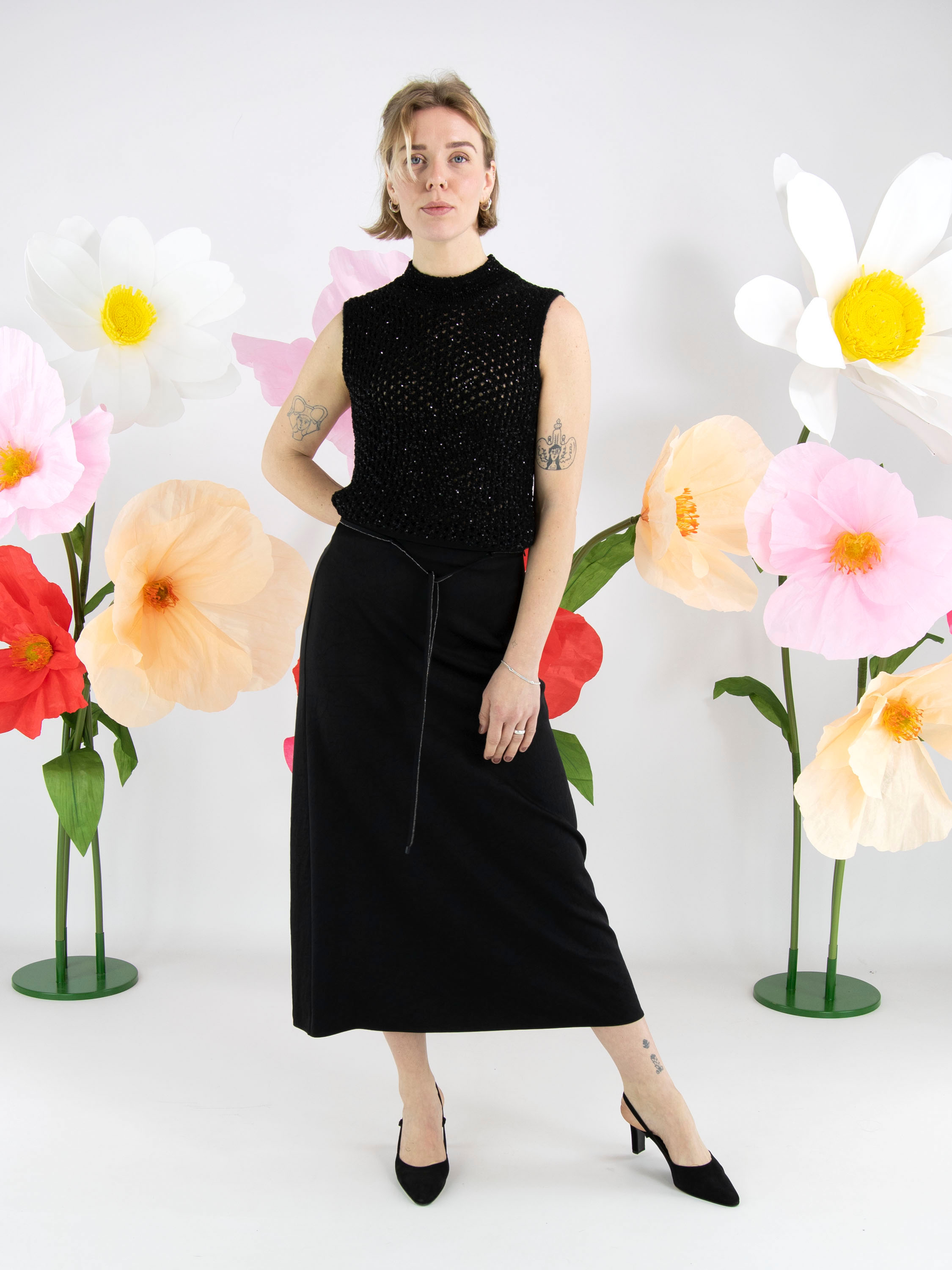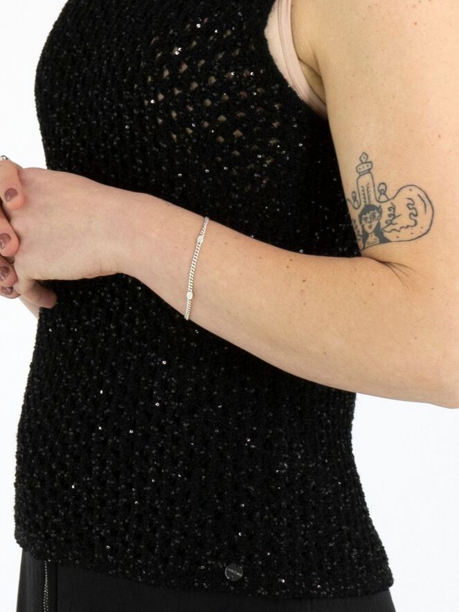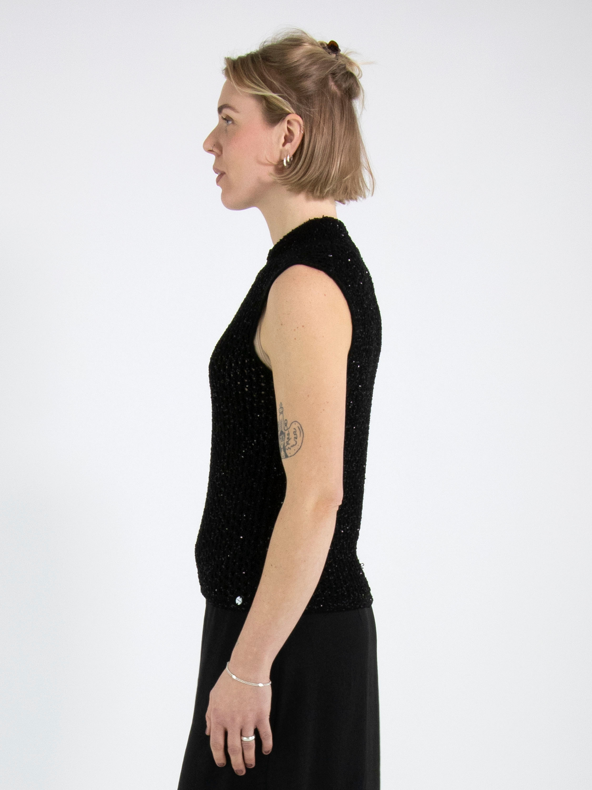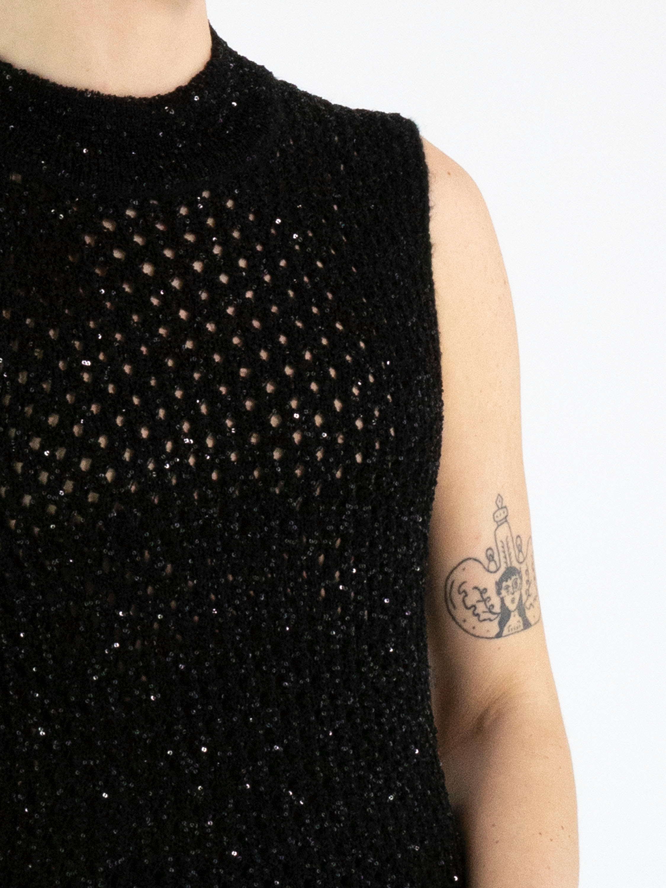 Un débardeur en maille ajourée de Marc Cain en noir. Des paillettes noires sont tissées dans la matière. Le débardeur possède un col cheminée et peut être lavé à la main.