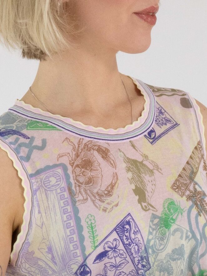 Un top légèrement transparent de Marc Cain avec un imprimé tampon dans plusieurs tons pastel tels que le jaune, le vert et le bleu sur un fond rose. Le long de l’encolure ronde et des emmanchures se trouve un liseré ondulé en tricot finement côtelé, à motif rayé dans les tons jaune et rose. Ce top peut être lavé à 30 degrés.