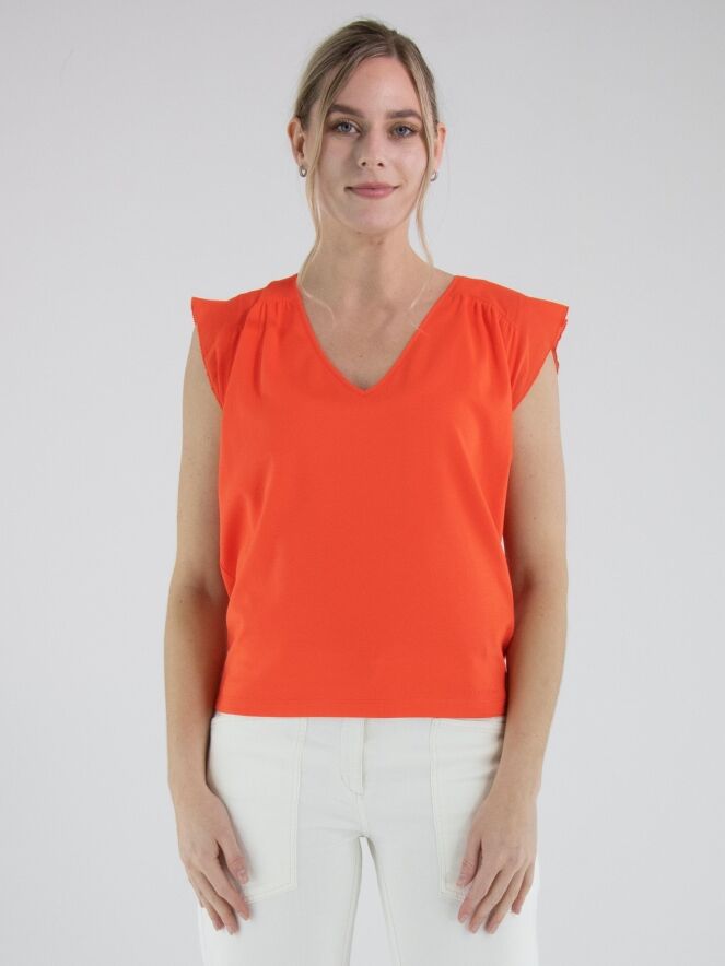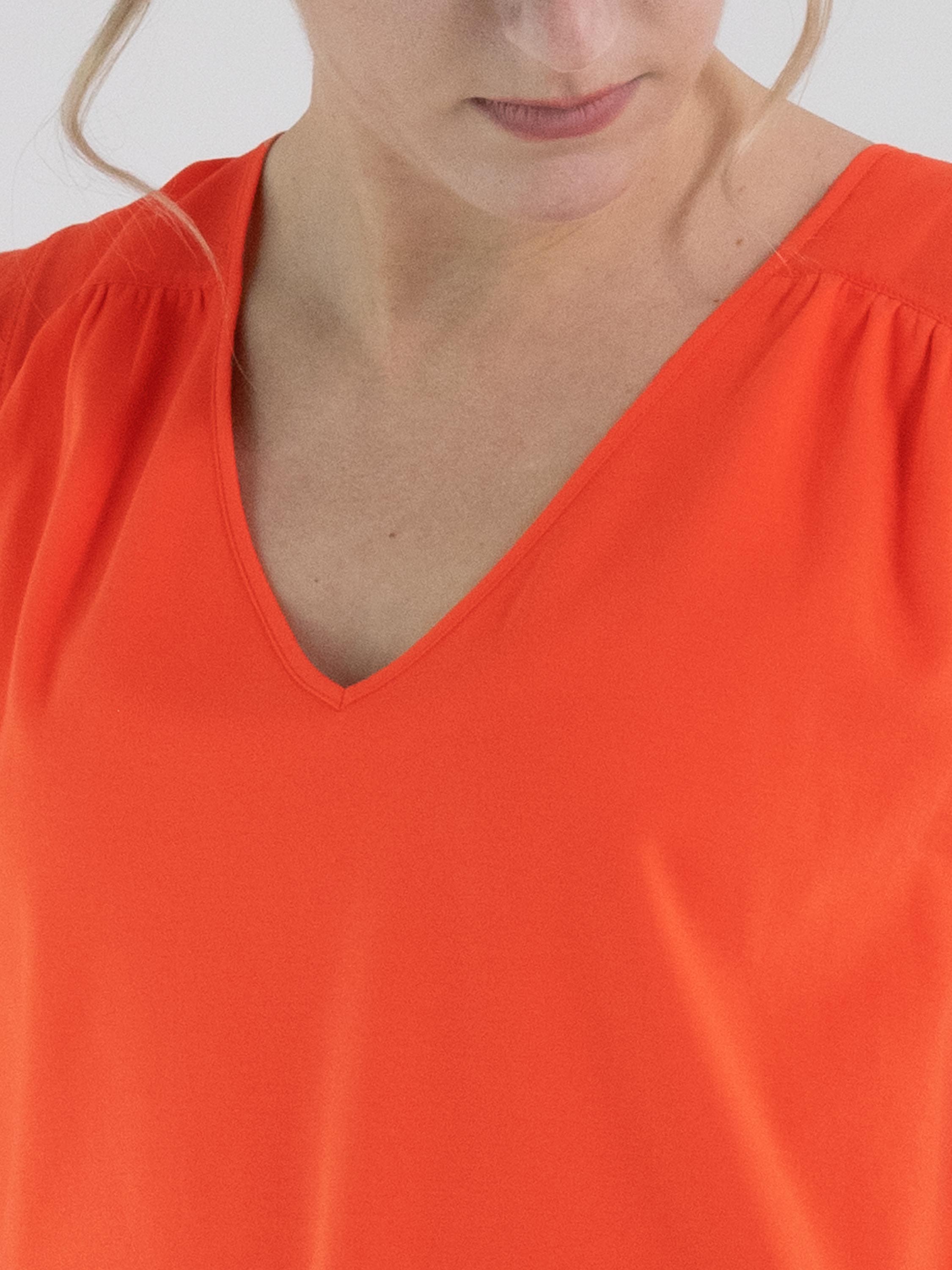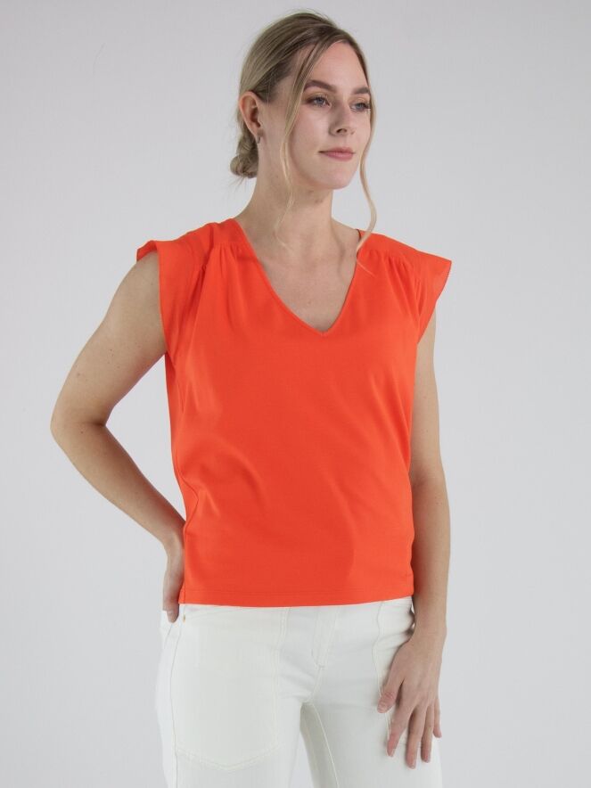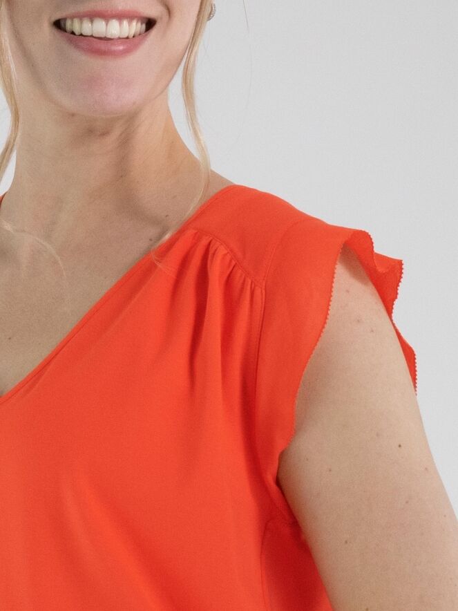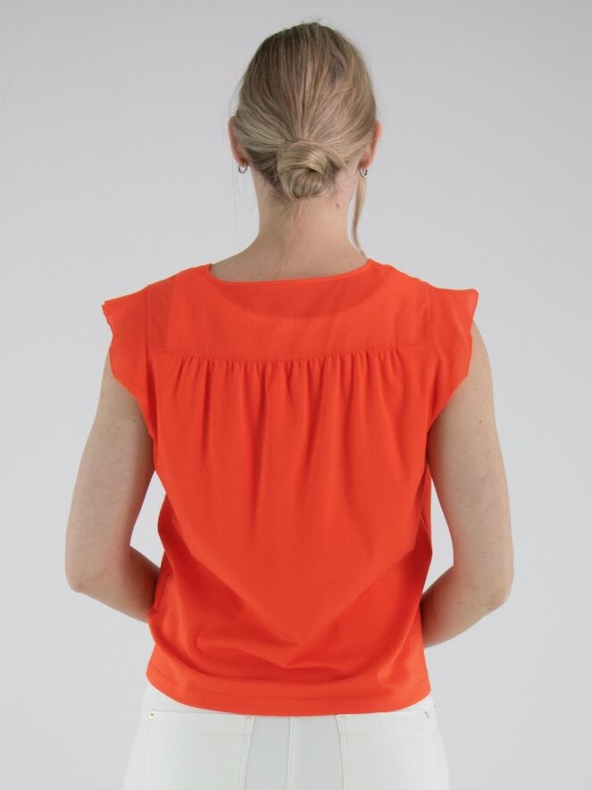 Top de Marc Cain dans une teinte corail intense. Doté d’un col en V, il présente un galon aux bords délicatement festonnés le long des emmanchures, apportant une touche féminine et raffinée. Le tissu est finement froncé au niveau des coutures des épaules, créant une tombée élégante et souple. Ce top peut être lavé à 30 degrés.