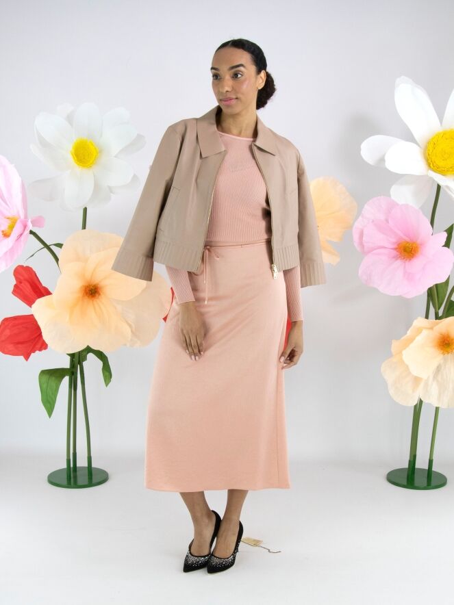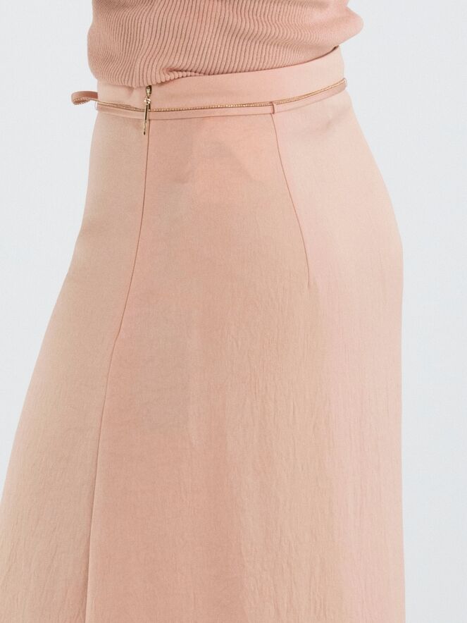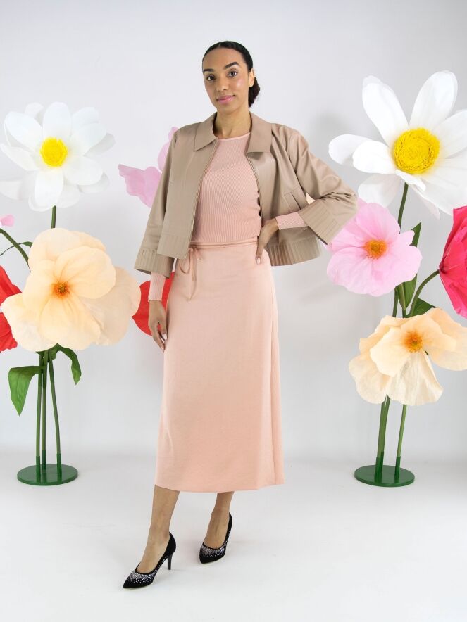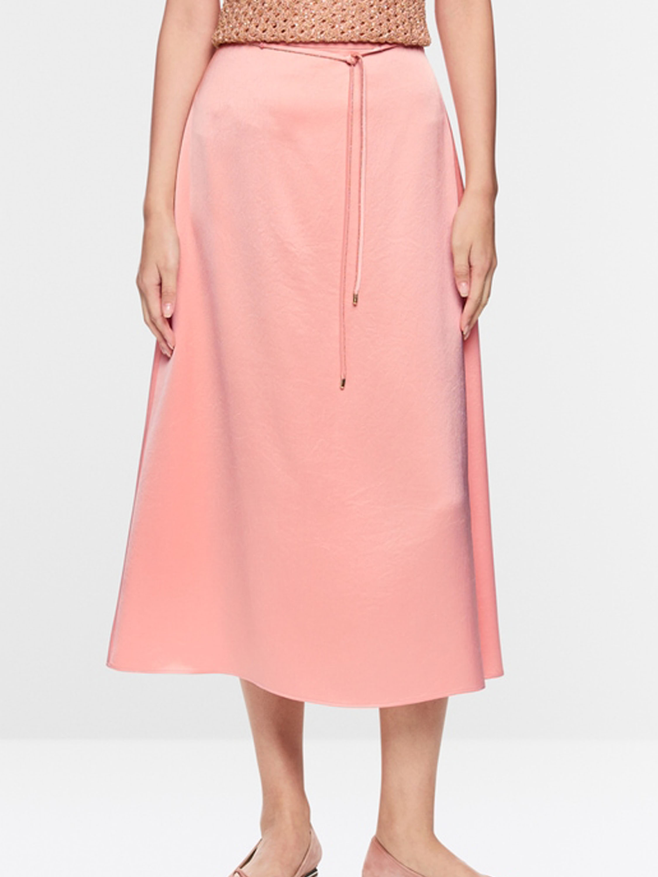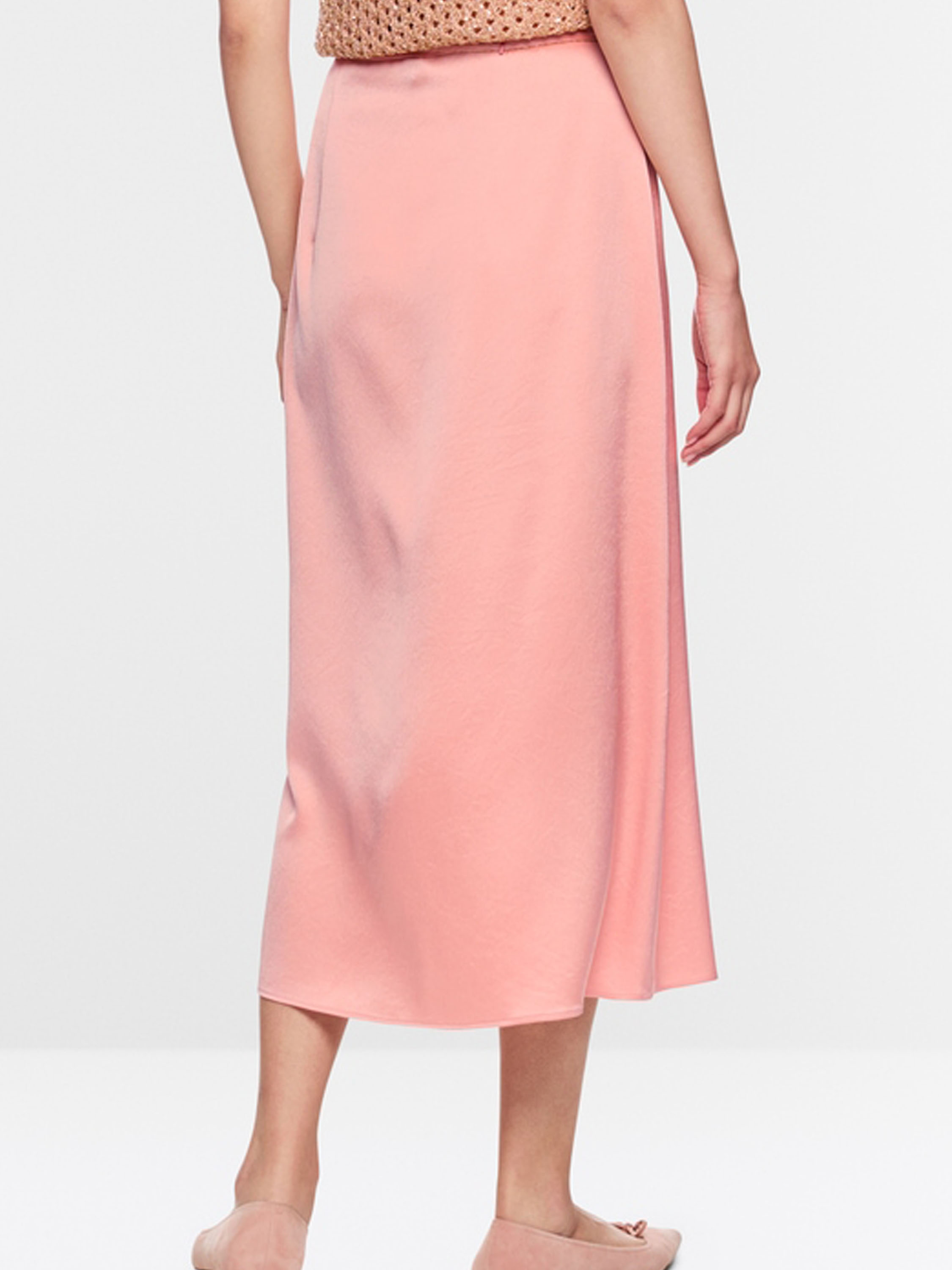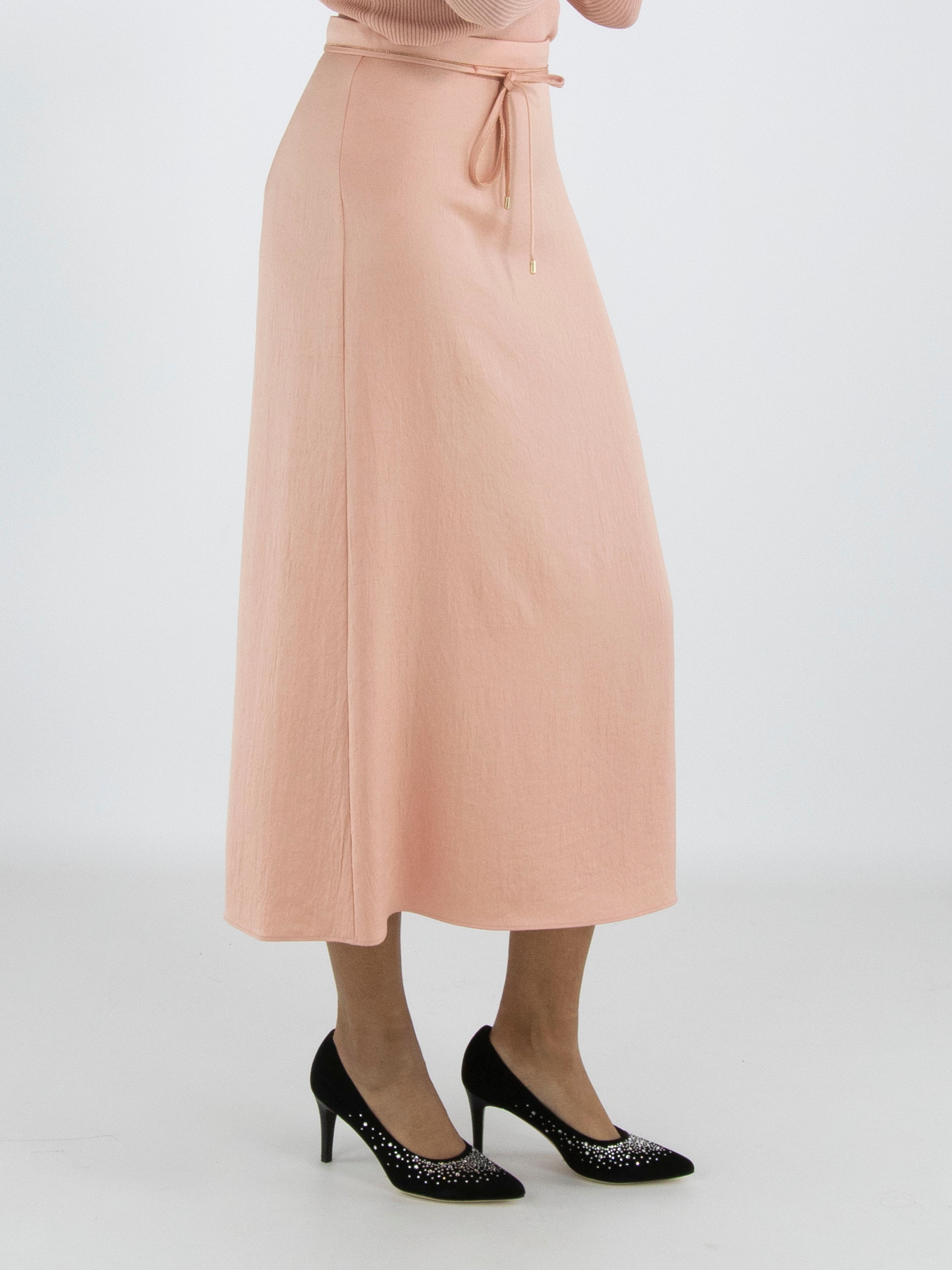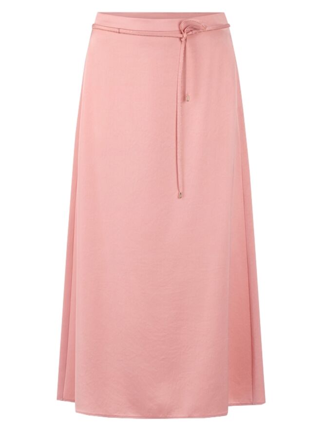 Une jupe longue de Marc Cain en tissu satiné mat de couleur rose saumon. À la taille se trouve une ceinture en ruban dans la même matière, bordée d’un liseré cranté provenant d’une fermeture éclair. Cette jupe peut être lavée à 30 degrés.