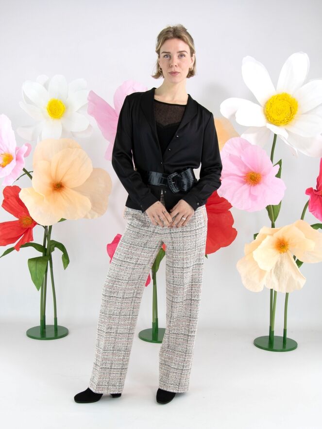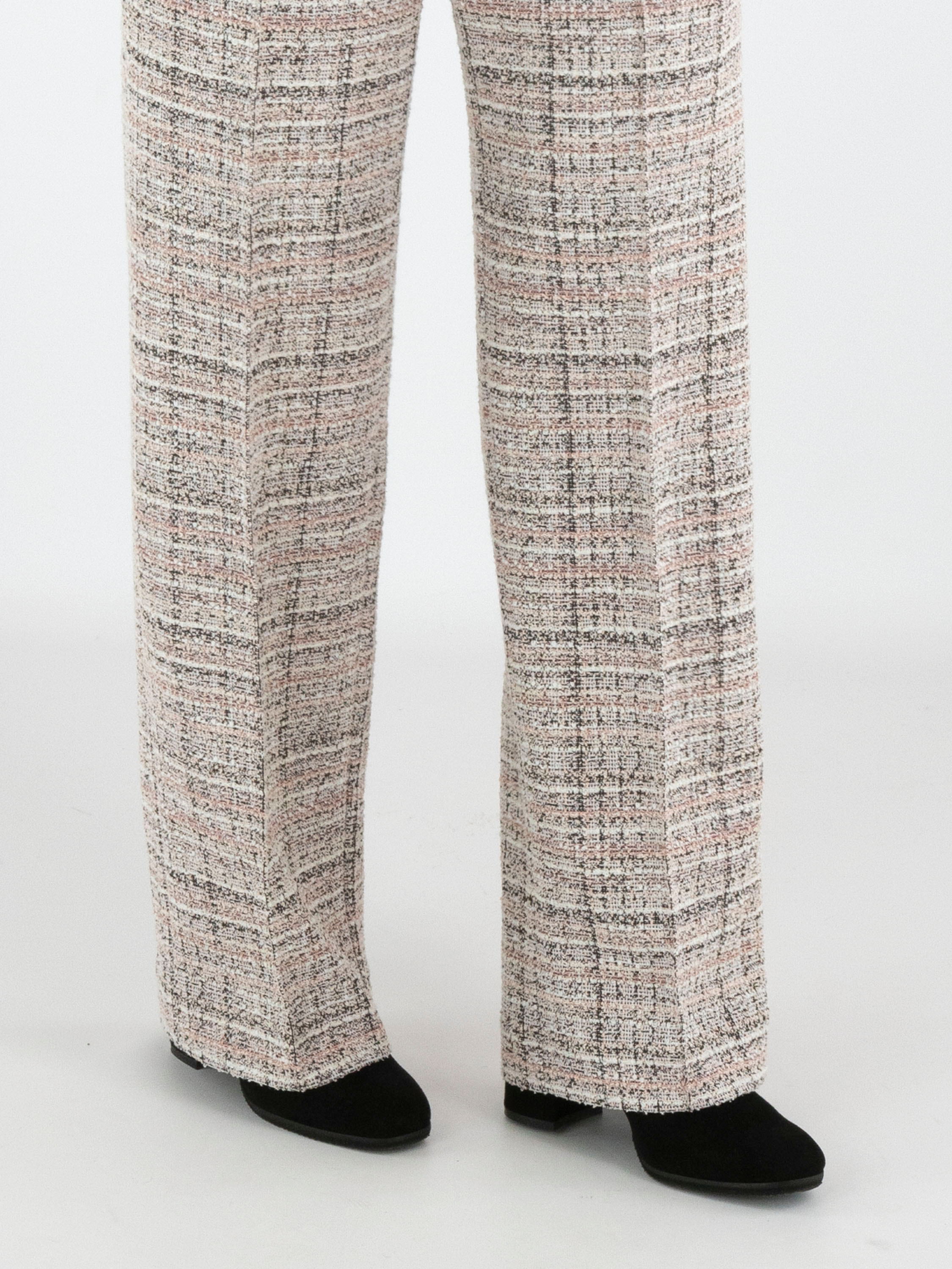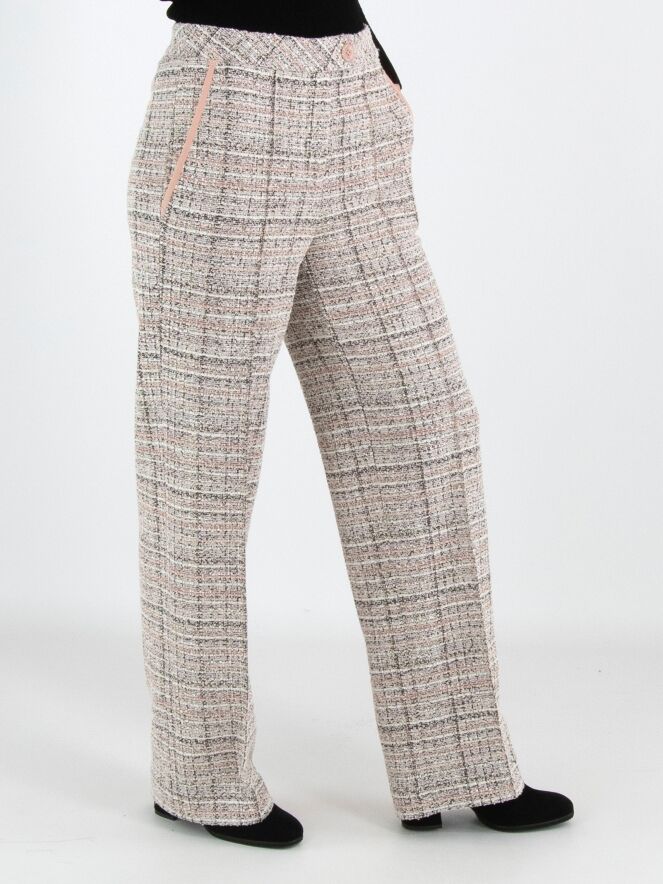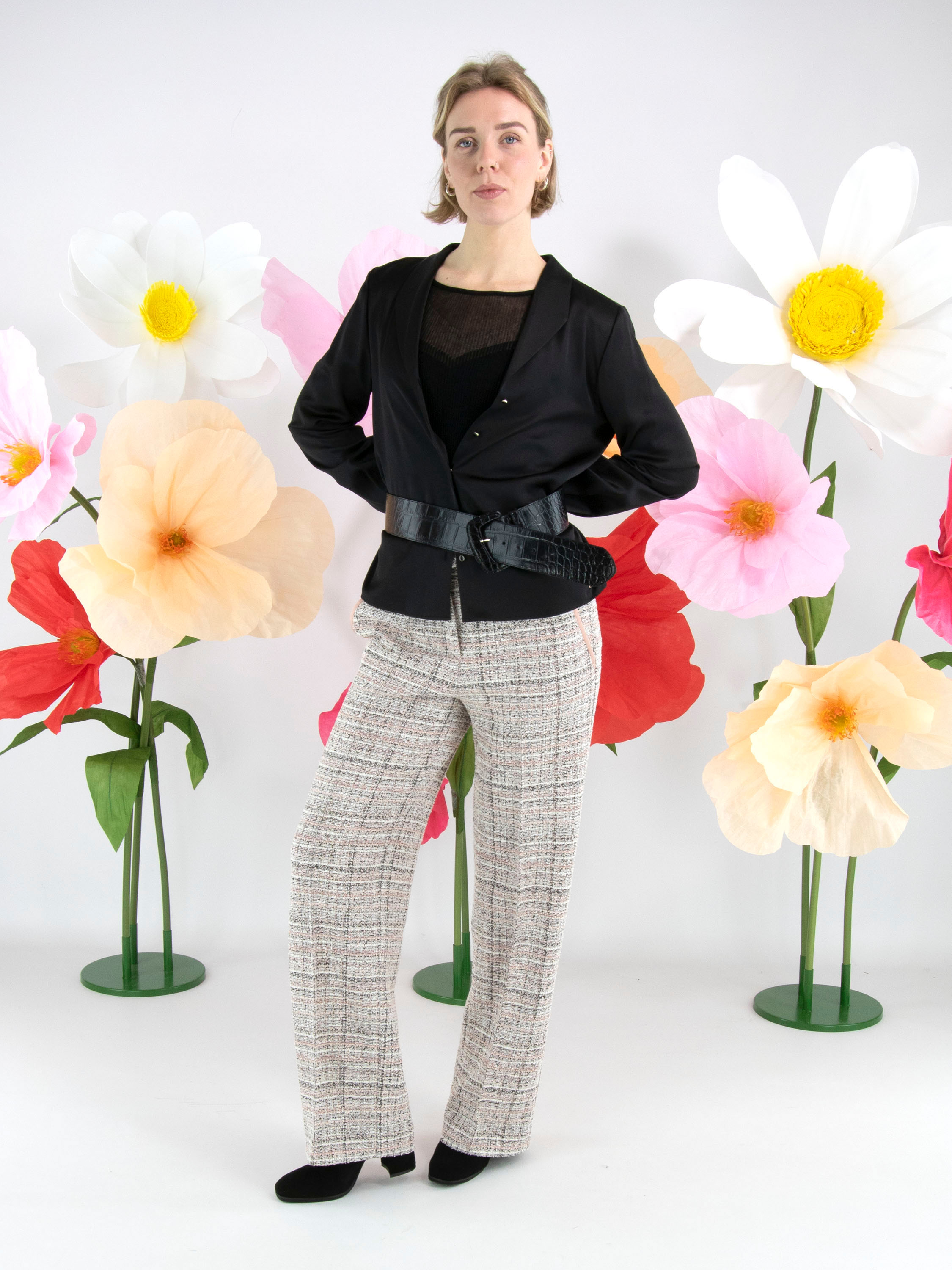 Un pantalon à l’allure tweed dans les tons rose saumon, blanc cassé, nude et noir. Les bords des poches fendues sont soulignés d’un liseré en satin mat rose saumon. Une couture inversée traverse le centre des jambes. Ce pantalon ne doit pas être lavé.