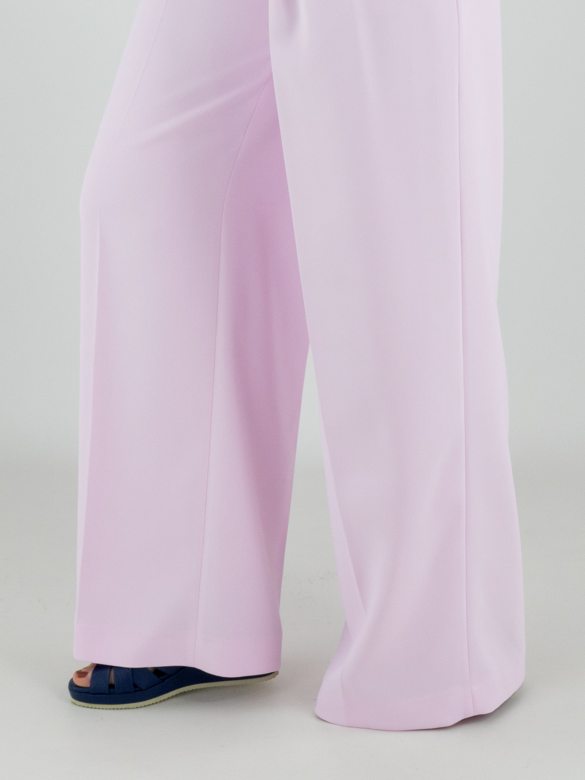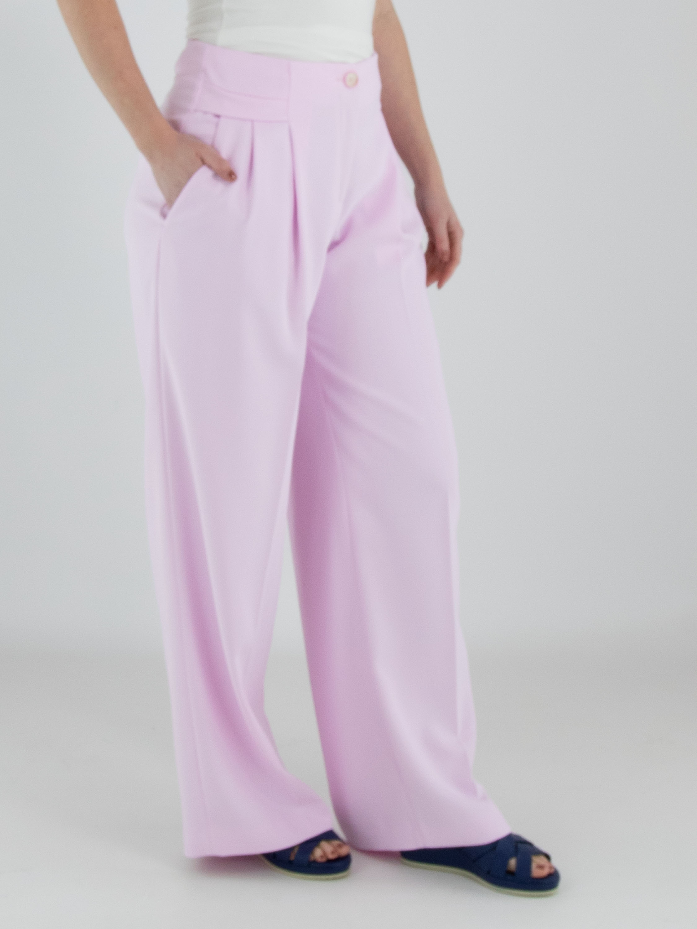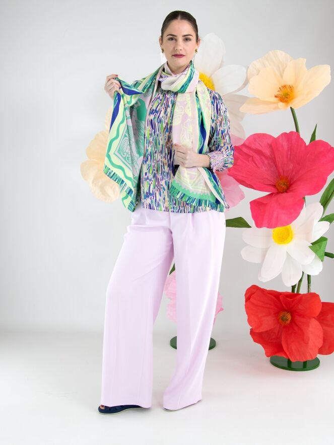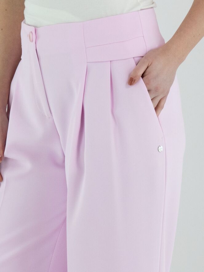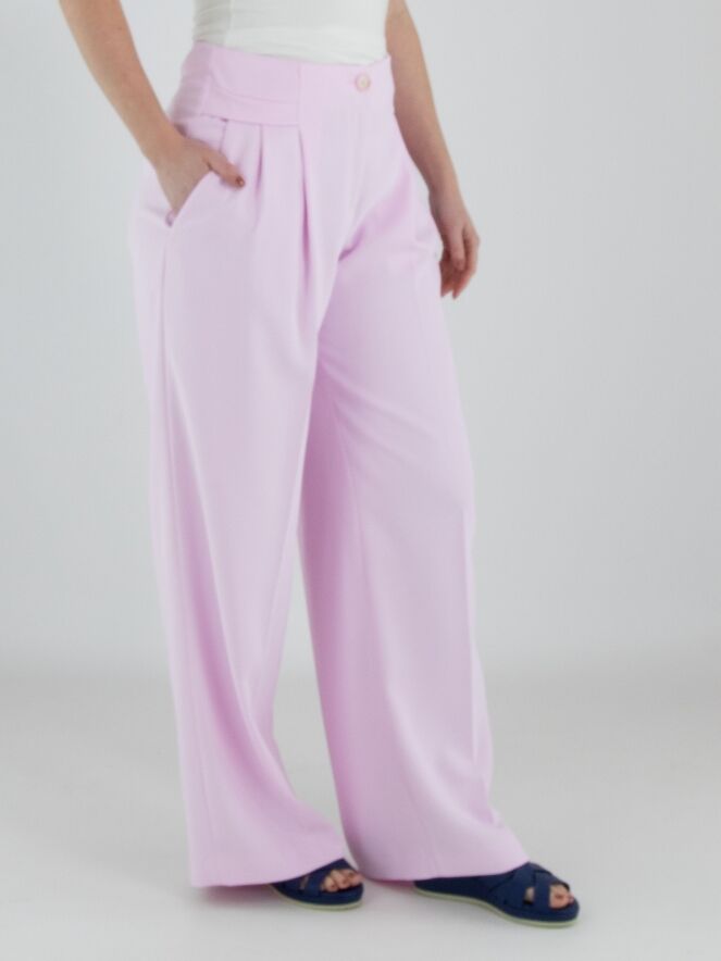 Un pantalon de Marc Cain dans une teinte rose vif. De chaque côté de la taille, une double ceinture est travaillée, sous laquelle se trouvent deux plis plats. Un pli marqué descend au centre des jambes. Le pantalon possède des poches latérales et peut être lavé à 30 degrés.
