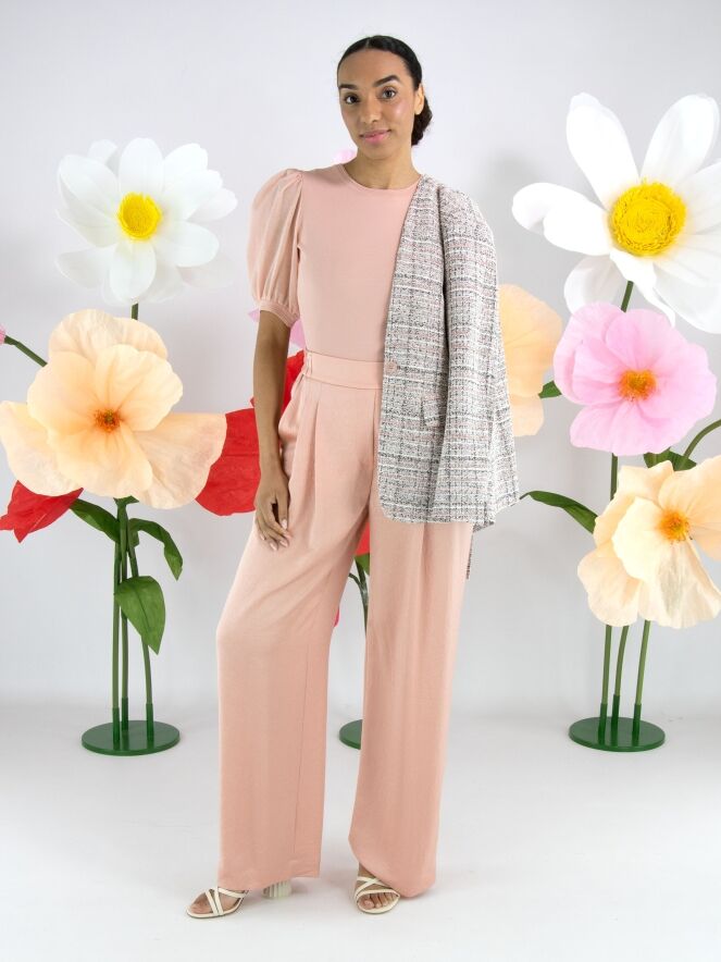 Un pantalon de Marc Cain en rose pastel. Le tissu est légèrement satiné et présente un imprimé reptile ton sur ton. Sur les côtés jusqu’au dos, la taille est finement plissée et élastiquée. À l’avant, quelques plis sont orientés vers l’extérieur. Le pantalon possède des poches fendues et peut être lavé à 30 degrés.