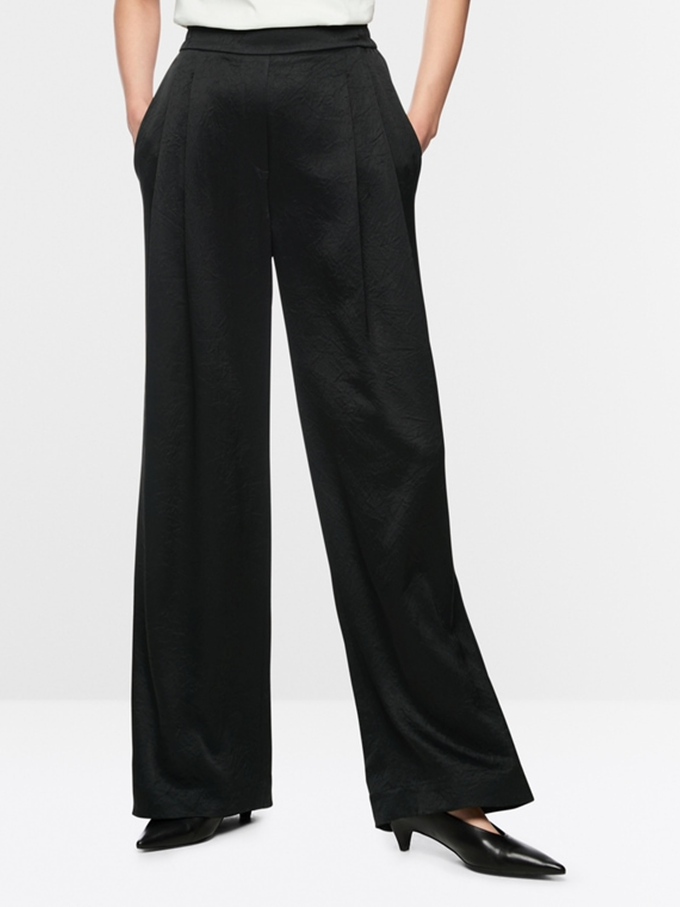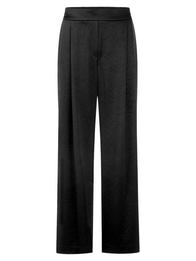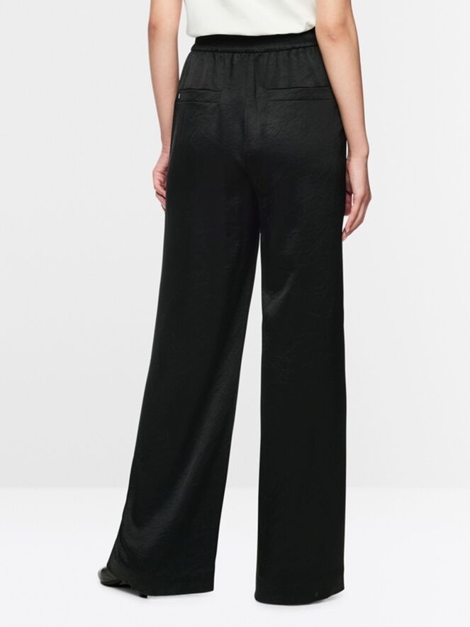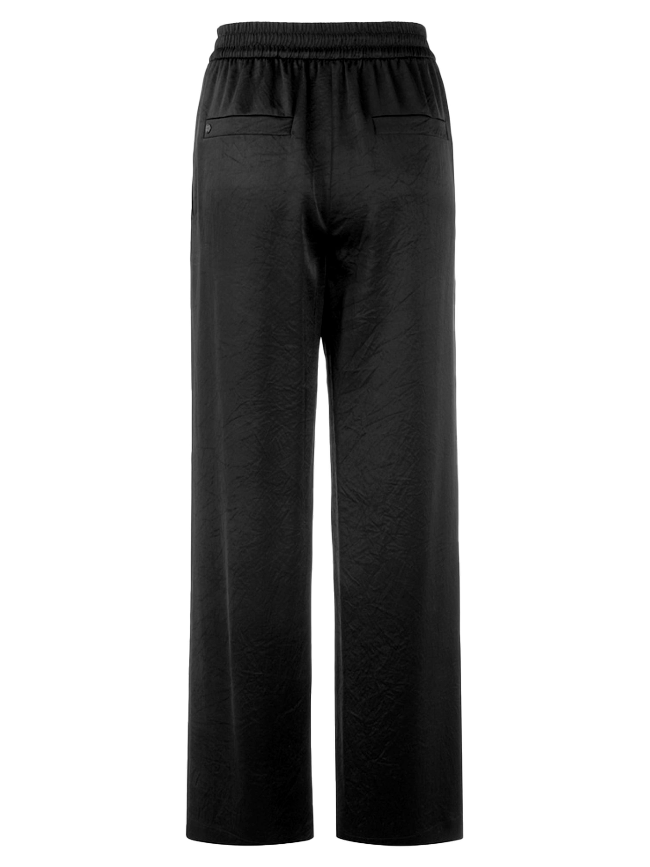 Un pantalon de Marc Cain en noir. Le tissu est légèrement satiné et présente un imprimé reptile ton sur ton. Des côtés vers le dos, la taille est finement plissée et élastiquée. À l’avant, quelques plis sont orientés vers les côtés extérieurs. Le pantalon possède des poches fendues et peut être lavé à 30 degrés.