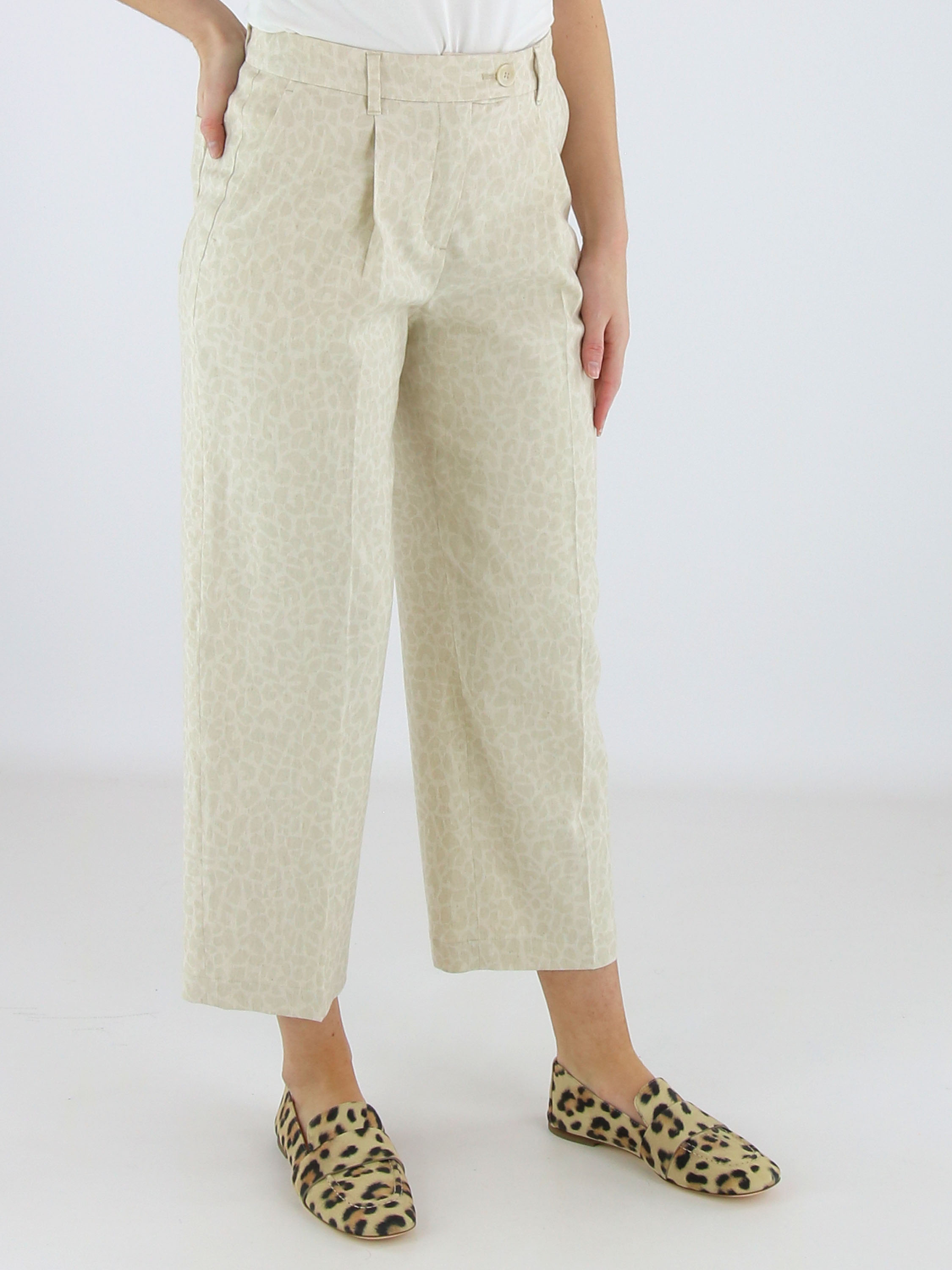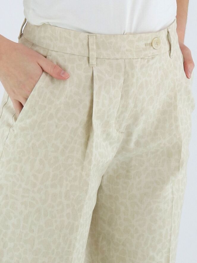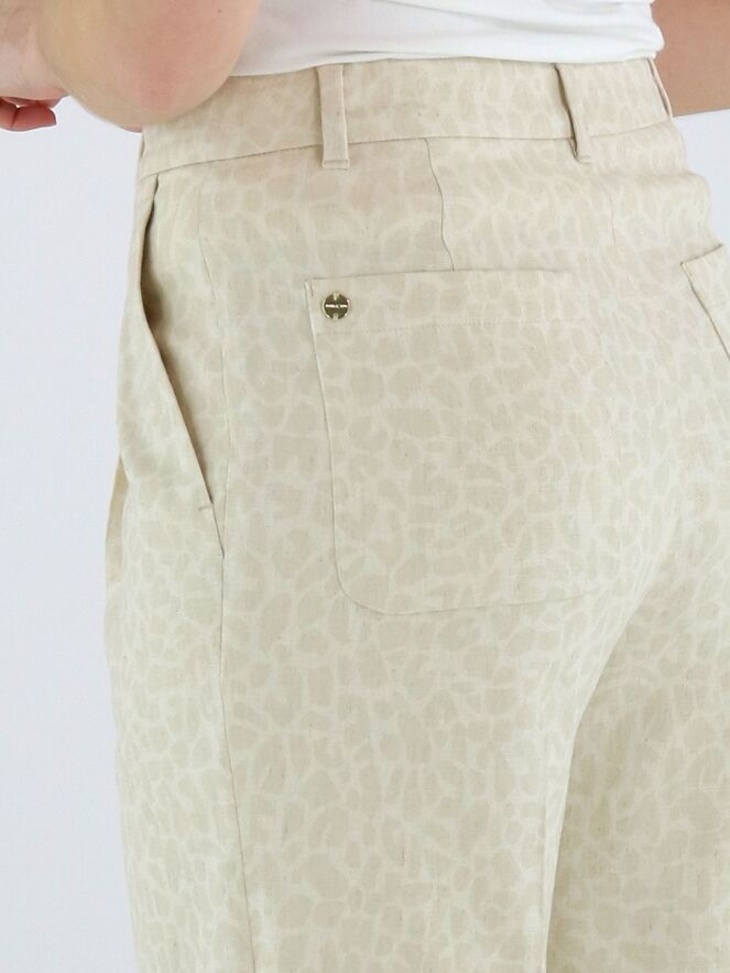 Pantalon de Marc Cain avec un imprimé léopard dans des tons beige et blanc crème. Sous la ceinture, plusieurs plis apportent une tombée élégante et fluide. Doté de poches latérales et d’un pli marqué au centre des jambes, il offre une allure raffinée. Ce pantalon peut être lavé à 30 degrés.
