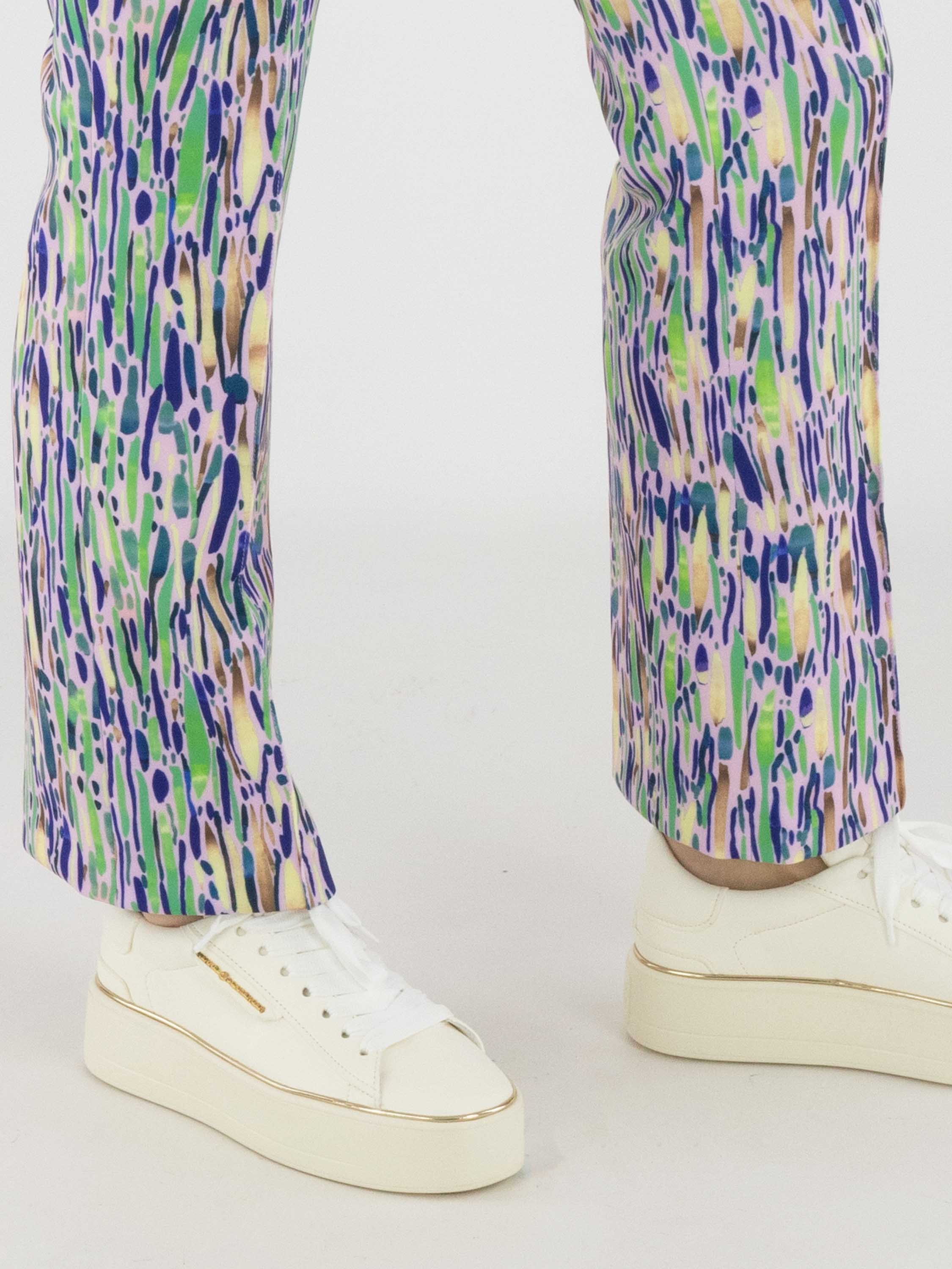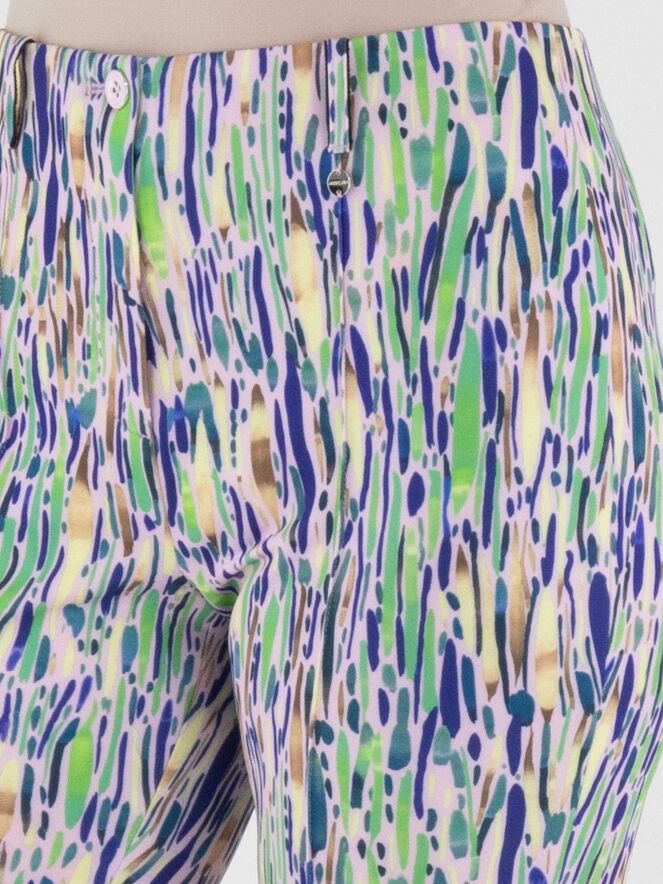 Un pantalon de Marc Cain avec un imprimé confetti dans plusieurs nuances de vert, de bleu et de brun sur un fond rose pastel. La taille est dotée d’une ceinture élastique. Une couture inversée descend au centre des jambes. Ce pantalon peut être lavé à 30 degrés.