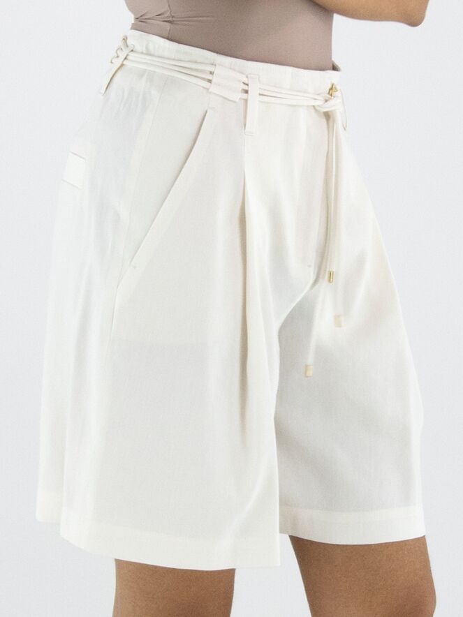 Bermuda de Marc Cain dans une élégante teinte blanc crème. À la taille, une ceinture composée de trois cordons dans la même matière et couleur est sublimée par une boucle ronde dorée, apportant une touche raffinée. Doté de poches latérales, ce bermuda peut être lavé à 30 degrés.