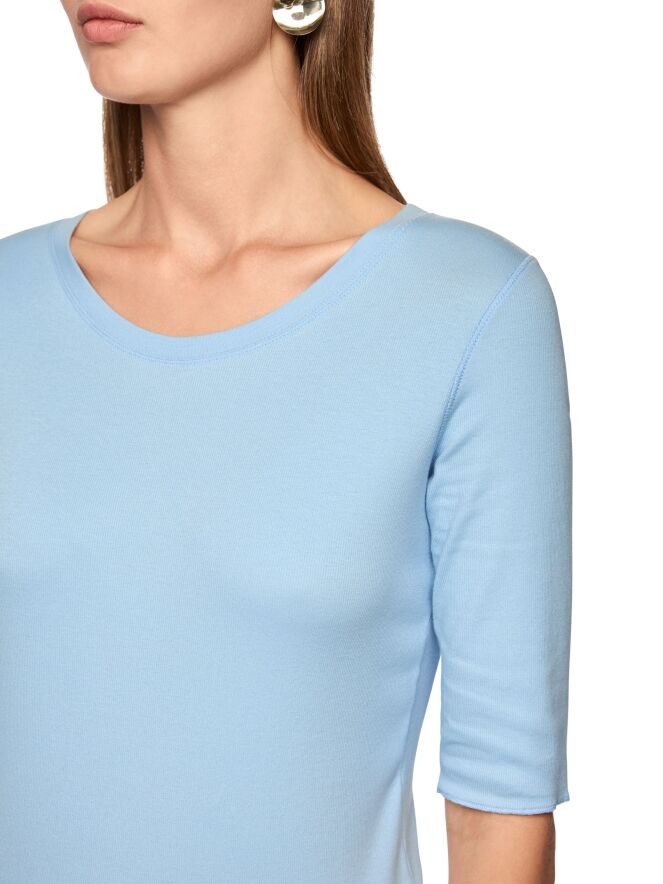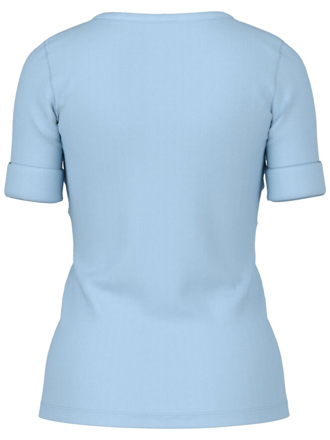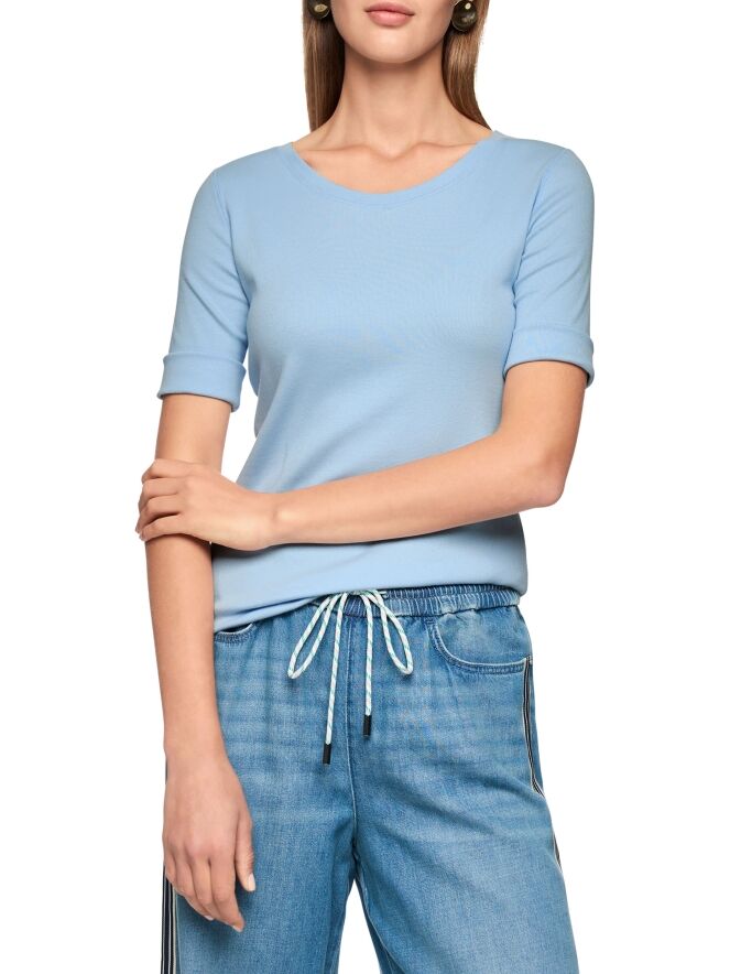 T-shirt de Marc Cain en maille finement côtelée dans une douce teinte bleu pastel. Doté d’un col rond et de manches courtes à revers, il offre une allure féminine et moderne. Ce haut de créateur exclusif peut être lavé à 30 degrés.