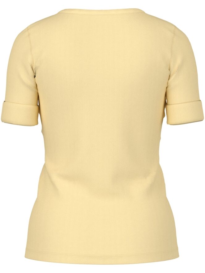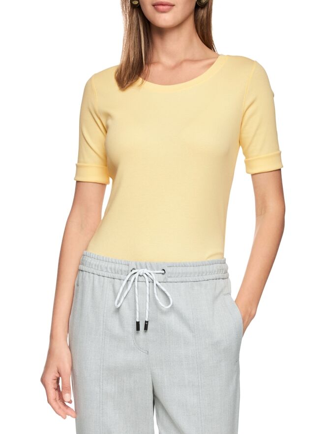 T-shirt de Marc Cain en maille finement côtelée dans une douce teinte jaune pastel. Doté d’un col rond et de manches courtes à revers élégant, il offre une allure fraîche et féminine. Ce haut de créateur exclusif peut être lavé à 30 degrés.