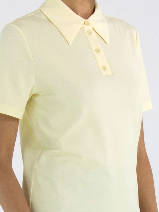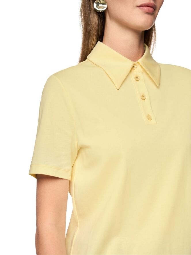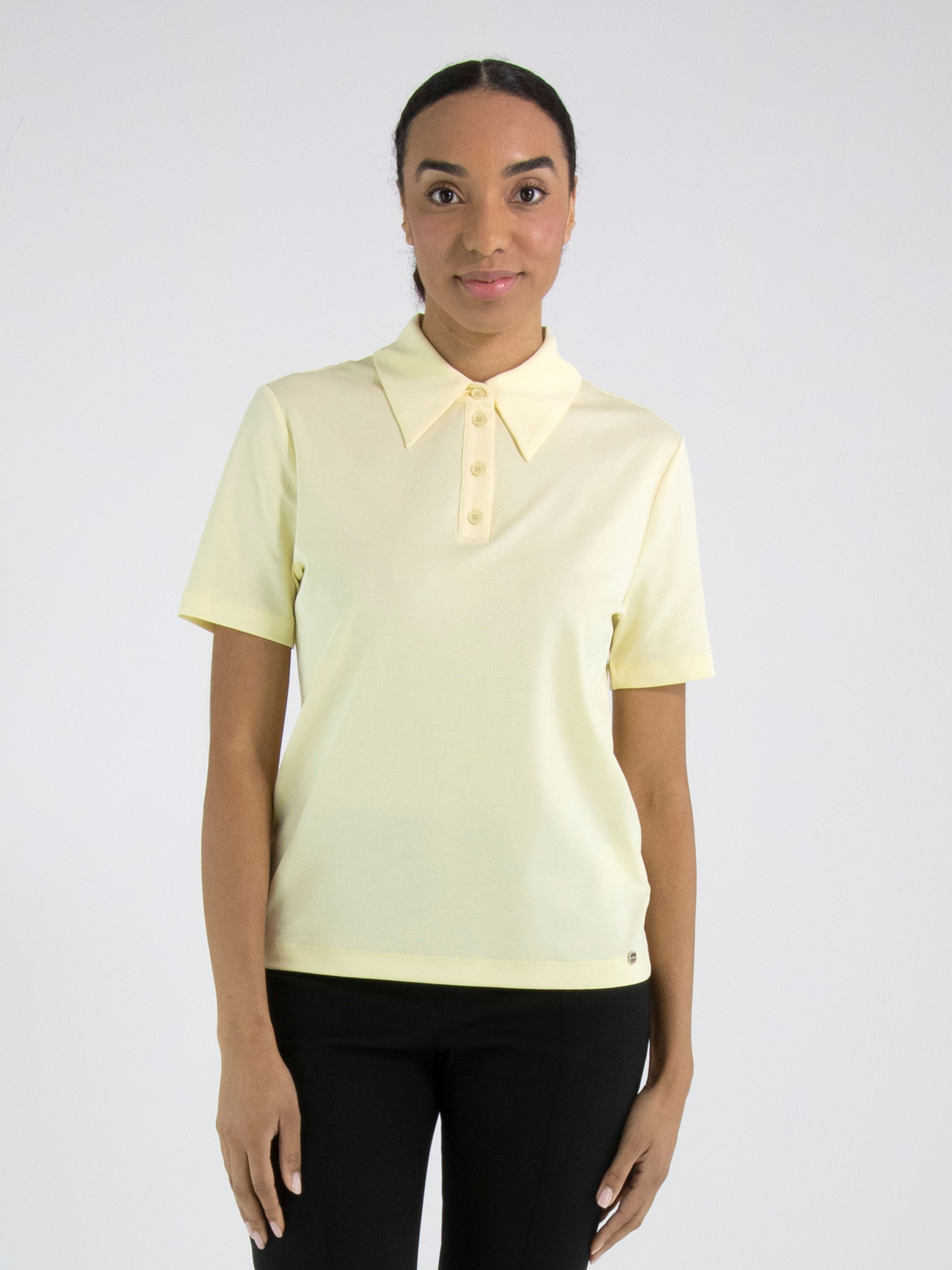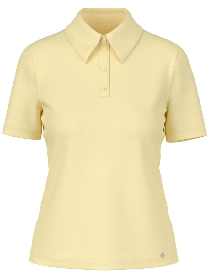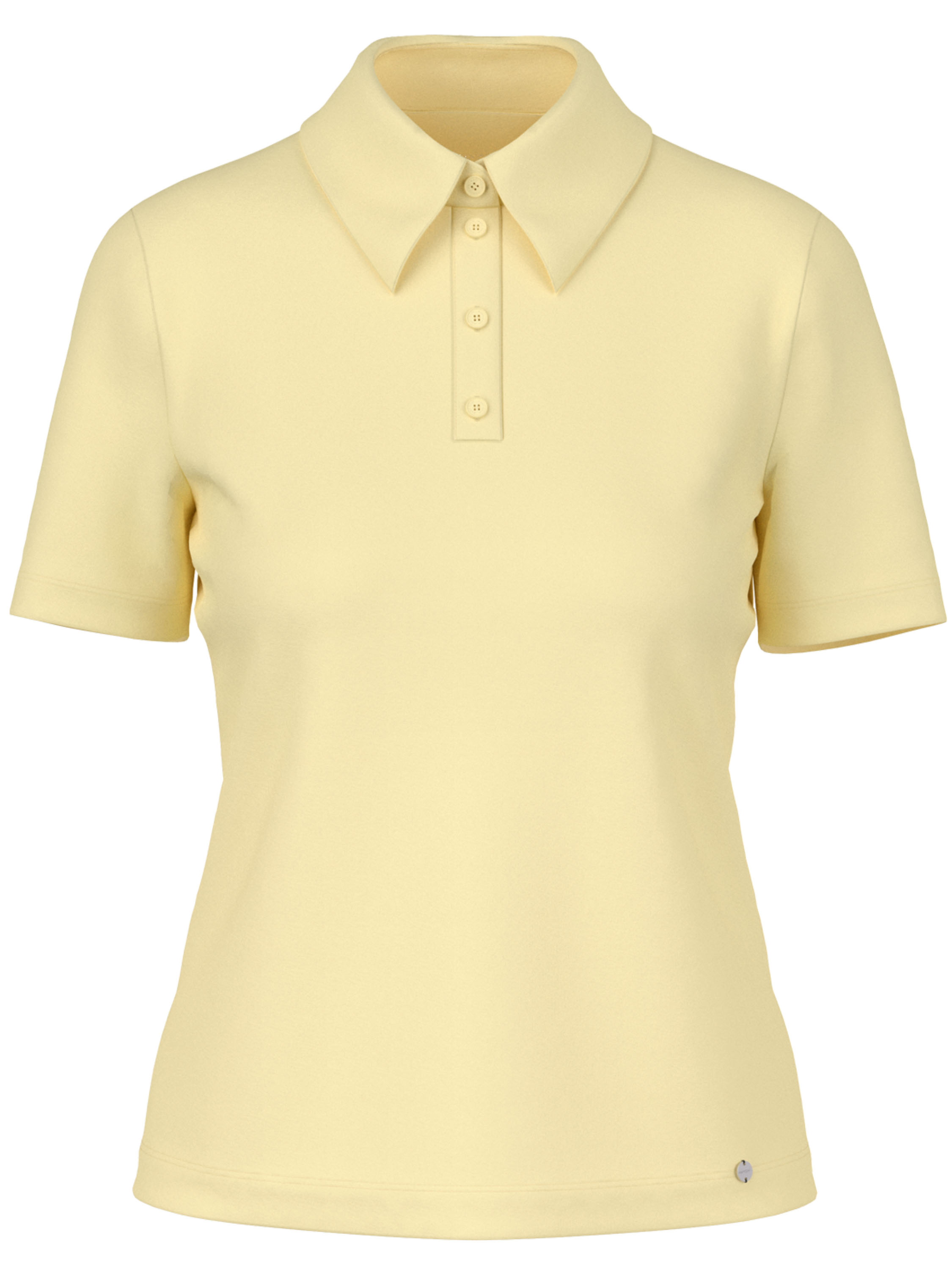 Polo de Marc Cain dans une douce teinte jaune pastel. Ce modèle uni élégant à manches courtes allie simplicité raffinée et allure intemporelle — parfait pour un look estival chic. Ce polo de créateur exclusif peut être lavé à 30 degrés.