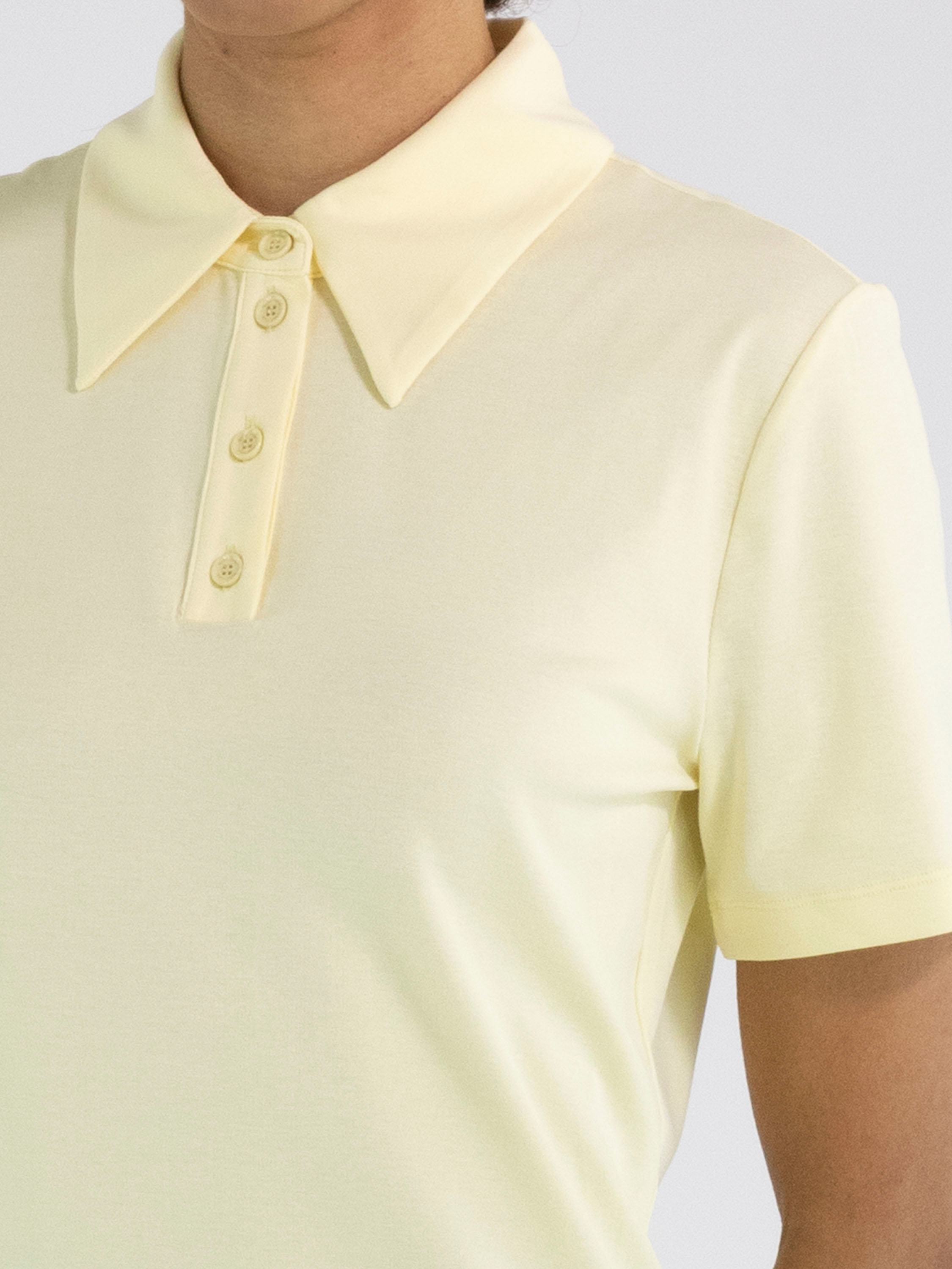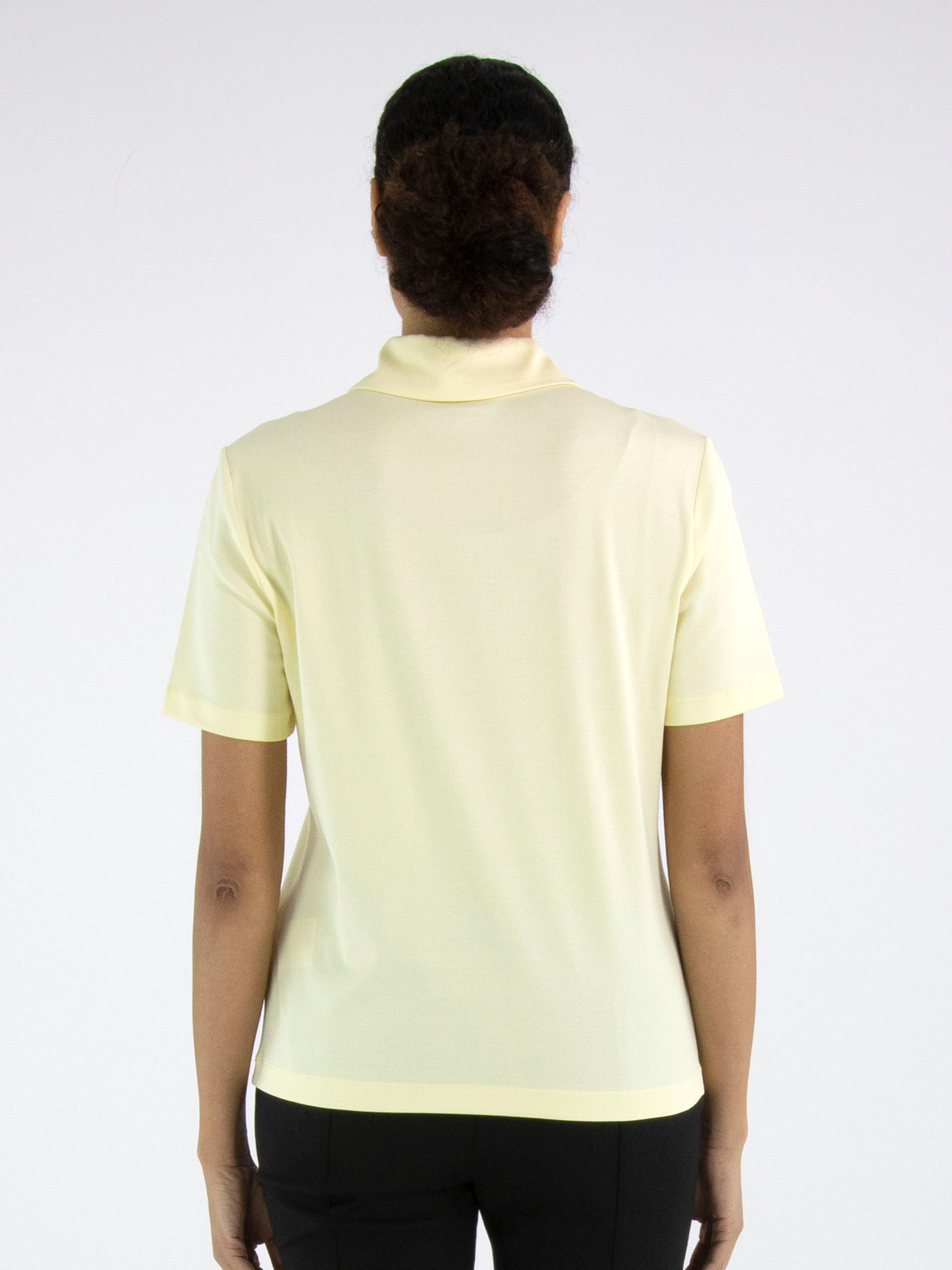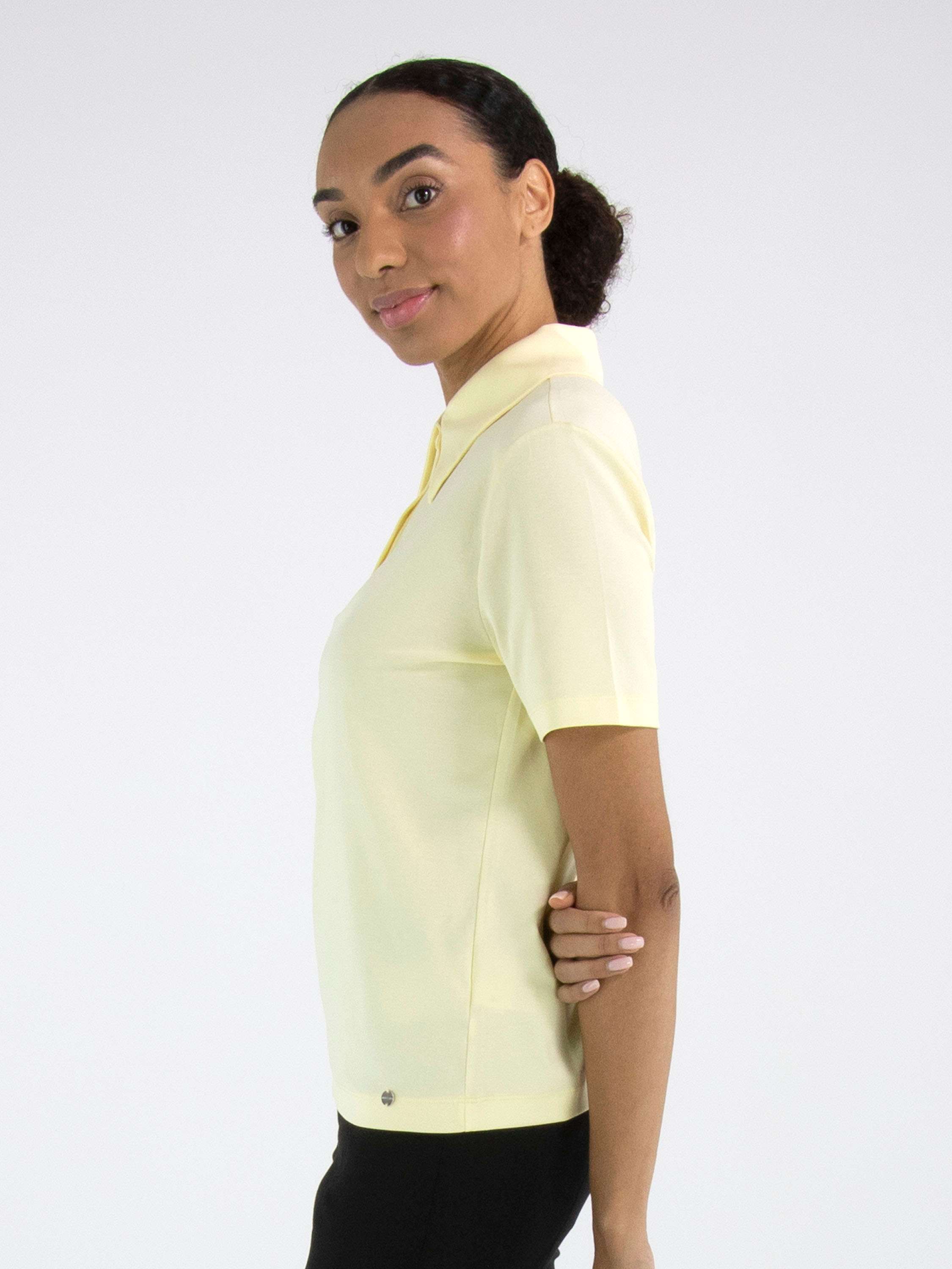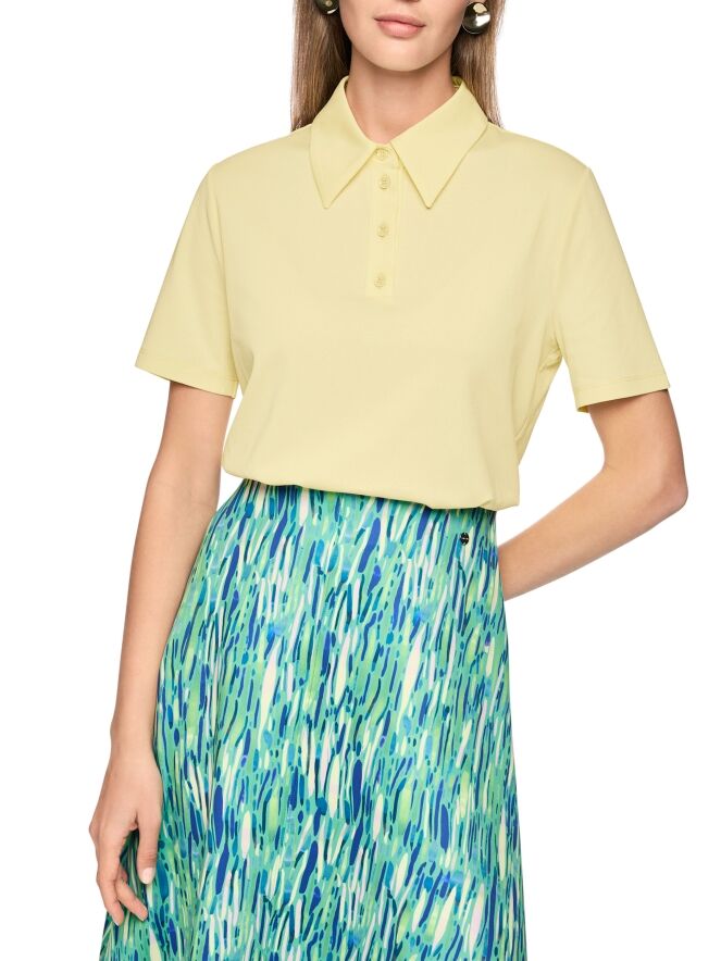 Polo de Marc Cain dans une douce teinte jaune pastel. Ce modèle uni élégant à manches courtes allie simplicité raffinée et allure intemporelle — parfait pour un look estival chic. Ce polo de créateur exclusif peut être lavé à 30 degrés.