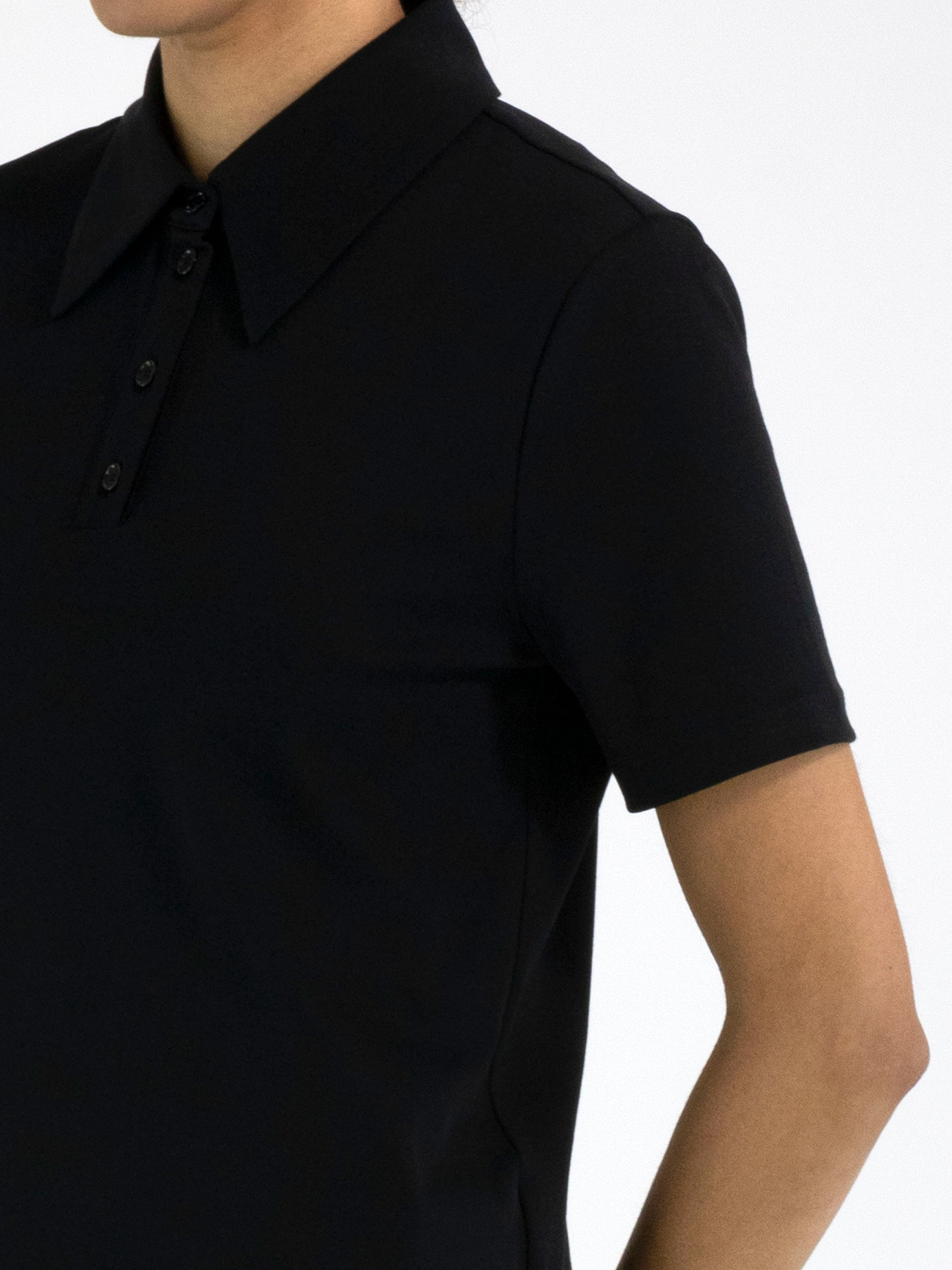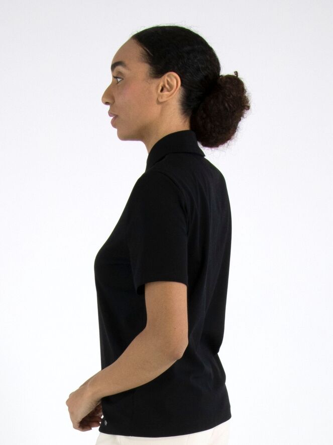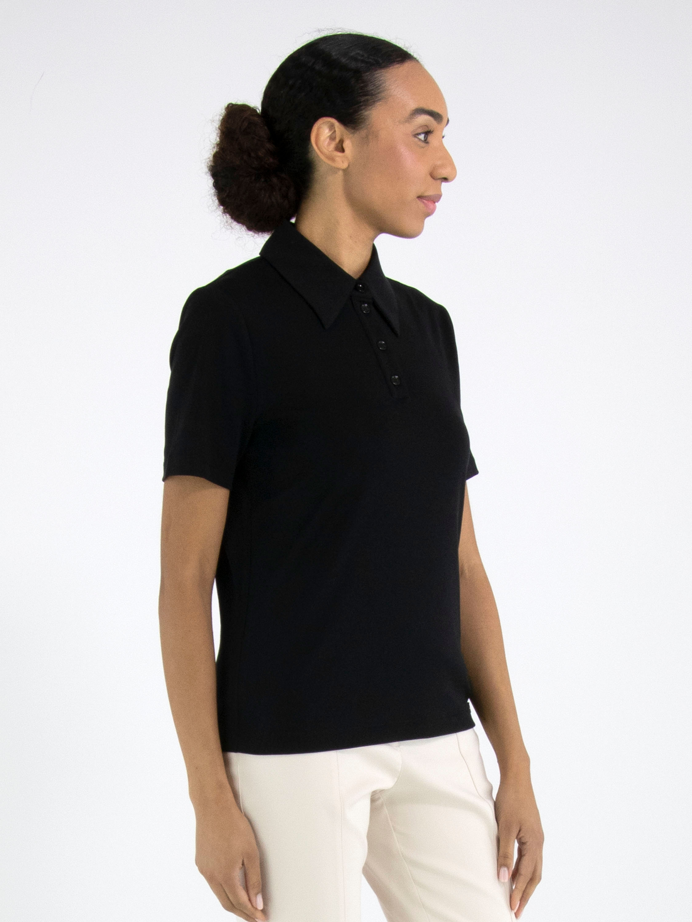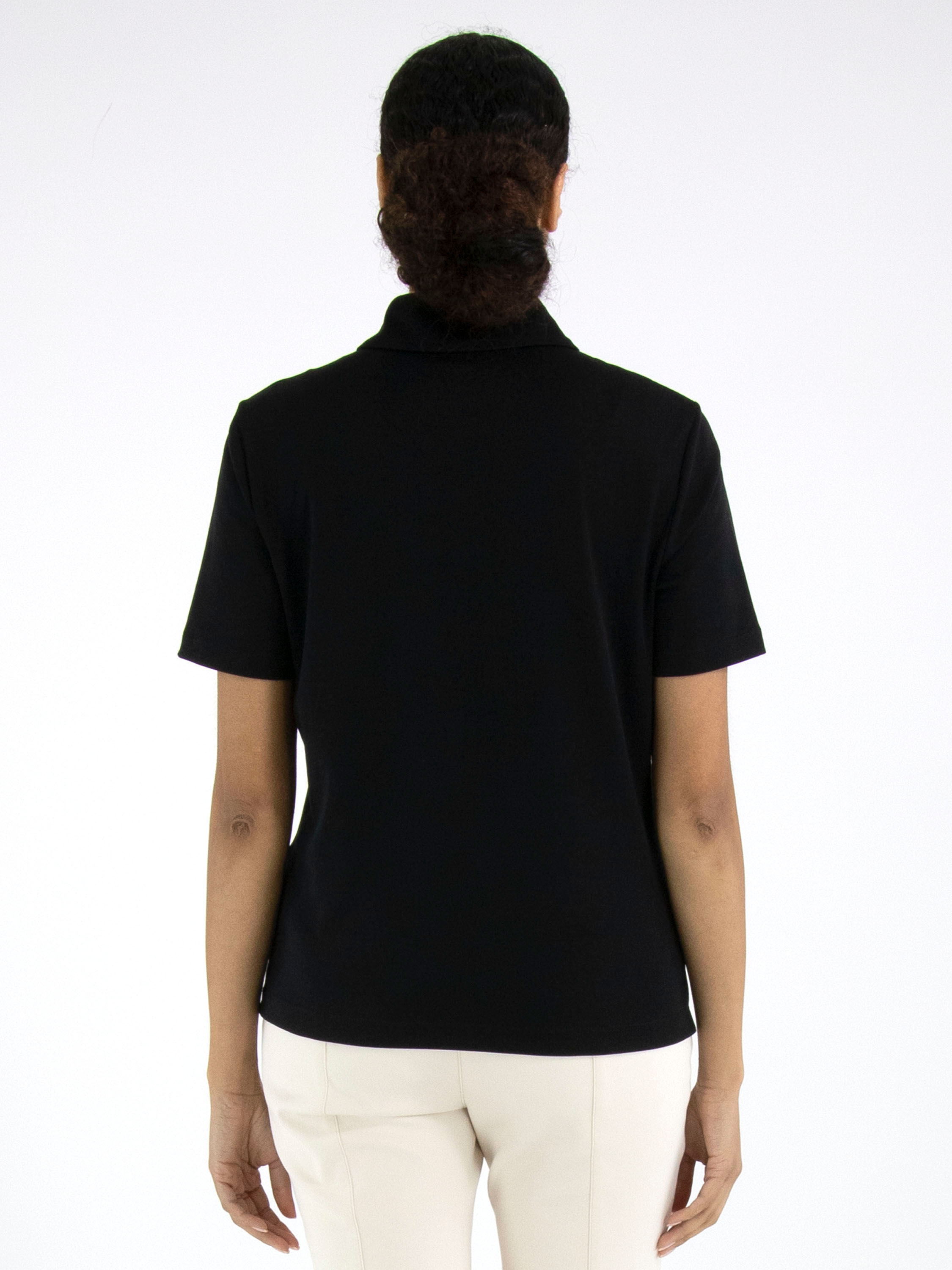 Polo de Marc Cain en noir uni. Ce modèle élégant à manches courtes présente une coupe féminine et intemporelle, parfaite pour un style à la fois décontracté et raffiné. Ce polo de créateur exclusif peut être lavé à 30 degrés.