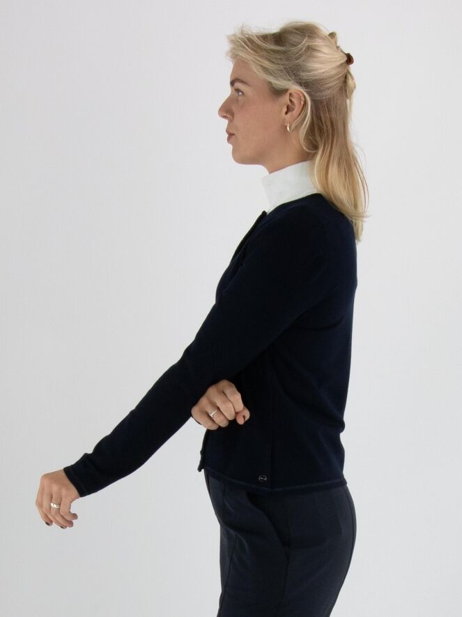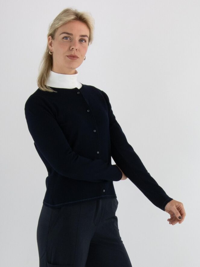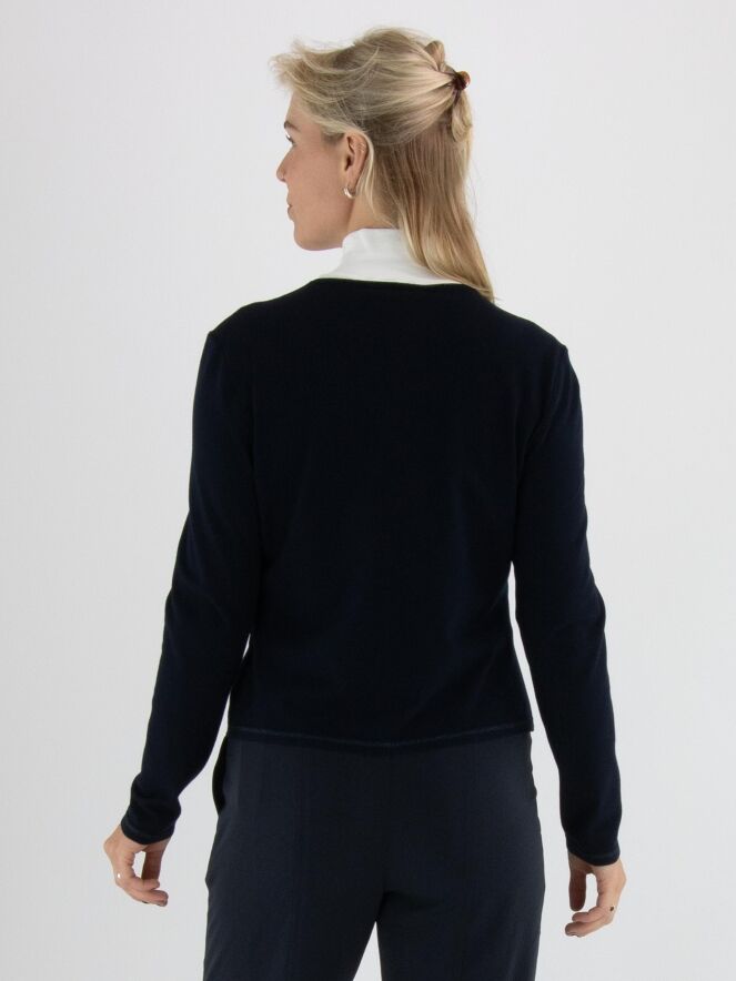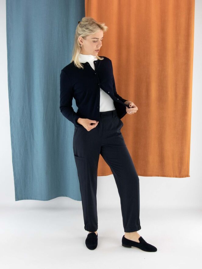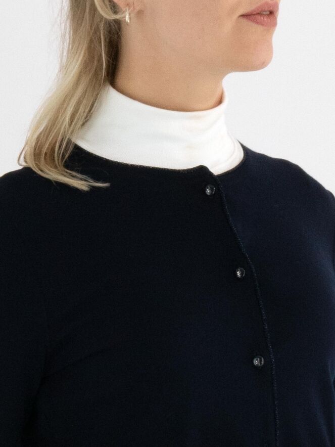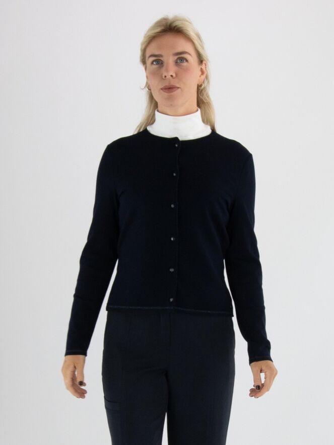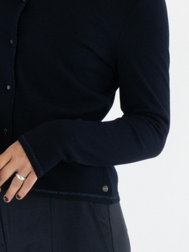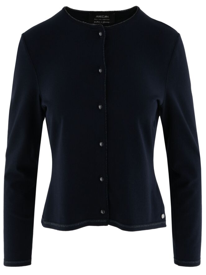 Un gilet court de Marc Cain en bleu marine. Le long de l’encolure et de la fermeture se trouve un galon tissé avec un fil métallique bleu. À la base, une fine bande tricotée en côtes assortie complète le galon. Ce gilet peut être lavé à 30 degrés.