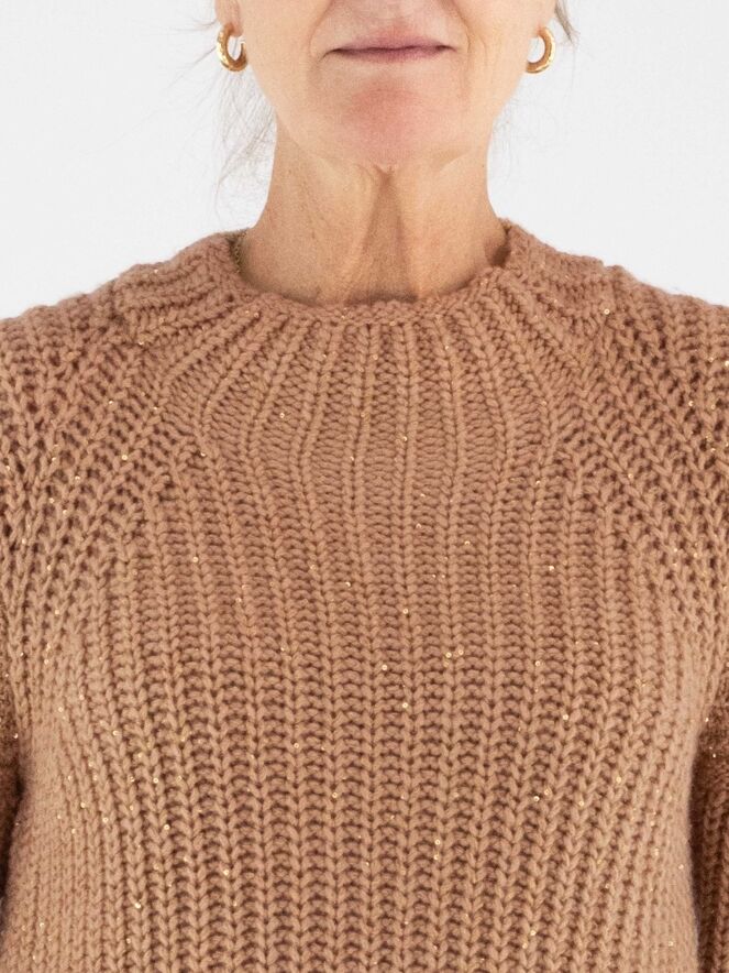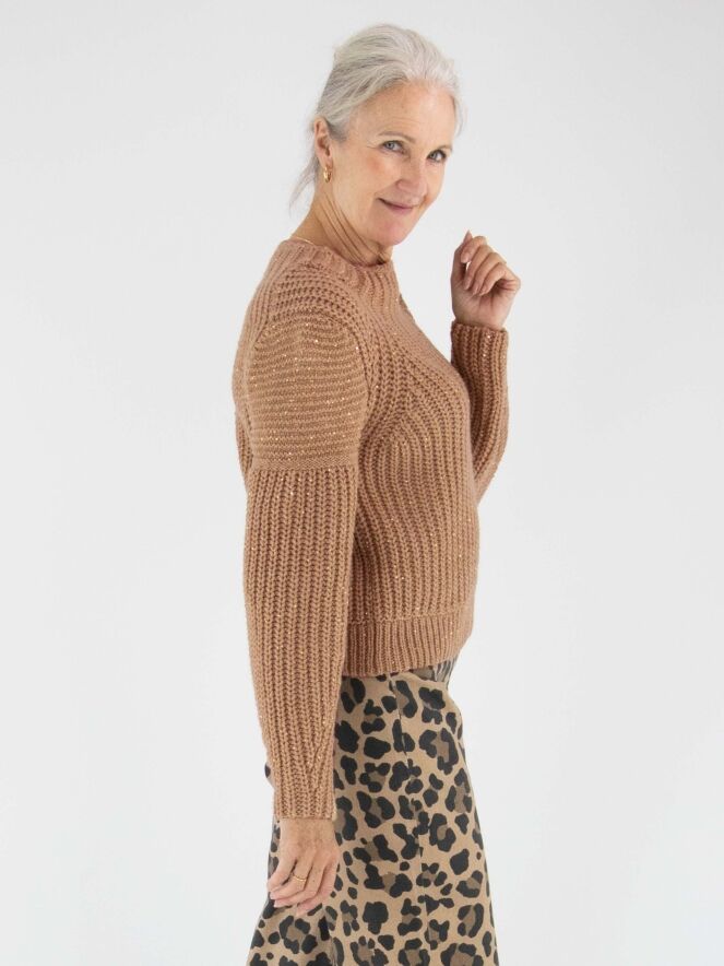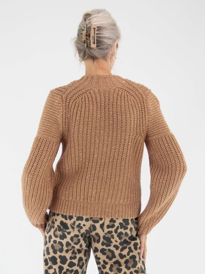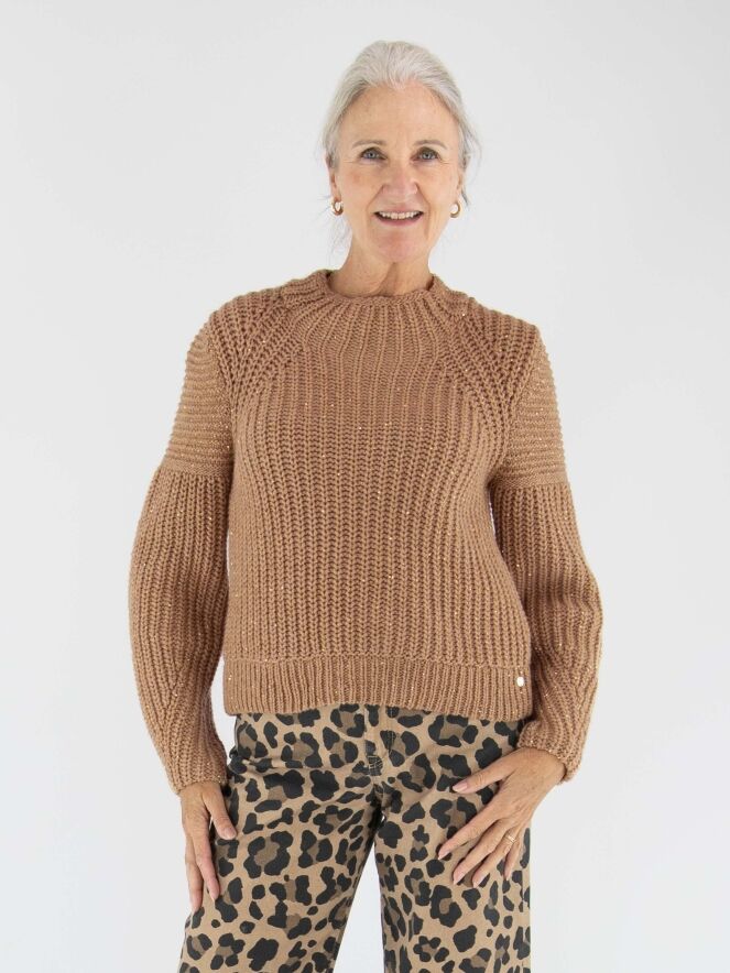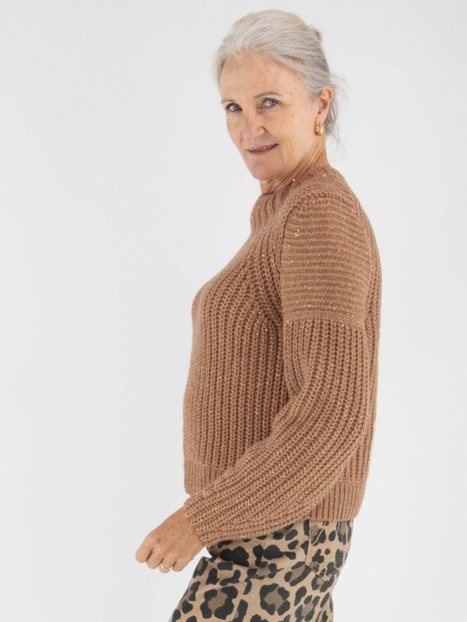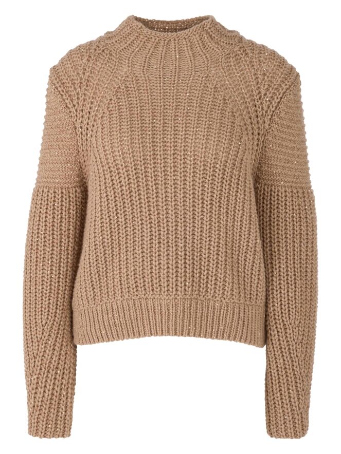 Pull Marc Cain en coloris camel. Le point de tricot est rehaussé de sequins brillants ton sur ton. Le pull est doté d’un col roulé et doit être lavé à la main.