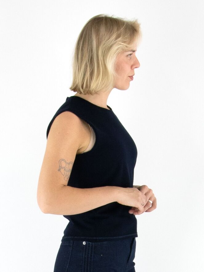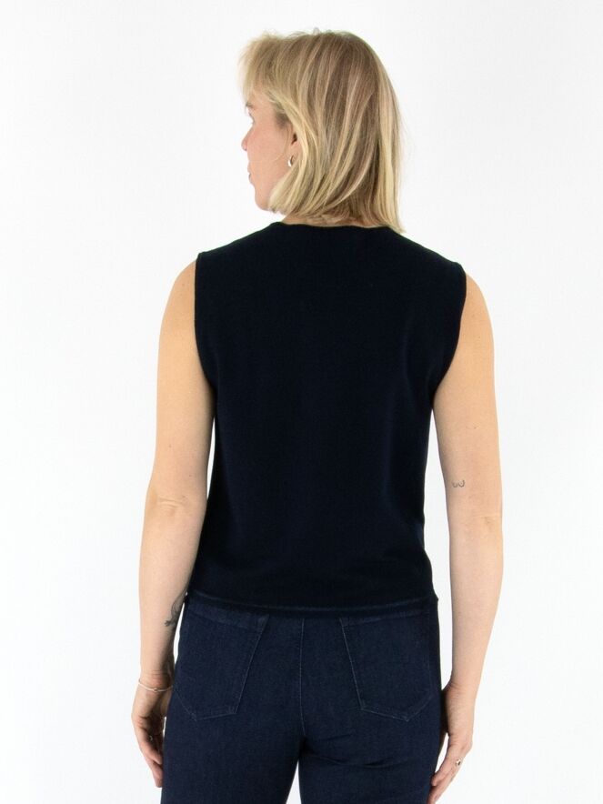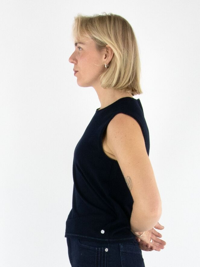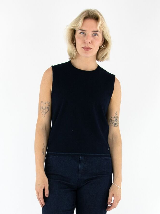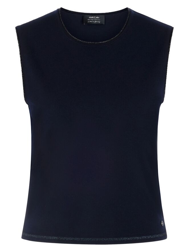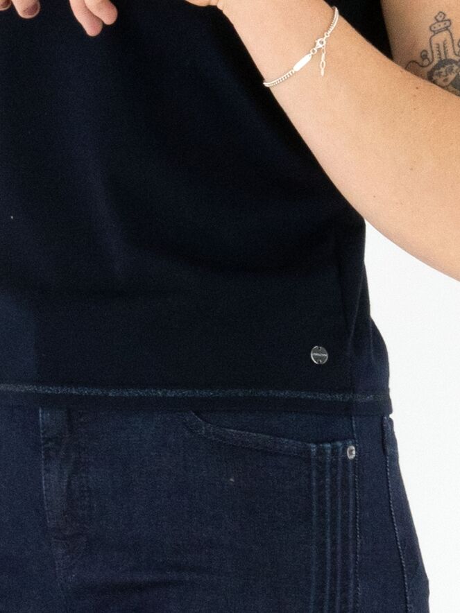 Un top court de Marc Cain dans une teinte bleu marine profonde. Le long des emmanchures et de l’encolure ronde court un liseré brillant en maille délicate, apportant une touche élégante et moderne. Ce top peut être lavé à 30 degrés.