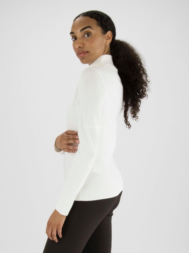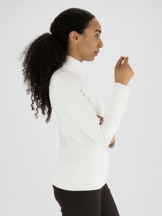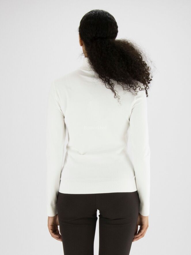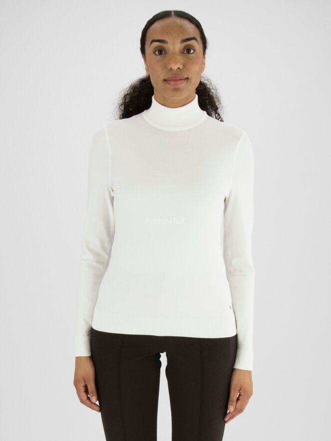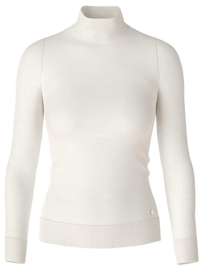 Pull à col montant de la marque Marc Cain, de couleur blanc crème. Le pull présente des manches longues. Le col, le bas du pull et le bout des manches sont à large bordure finement côtelé. Lavage à 30 degrés.