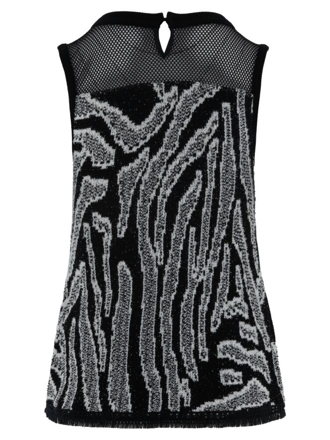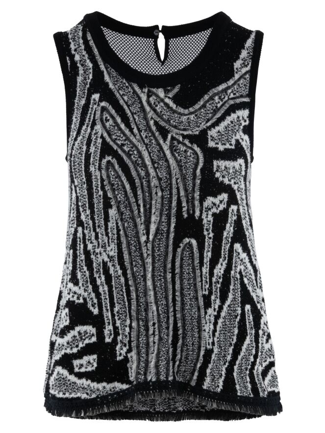 Top élégant de la marque Marc Cain à l’imprimée de couleurs mêlées noir et blanc, coupe légèrement évasée. Le haut de la partie arrière est en maille filet. Lavage à 30 degrés.