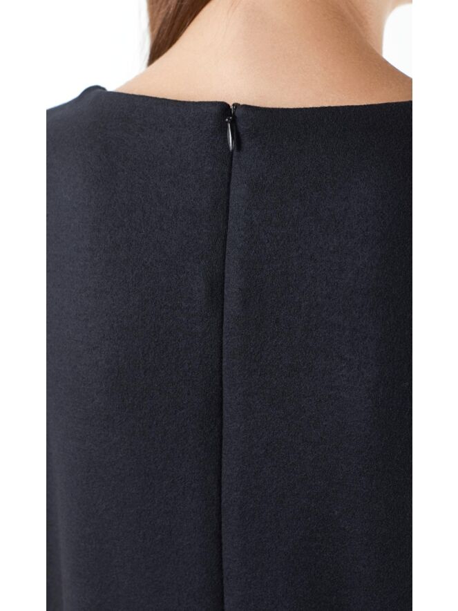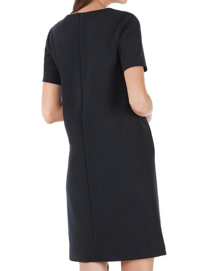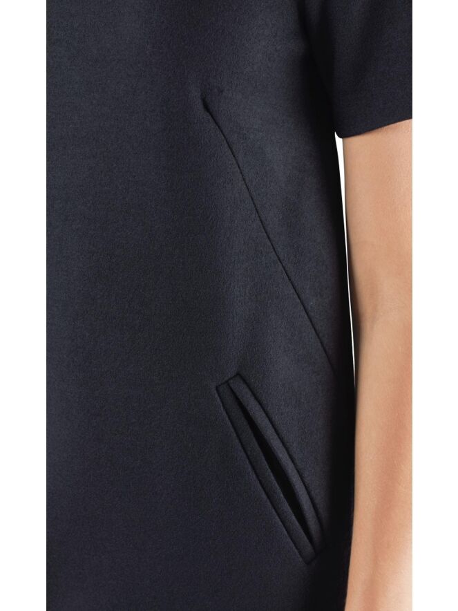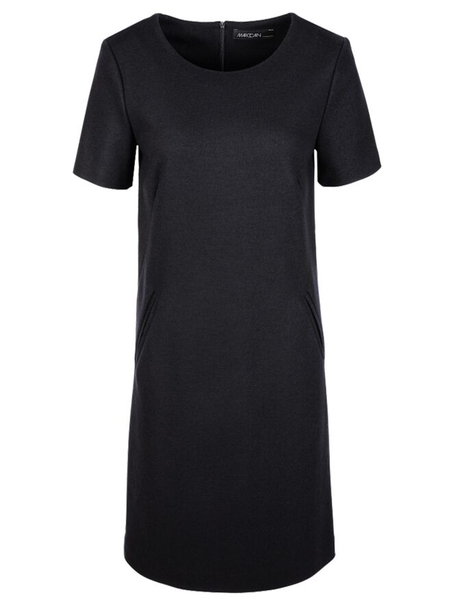 Une robe noire de Marc Cain. La robe présente un col rond et des manches courtes. Elle dispose de poches insérées au niveau de la taille. À l'arrière, elle est dotée d'une fermeture éclair au centre qui descend juste en dessous de la taille. Cette robe est doublée et ne doit pas être lavée.