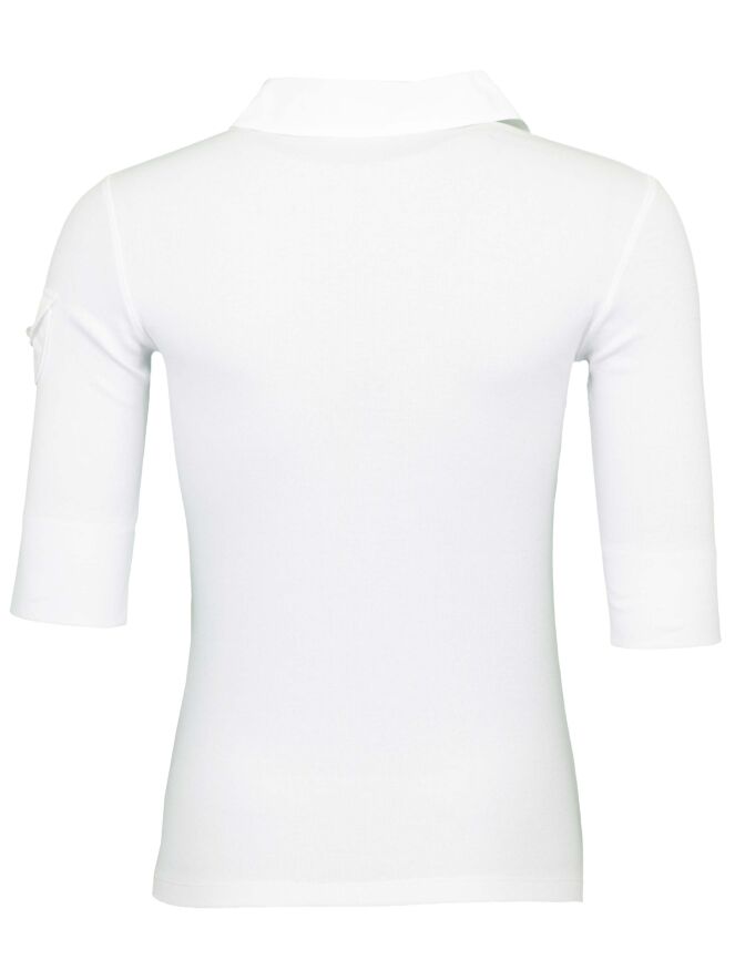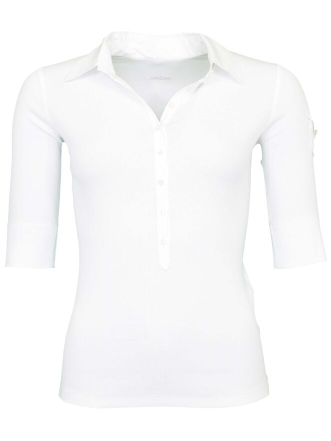 Polo de coupe décontractée, de la marque Marc Cain, couleur blanche. La patte de boutonnage en polyester brillant descend jusqu'à mi-hauteur. Ses manches sont mi-longues, avec une petite poche à revers boutonné sur celle de gauche. Le coton est finement nervuré et la teneur en élasthanne lui assure un parfait confort. Lavage à 30 degrés.