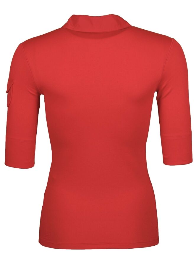 Polo de coupe décontractée, de la marque Marc Cain, couleur rouge. La patte de boutonnage en polyester brillant descend jusqu'à mi-hauteur. Ses manches sont mi-longues, avec une petite poche à revers boutonné sur celle de gauche. Le coton est finement nervuré et la teneur en élasthanne lui assure un parfait confort. Lavage à 30 degrés.