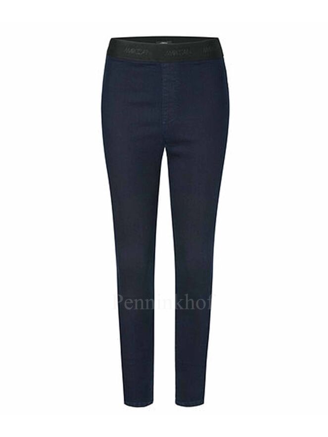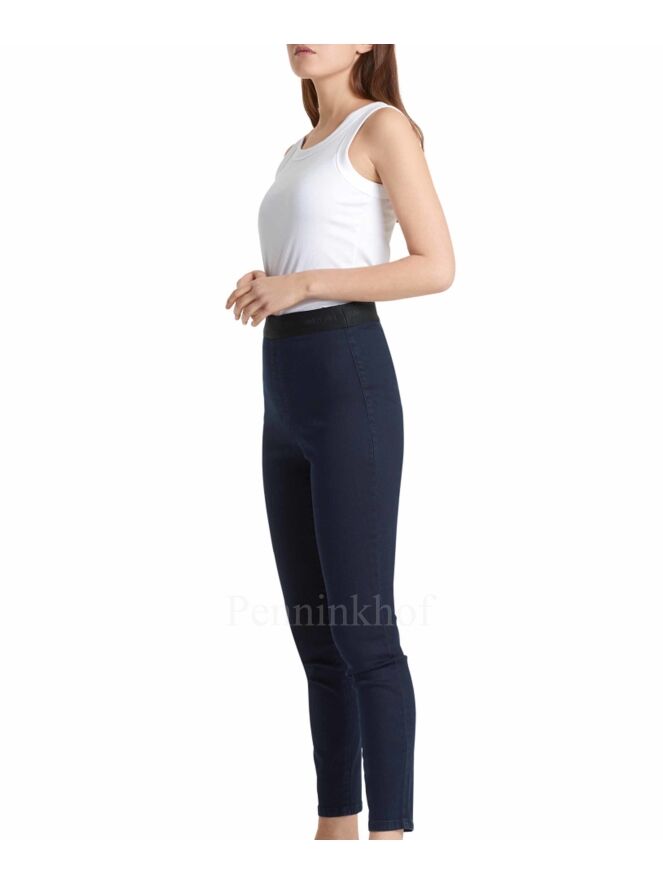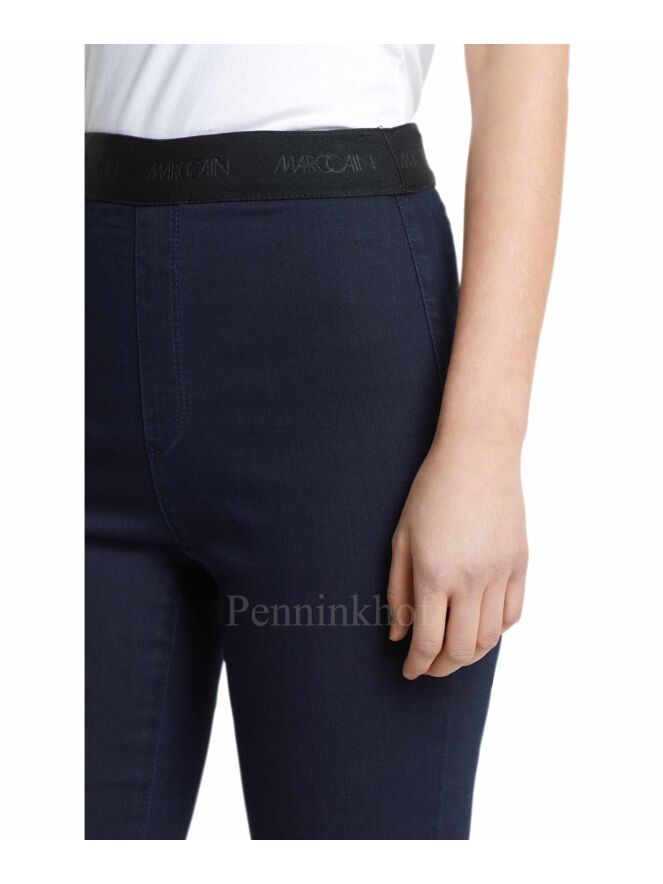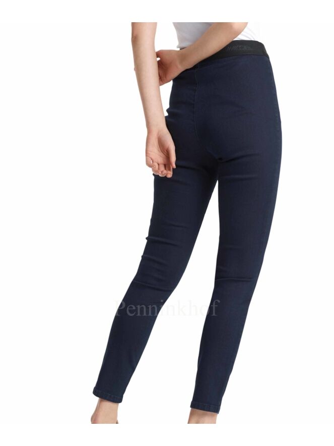 Jeans de la marque Marc Cain essentiels, de couleur blue jean foncé. Il est muni d'une large bande élastique noire à la taille. Lavage à 30 degrés.