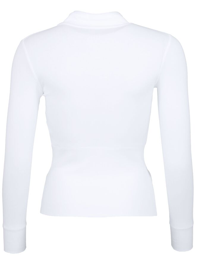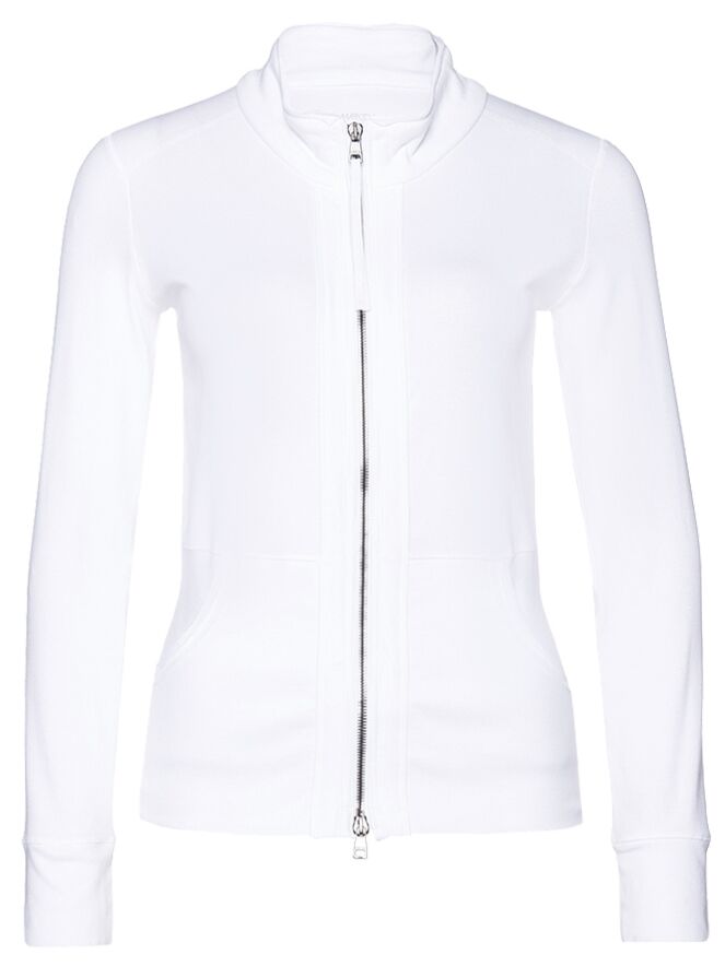 Gilet court à manches longues, de la marque Marc Cain, de couleur blanche. L'ouverture de ses deux poches latérales sur le devant sont arrondies. Modèle à fermeture Eclair double sens bordée d'une simple bande remontant jusqu'au col double épaisseur. Lavage à 30 degrés.