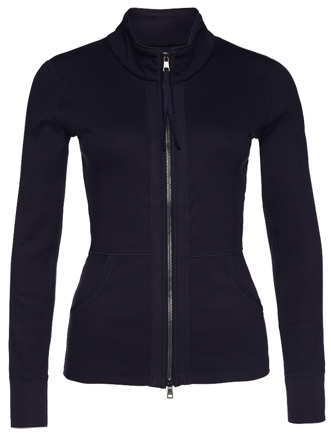 Gilet court à manches longues, de la marque Marc Cain, de couleur bleu marine. L\'ouverture de ses deux poches latérales sur le devant sont arrondies. Modèle à fermeture Eclair double sens bordée d\'une simple bande remontant jusqu\'au col double épaisseur. Lavage à 30 degrés.