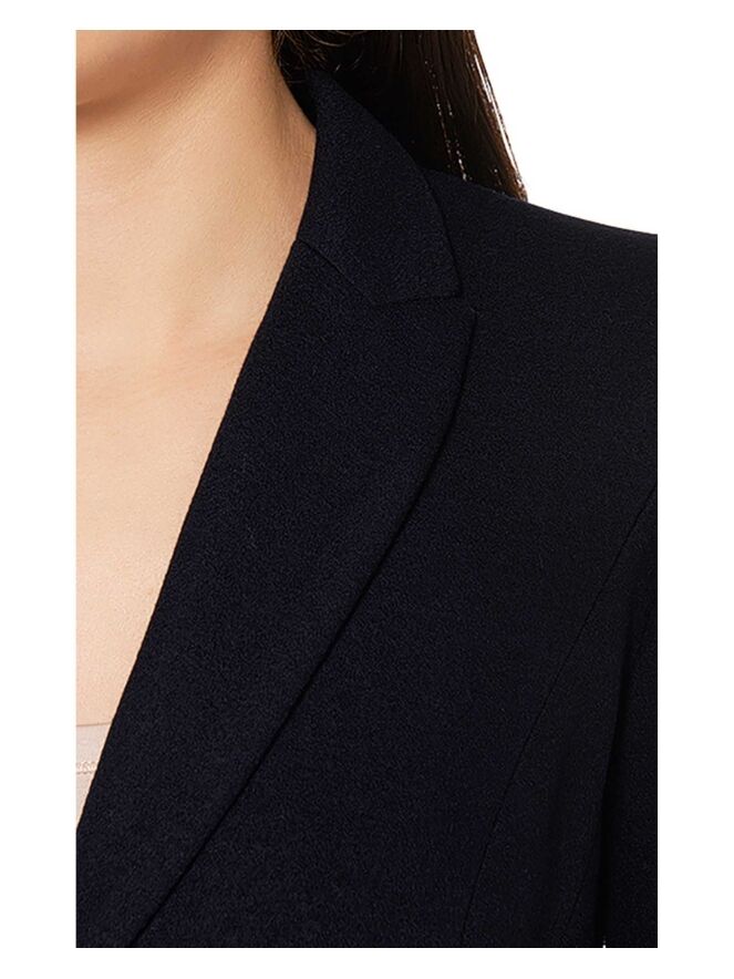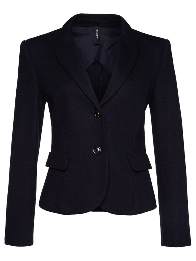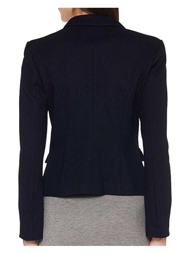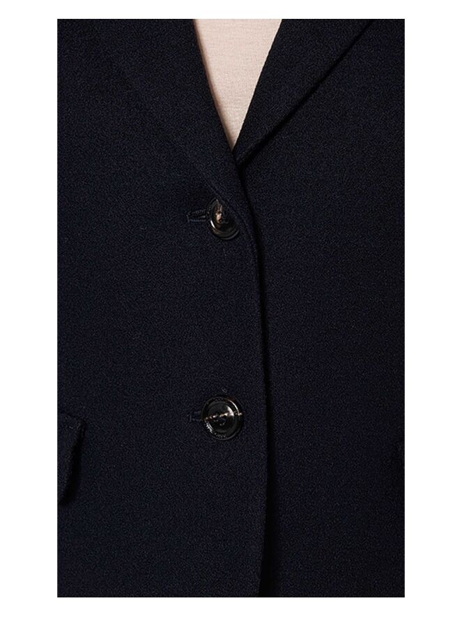 Charmante veste courte légèrement cintrée en laine vierge et cachemire, de la marque Marc Cain essentiels, de couleur bleu marine. Sa base est arrondie et ses deux poches avant sont factices. Elle se ferme au moyen de deux boutons centrés. Modèle à manches doublées. Lavage déconseillé.