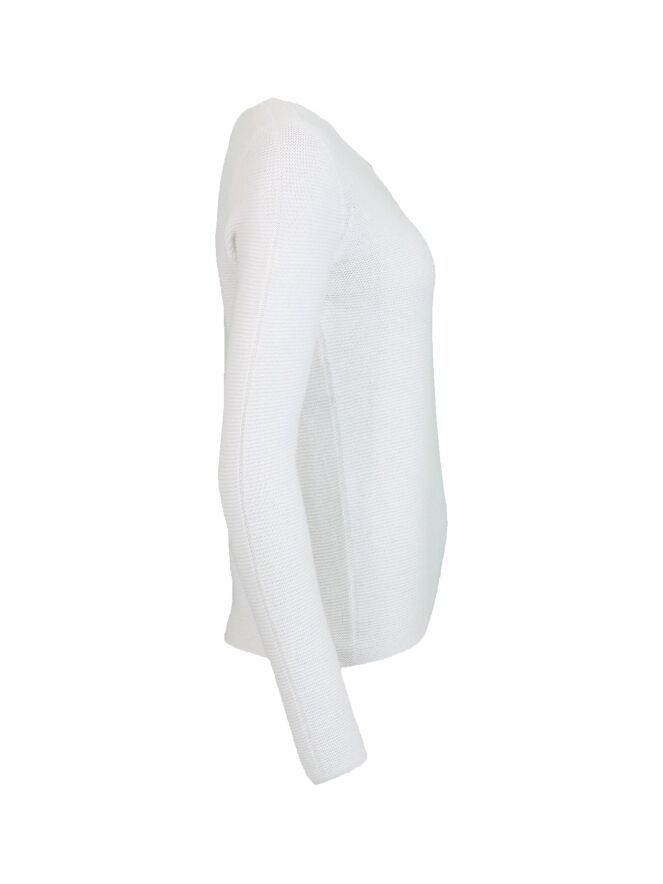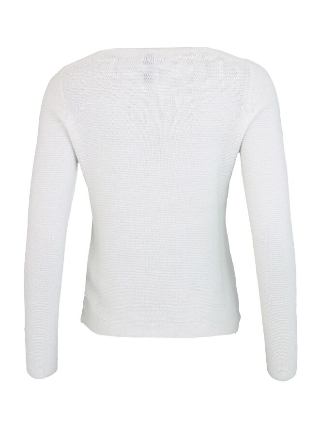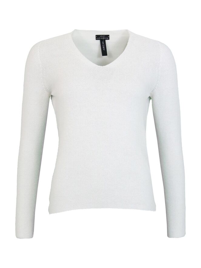 Pull de la marque Marc Cain essentiels, de couleur blanc crème. Le pull présente un col en V. Lavage à la main.