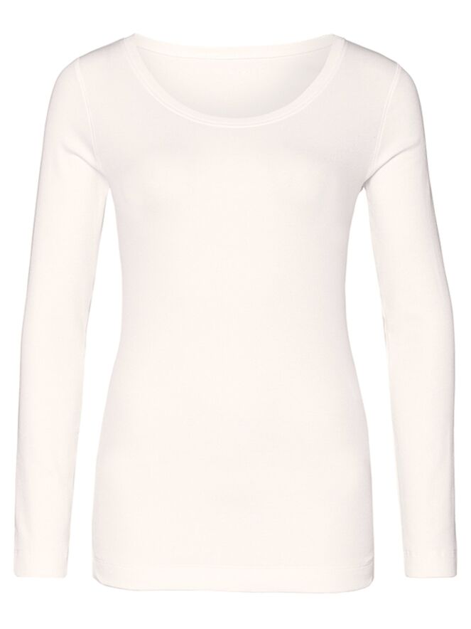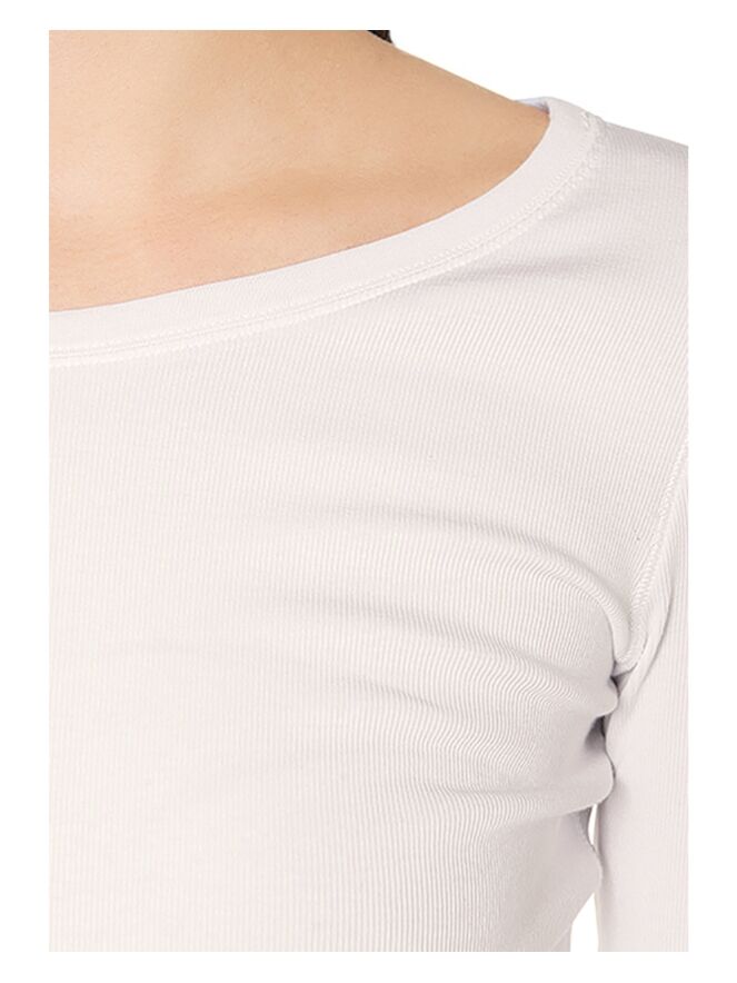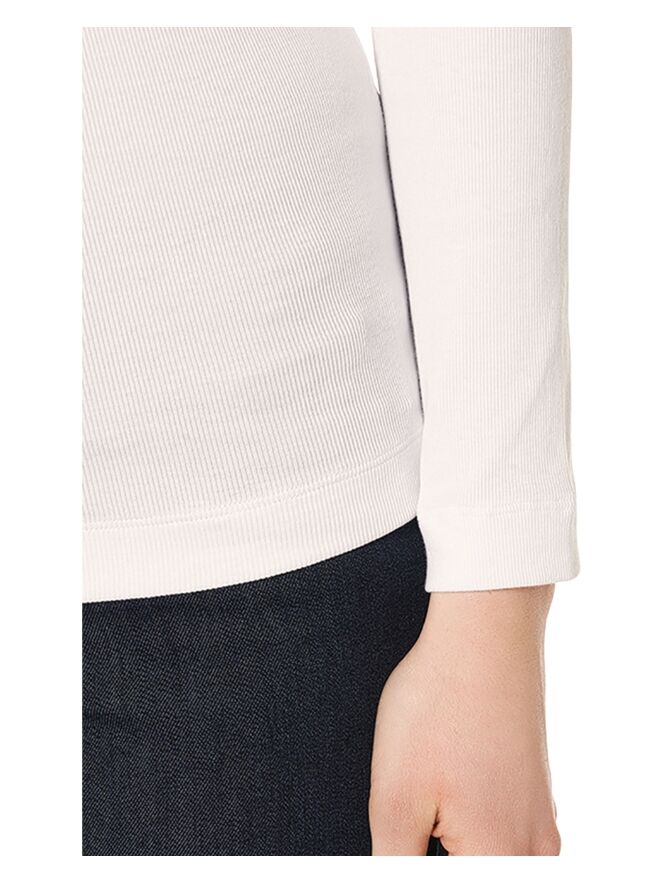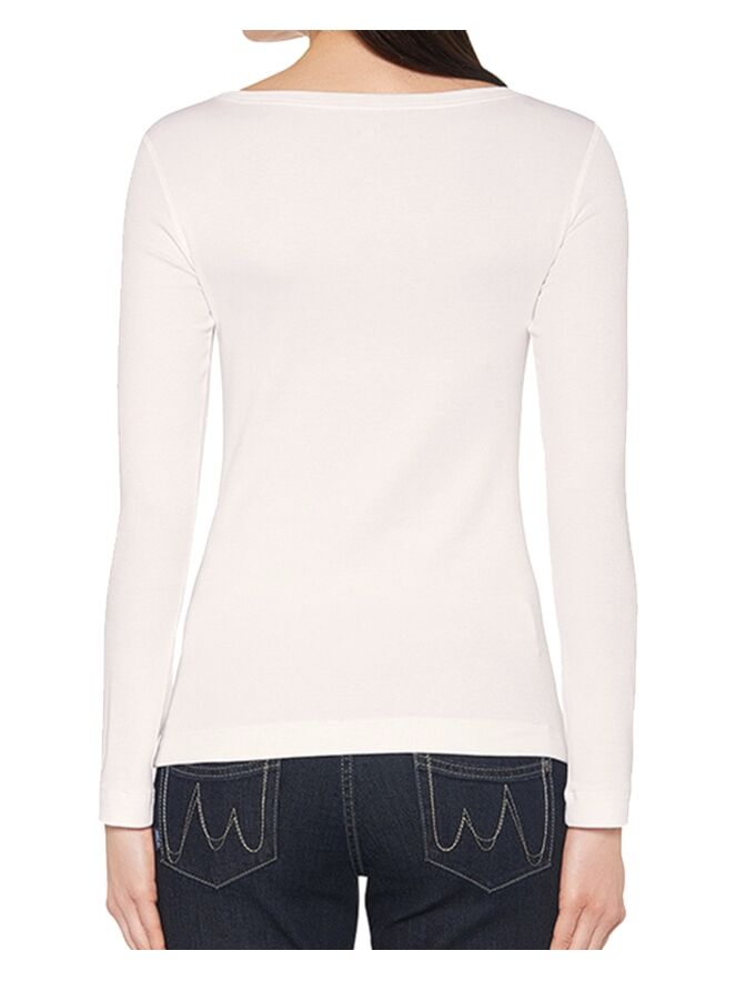 Tee-shirt basique de la marque Marc Cain, de couleur blanc crème. Il est fait d'une maille finement côtelée. Le tee-shirt présente des manches longues et une encolure ronde. Lavage à 30 degrés.