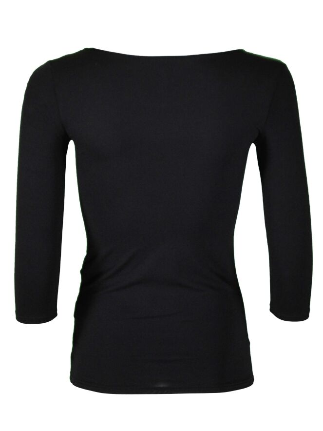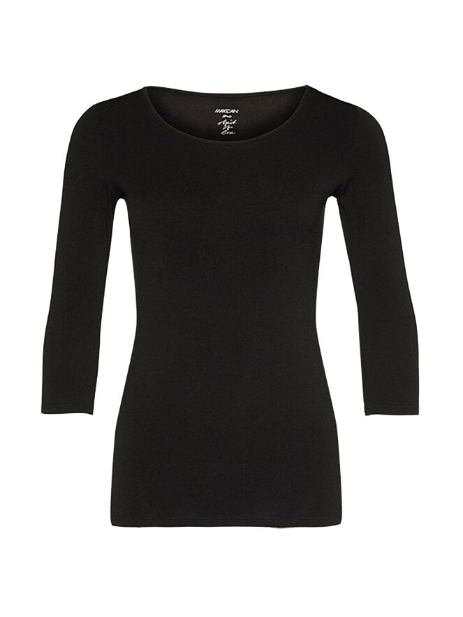 Tee-shirt à manches longues, de la marque Marc Cain essentiels, de couleur noire, légèrement ajusté. L'encolure ronde est ornée d'un fin passepoil. Lavage à 30 degrés.