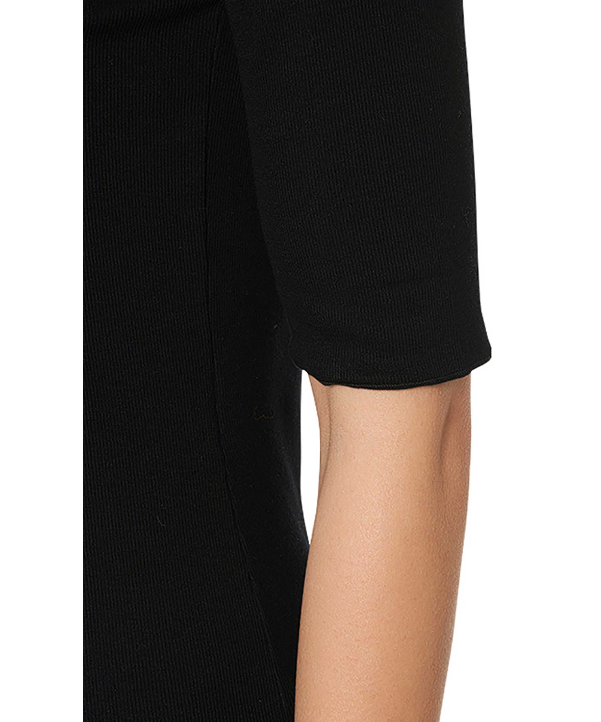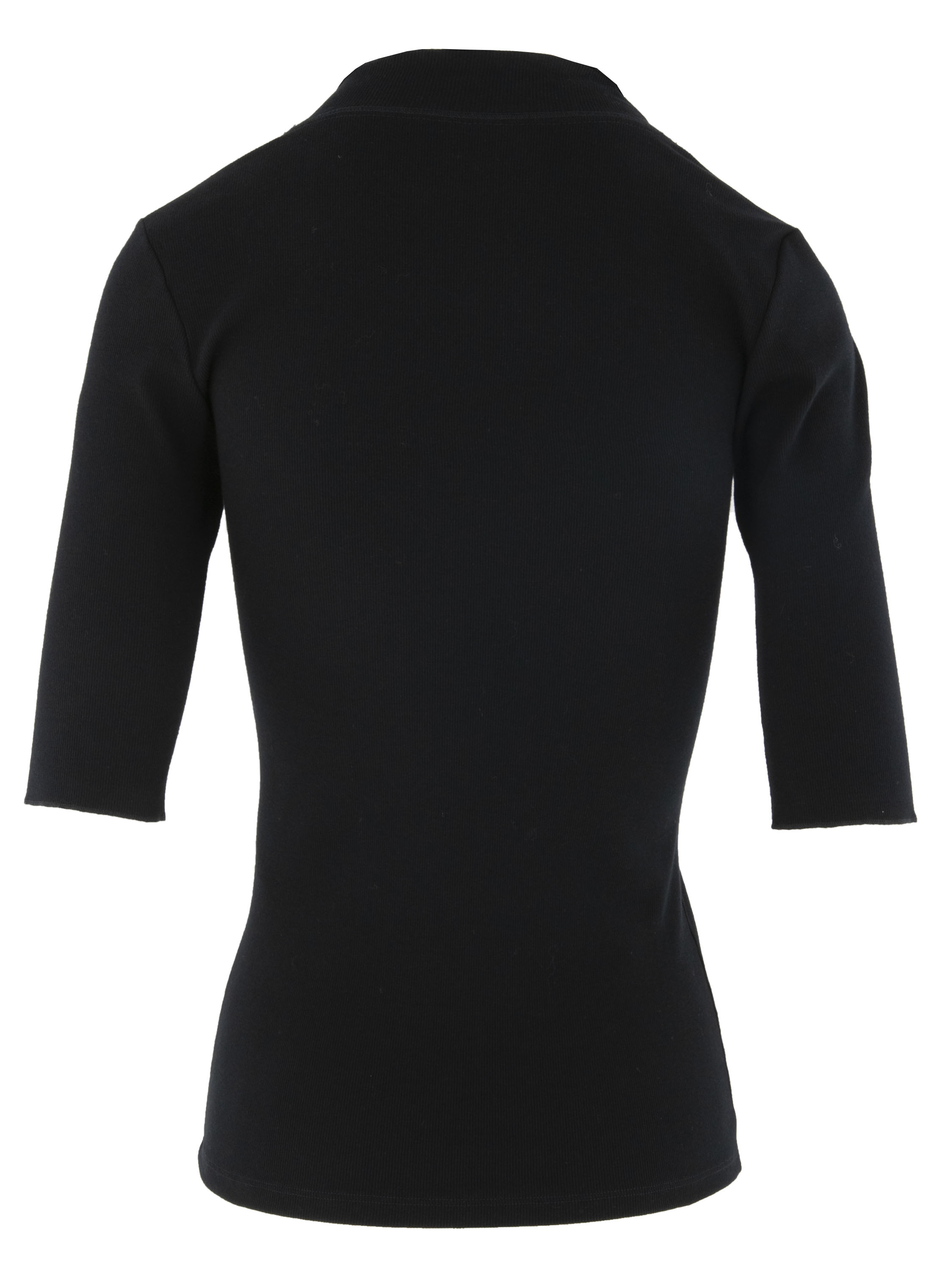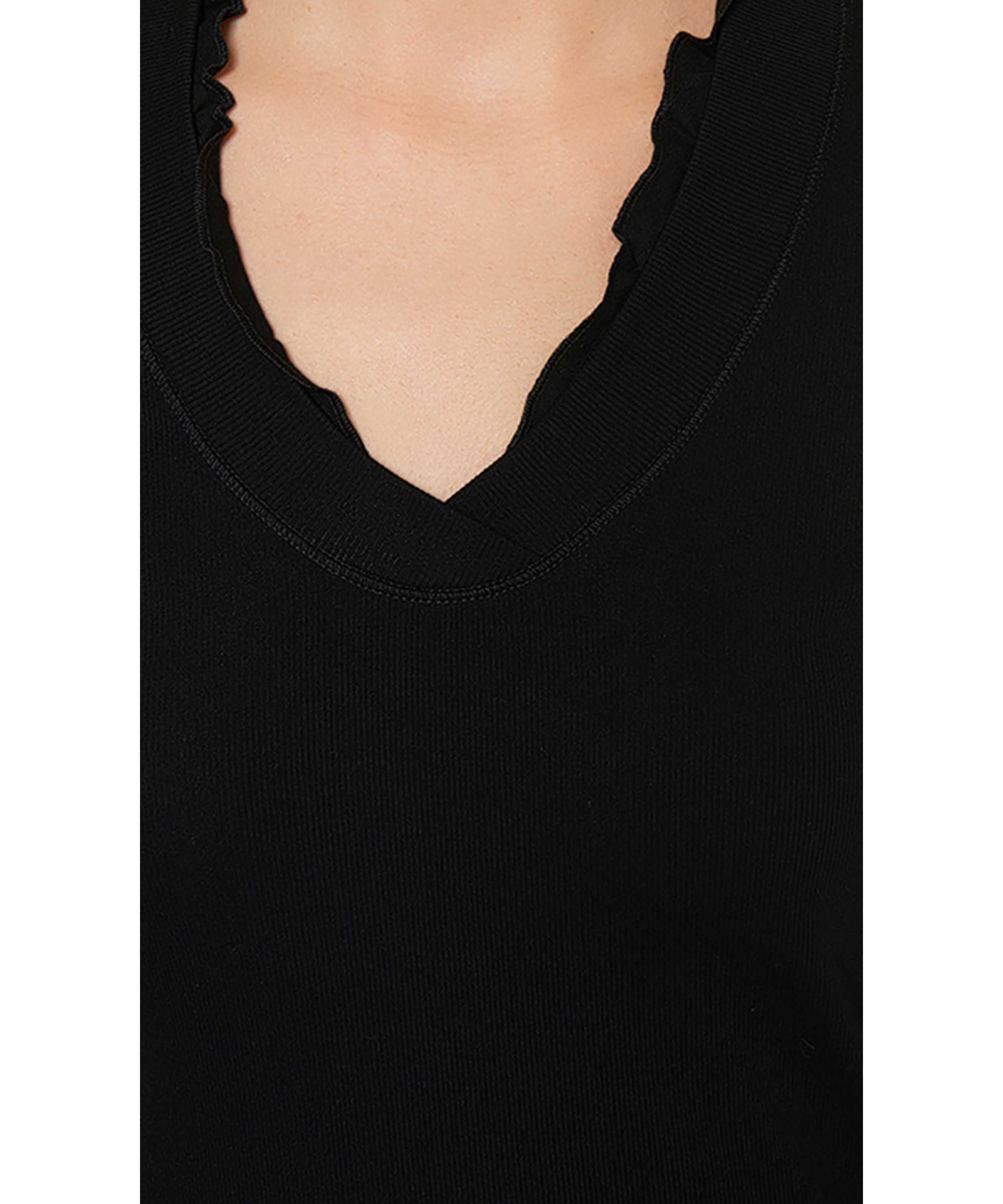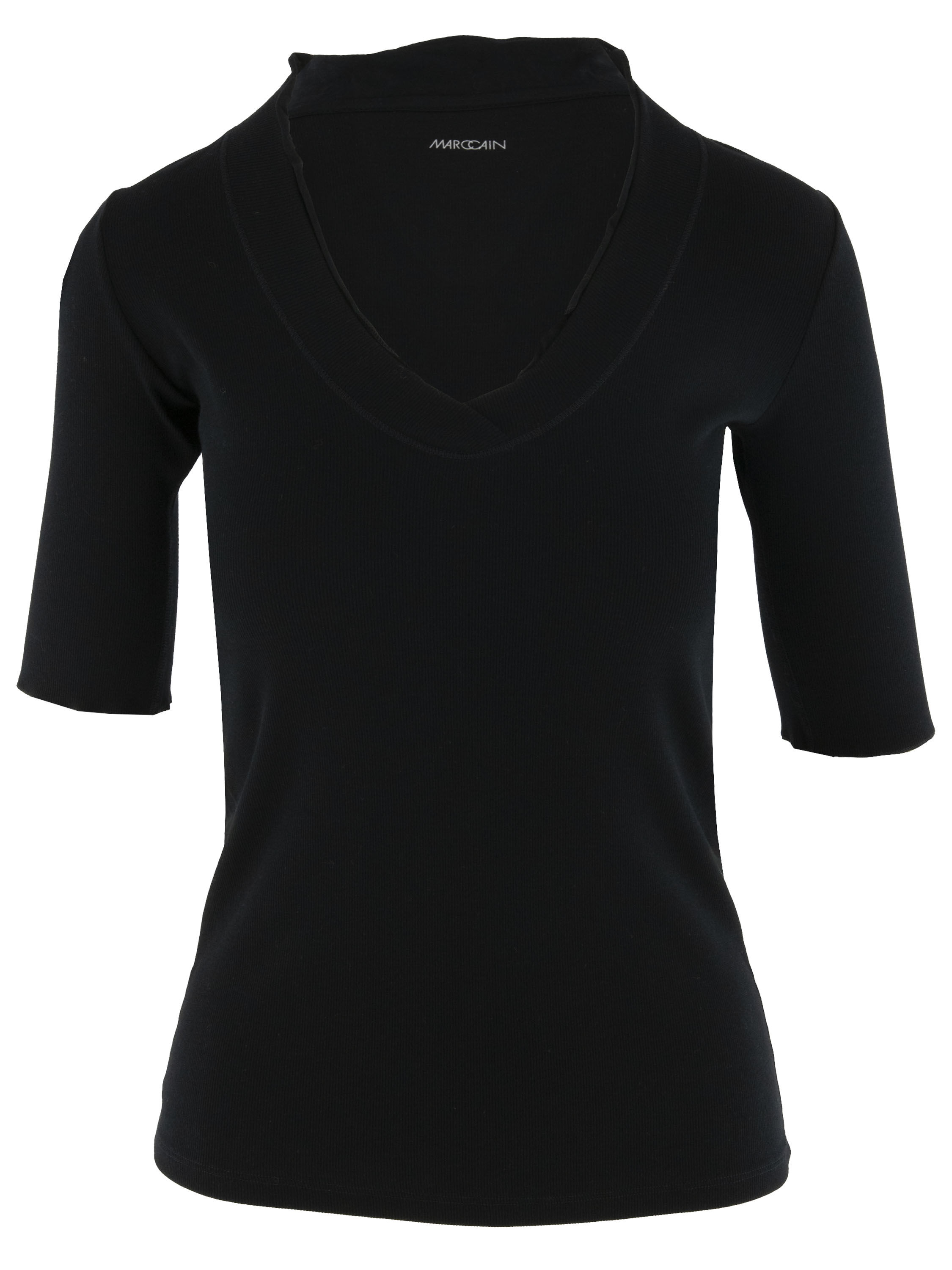 Tee-shirt légèrement cintré, de la marque Marc Cain essentiels, couleur noire. Le tissu est finement nervuré. Ce Tee-shirt est doté d'un col en V à effet superposé avec un empiècement à ruché volanté décoratif. Les manches courtes sont à ourlet roulotté. Lavage à 30 degrés.