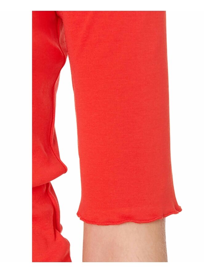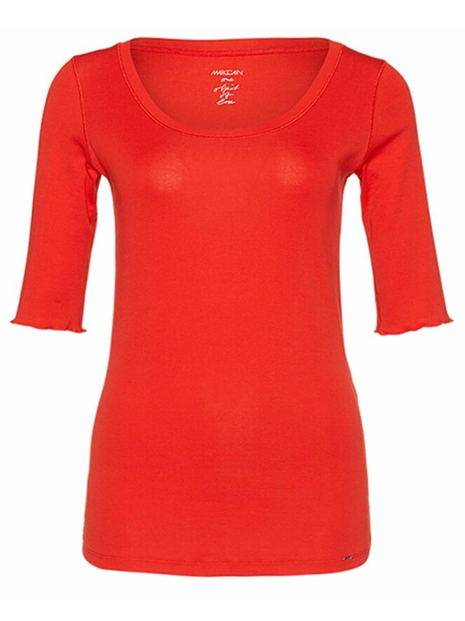 Tee-shirt basique de la marque Marc Cain, de couleur rouge. Il présente des manches mi-longues aux bords légèrement voletant et à col rond. Lavage à 30 degrés.