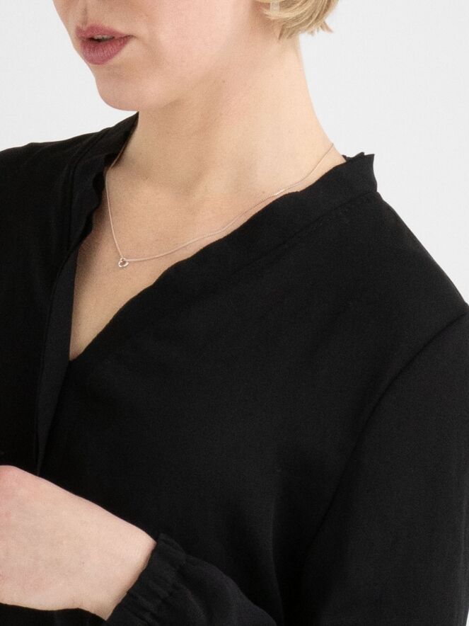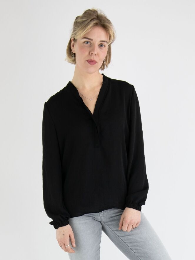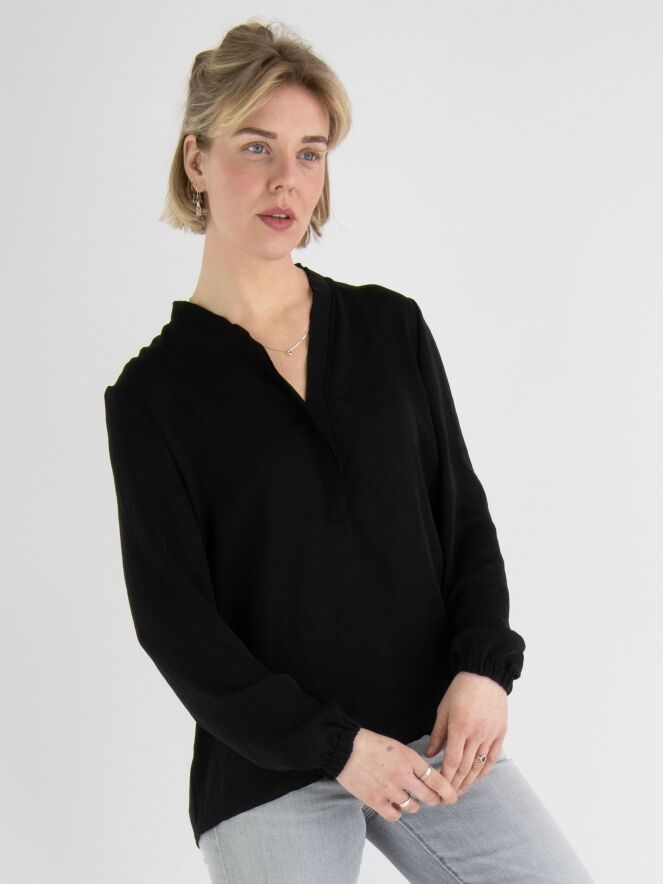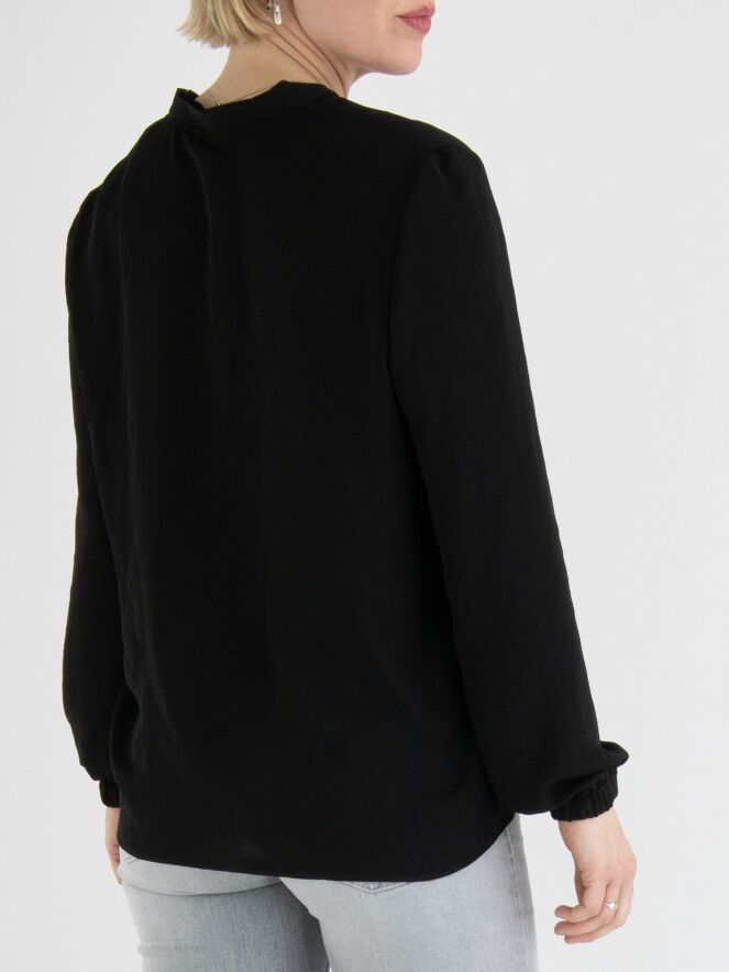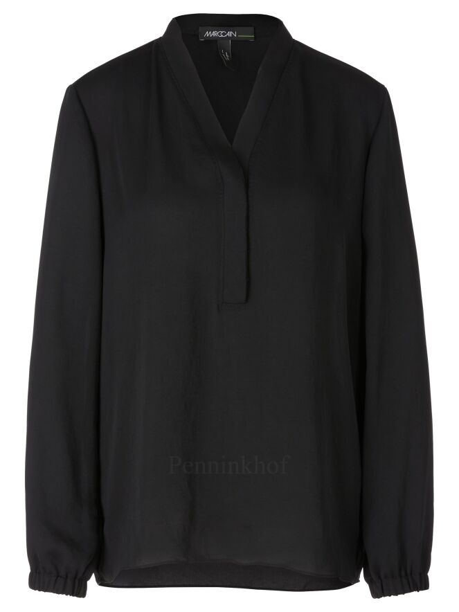 Chemise ample de la marque Marc Cain, de couleur noire. L'encolure en V est à double bordure en tissu avec couture décorative surpiquée. Les poignets sont resserrés par un élastique provoquant des plis. Lavage à 30 degrés.