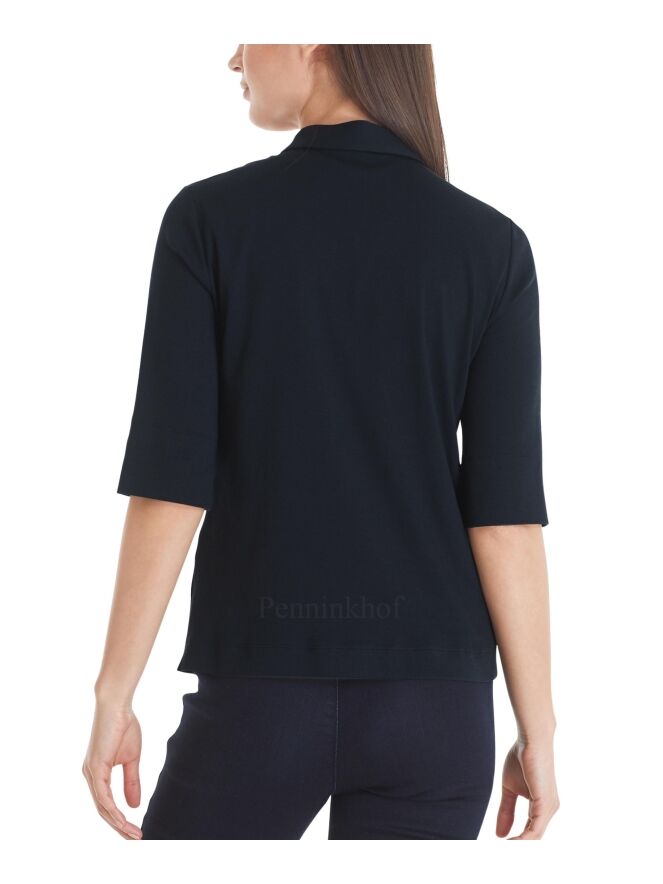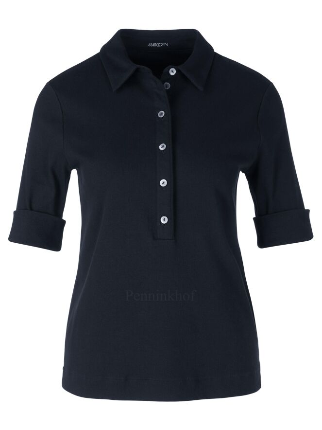 Polo de la marque Marc Cain, de couleur bleu marine. La chemise présente des manches mi-longues à retrousser et une longue patte de boutonnage à boutons brillants. Lavage à 30 degrés.