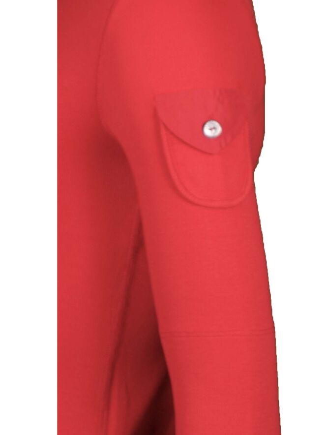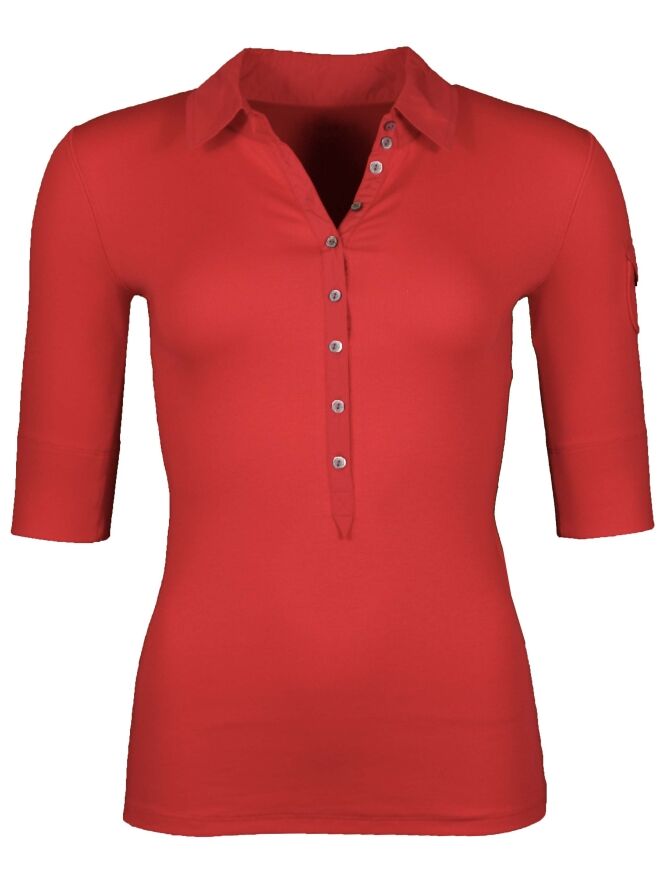 Polo de coupe décontractée, de la marque Marc Cain, couleur rouge. La patte de boutonnage en polyester brillant descend jusqu'à mi-hauteur. Ses manches sont mi-longues, avec une petite poche à revers boutonné sur celle de gauche. Le coton est finement nervuré et la teneur en élasthanne lui assure un parfait confort. Lavage à 30 degrés.