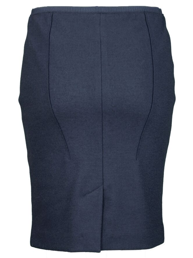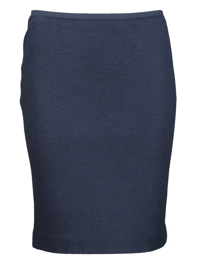Jupe en fine laine vierge et cachemire, de la marque Marc Cain, de couleur bleu marine. Elle descend au-dessus du genou. La jupe est doublée et dotée d\'une petite fente d\'aisance au milieu du dos. La ceinture élastique de 3 cm à la taille assure un grand confort et une coupe irréprochable. Lavage déconseillé.