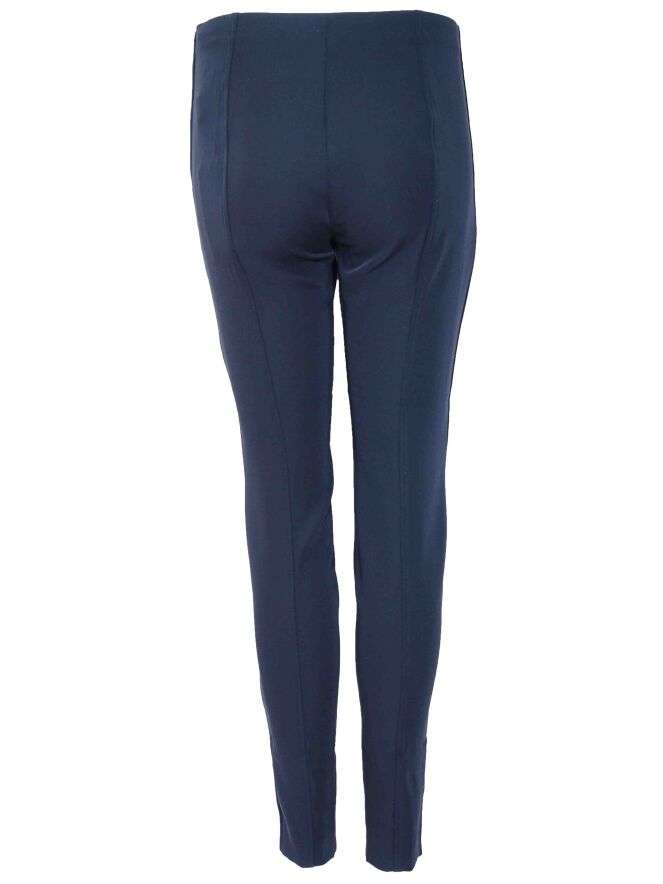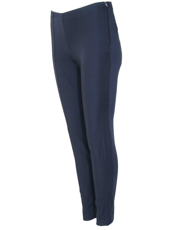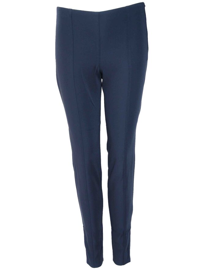 Pantalon basique de la marque Marc Cain, de couleur bleu marine. Le pantalon est doté d'une bande élastique de 3 cm à la taille et d'une ligne de couture au milieu des jambes, à l'avant et à l'arrière. Lavage à 30 degrés.
