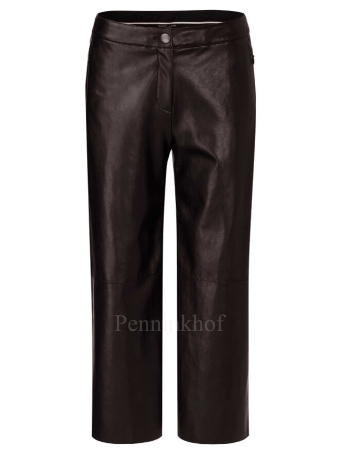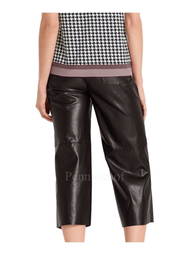Pantalon court à revers en similicuir de la marque Marc Cain, de couleur marron moka. Les jambes sont coupées à bord cru. Les poches latérales sont équipées d'un zip de fermeture. Le pantalon est orné d'une couture horizontale au niveau du genou. Lavage à 30 degrés.