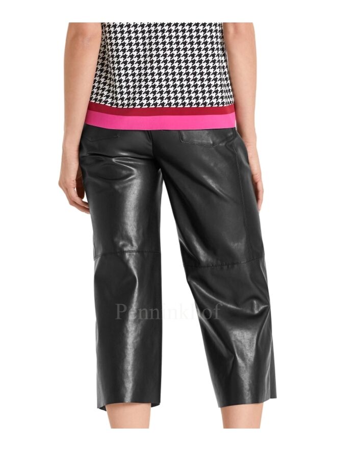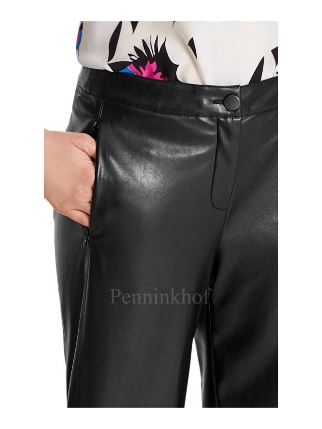 Pantalon court à revers en similicuir de la marque Marc Cain, de couleur noir. Les jambes sont coupées à bord cru. Les poches latérales sont équipées d'un zip de fermeture. Le pantalon est orné d'une couture horizontale au niveau du genou. Lavage à 30 degrés.