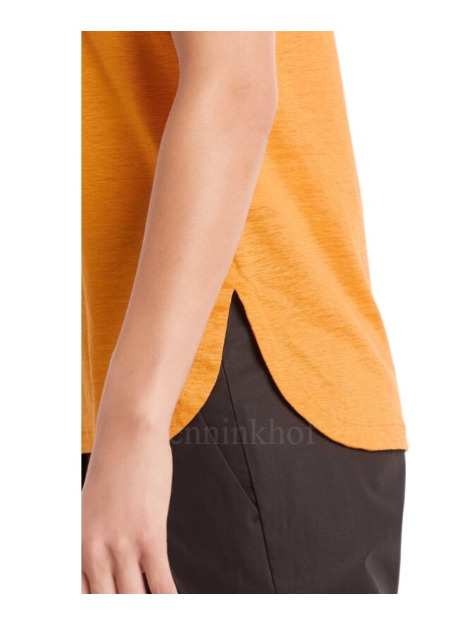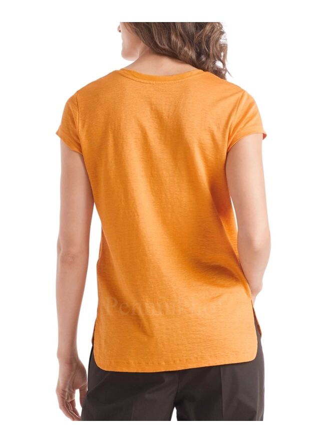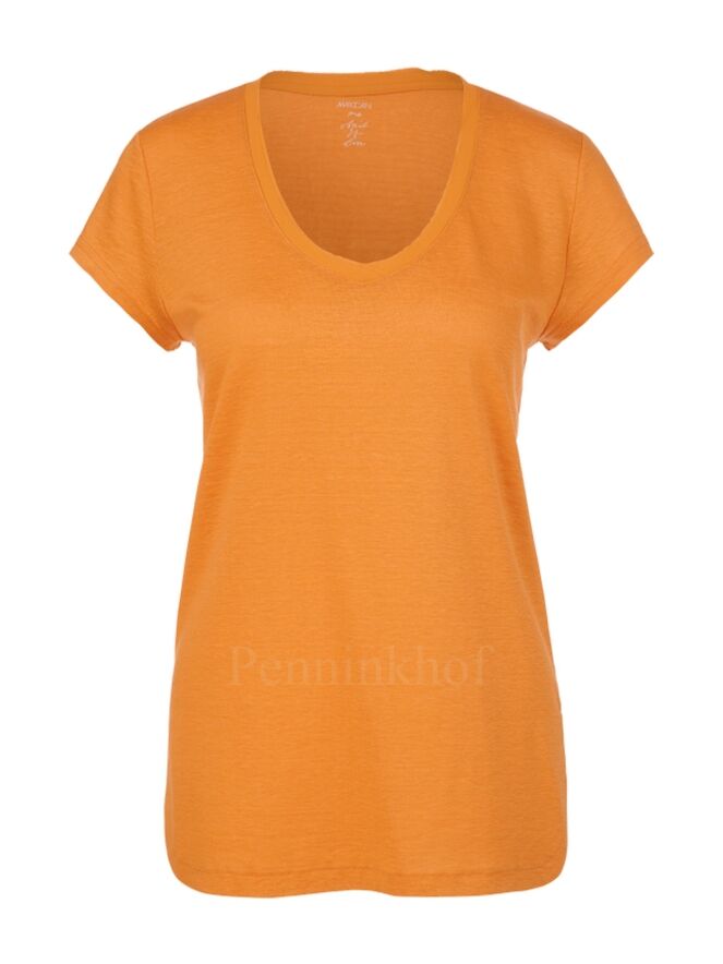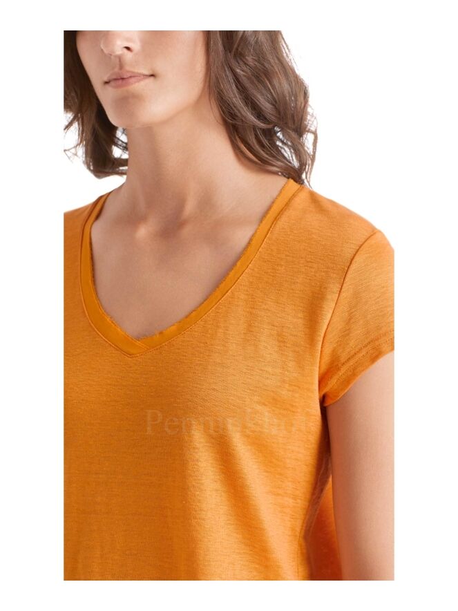 Tee-shirt à la coupe droite à manches courtes, de la marque Marc Cain, de couleur jaune. L'encolure en V est ornée d'un double tissu transparent. L'ourlet du bas est arrondi autour des fentes latérales. Lavage à 30 degrés.