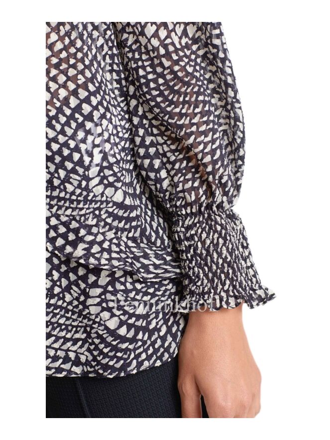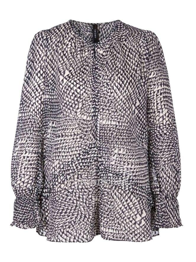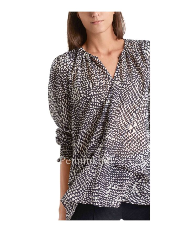 Chemisier en voile à la coupe large et aérienne de la marque Marc Cain, à motif graphique noir et blanc. Le chemisier présente un col en V. Les extrémités des manches sont dotées d'un large élastique à fronces augmentant le blousant de la manche. Le tissu présente de multiples coutures diagonales avec des passepoils en voile. Lavage à 30 degrés.
