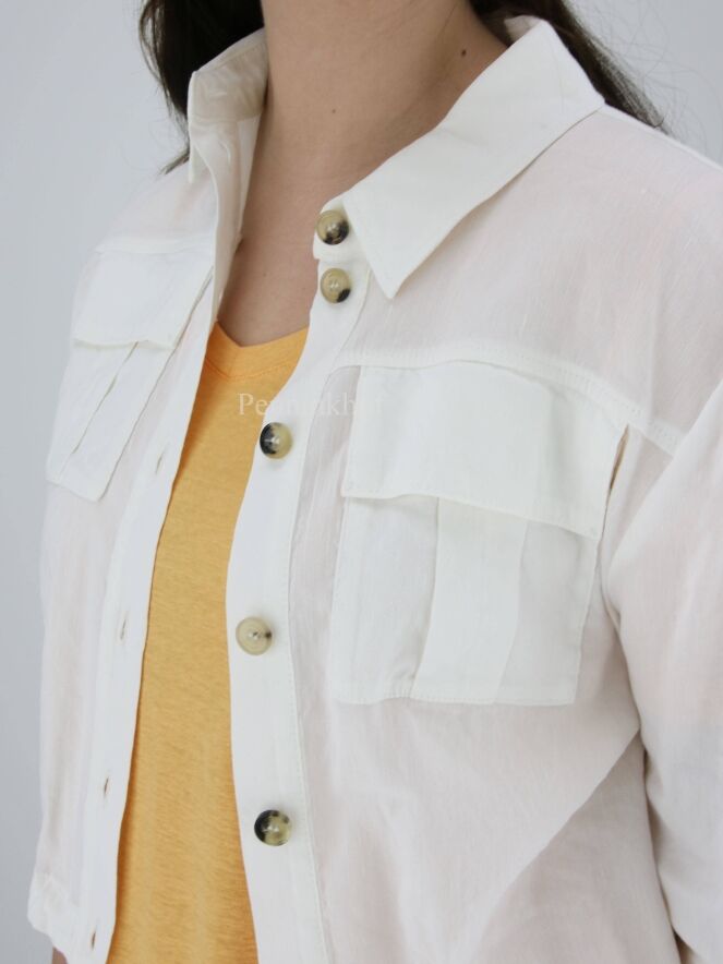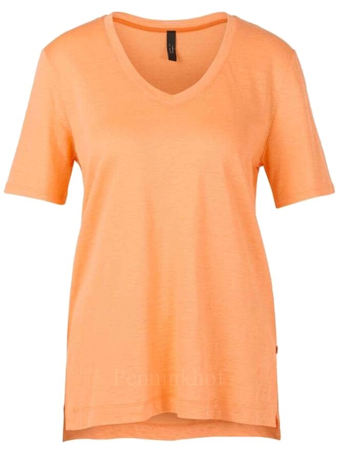 T-shirt à matières mélangées de la marque Marc Cain, de couleur mandarine. Col en V arrondi à manches courtes. La base est pourvue de courtes fentes latérales élégamment surpiquées. Lavage à 30 degrés.