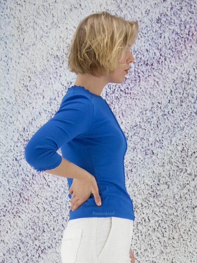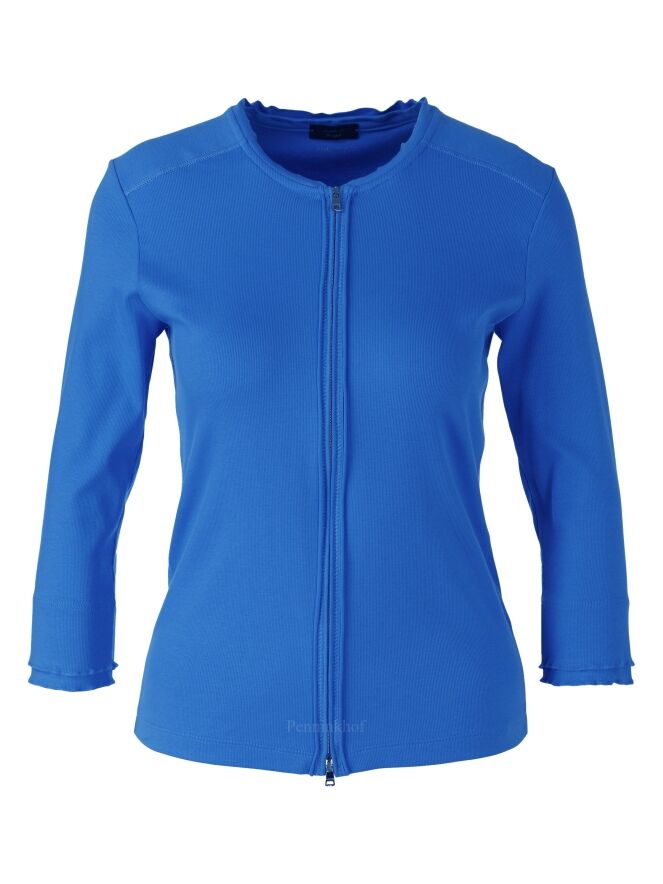 Cardigan de la marque Marc Cain, de couleur bleue. Le cardigan présente des manches trois-quart qui se finissent pas un double tissu légèrement ondulé. L'encolure ronde s'ouvre sur une fermeture Eclair à double curseur bordée d'une bande en relief lègèrement ondulé. Lavage à 30 degrés.
