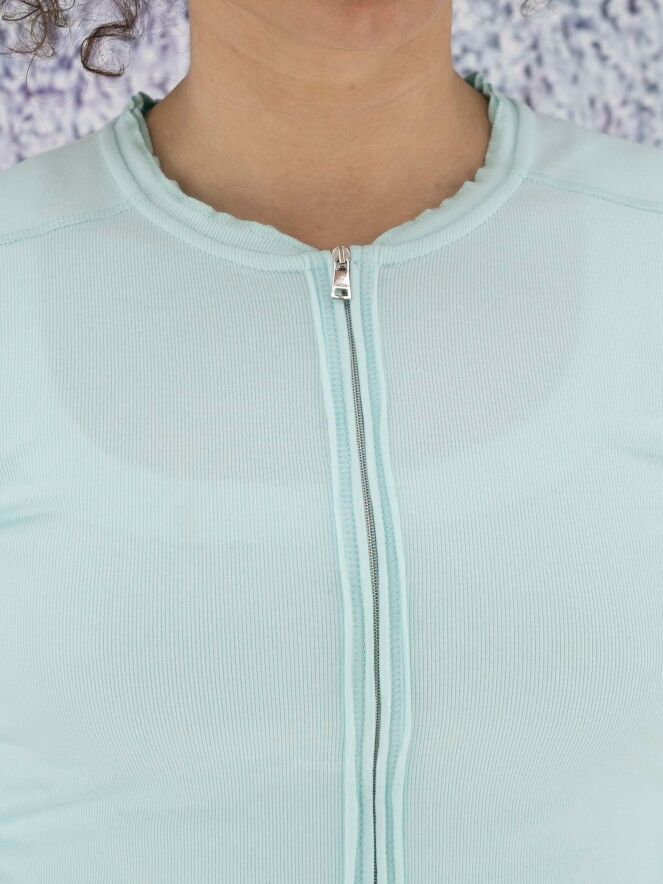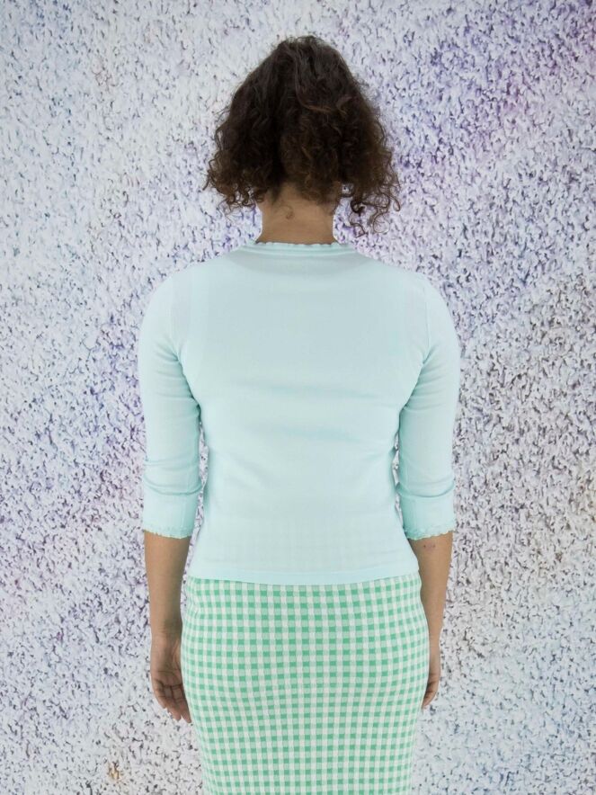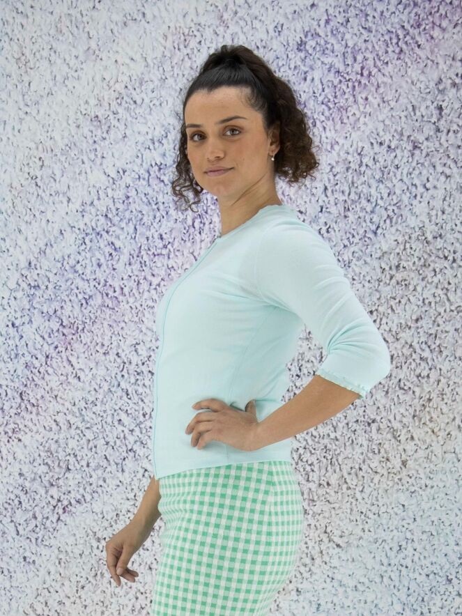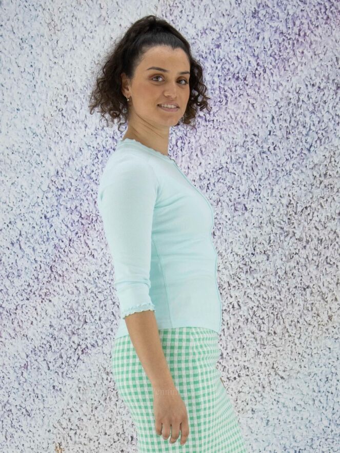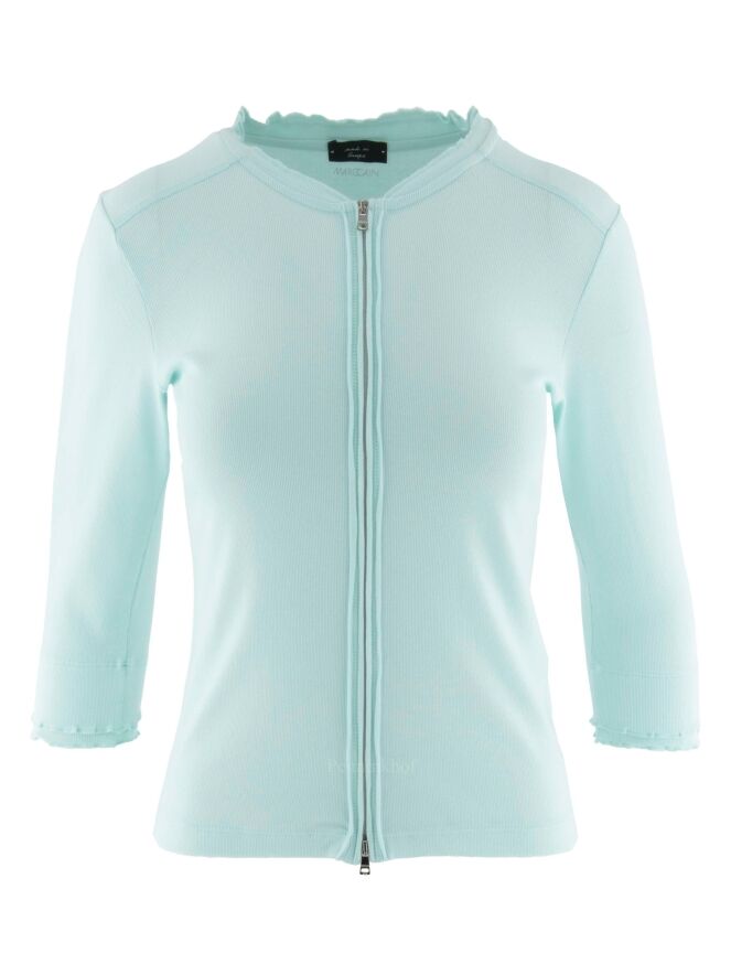 Cardigan de la marque Marc Cain, de couleur vert menthe. Le cardigan présente des manches trois-quart qui se finissent pas un double tissu légèrement ondulé. L'encolure ronde s'ouvre sur une fermeture Eclair à double curseur bordée d'une bande en relief lègèrement ondulé. Lavage à 30 degrés.