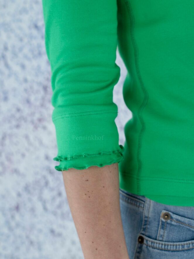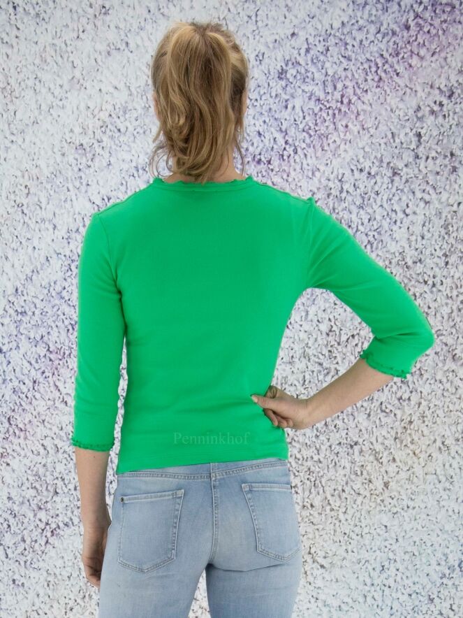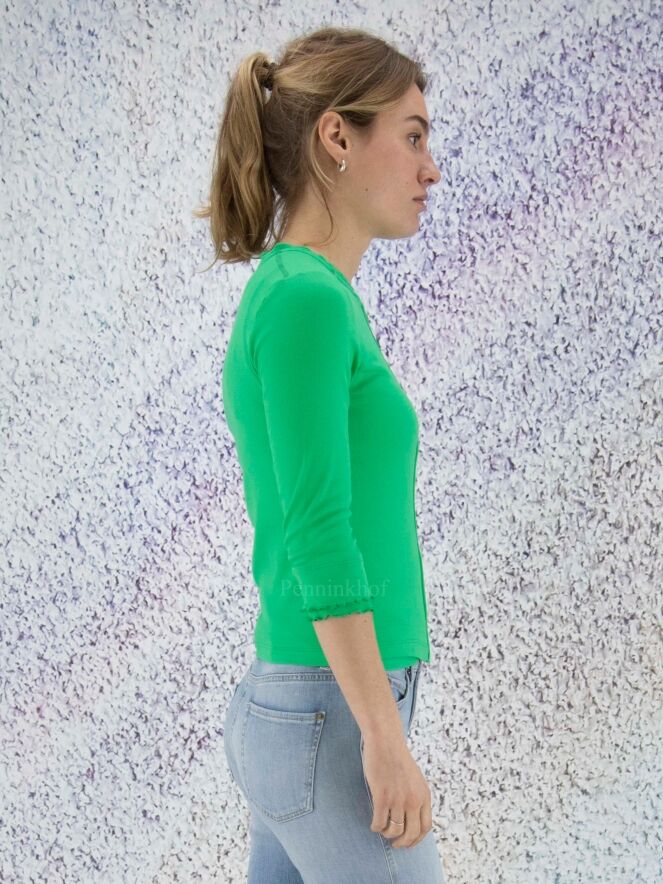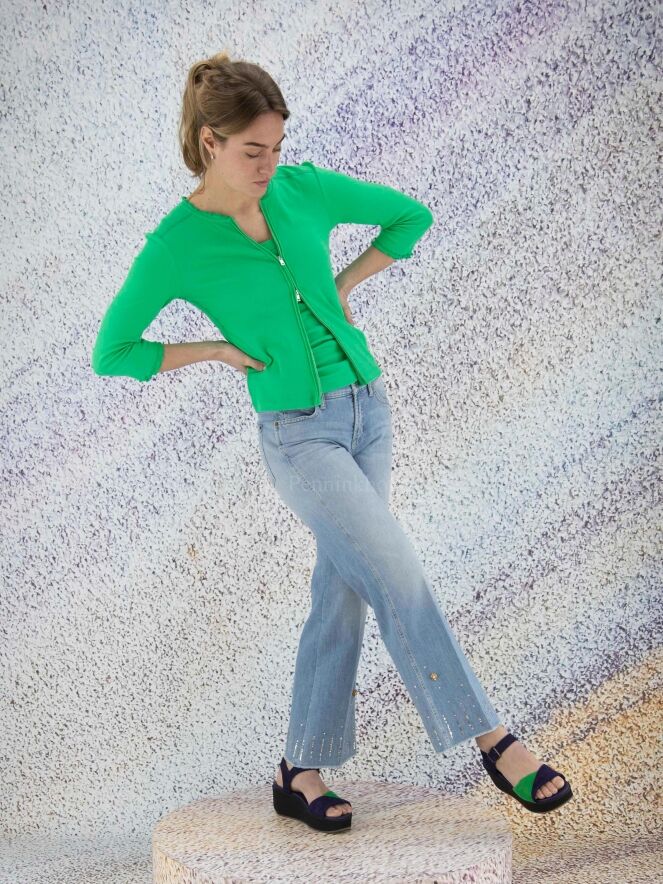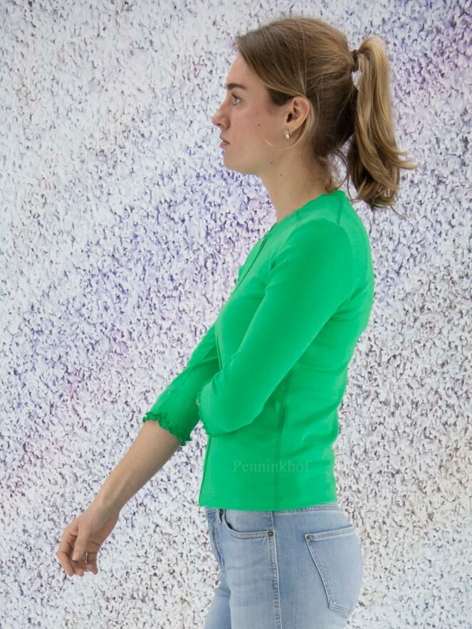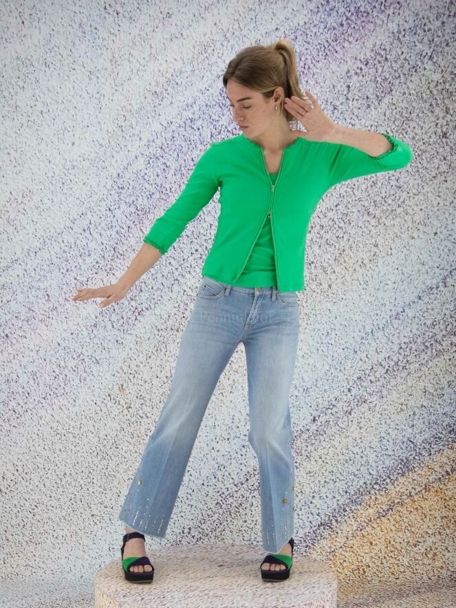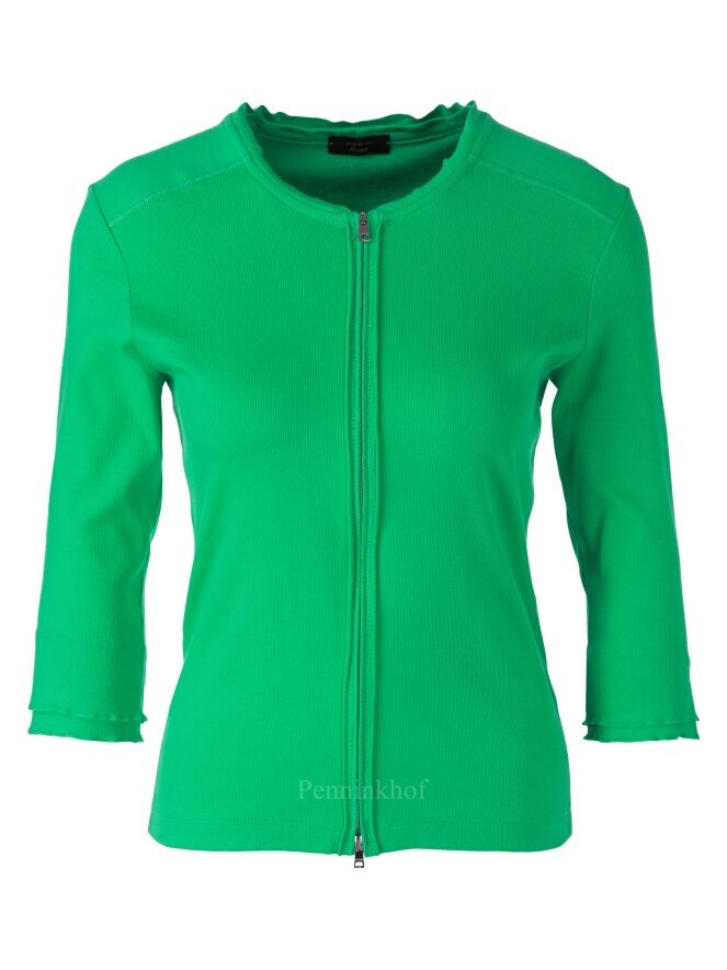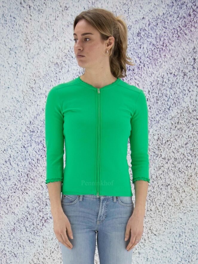 Cardigan de la marque Marc Cain, de couleur verte. Le cardigan présente des manches trois-quart qui se finissent pas un double tissu légèrement ondulé. L'encolure ronde s'ouvre sur une fermeture Eclair à double curseur bordée d'une bande en relief lègèrement ondulée. Lavage à 30 degrés.
